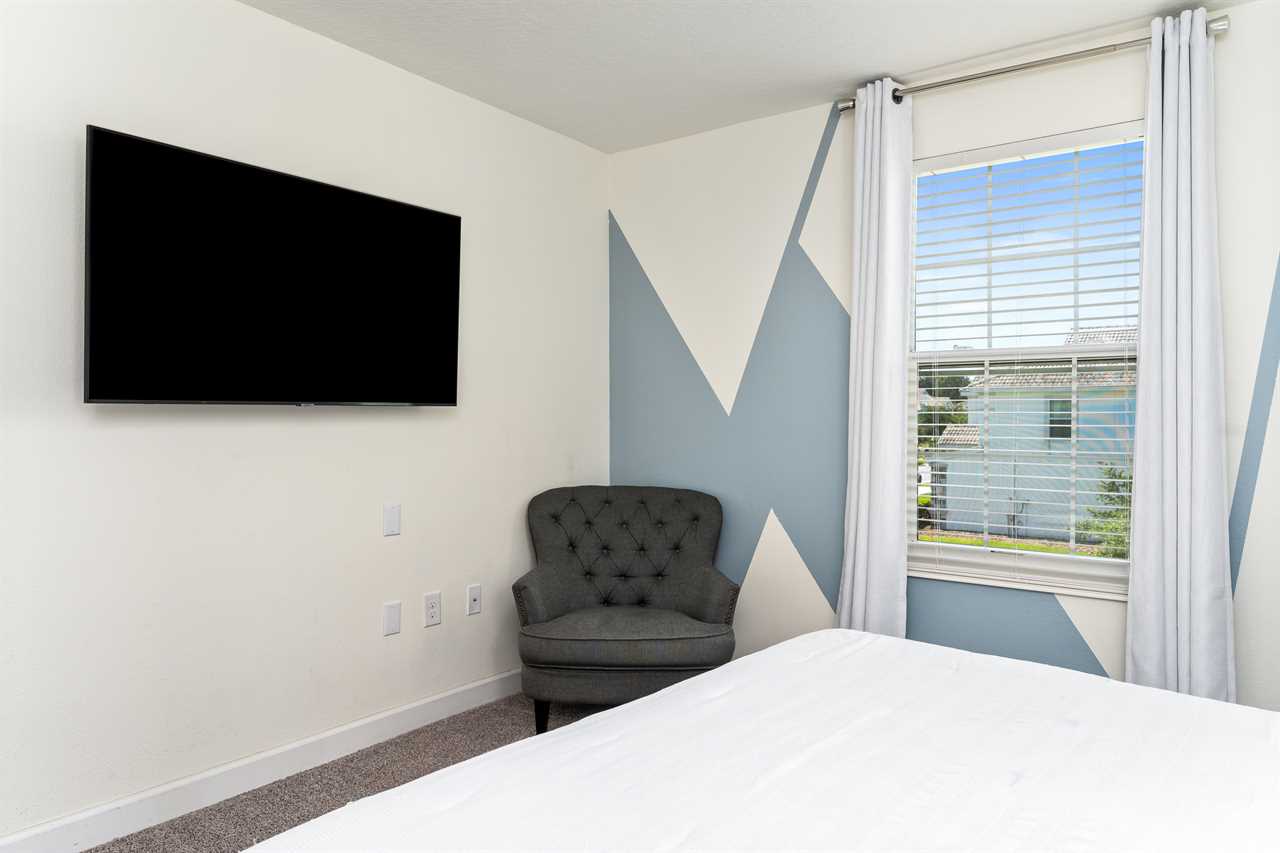 Just beyond the theater, guests will enjoy the large bedroom that includes three queen size beds, and custom murals of some of our famous local friends! This bedroom also has a 55-inch wall-mounted, smart TV and wall-controlled ceiling fan for additional comfort. The front corner king bedroom offers guests, a 55-inch smart TV, an additional chair as well as a wall-controlled ceiling fan.