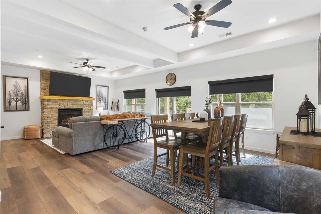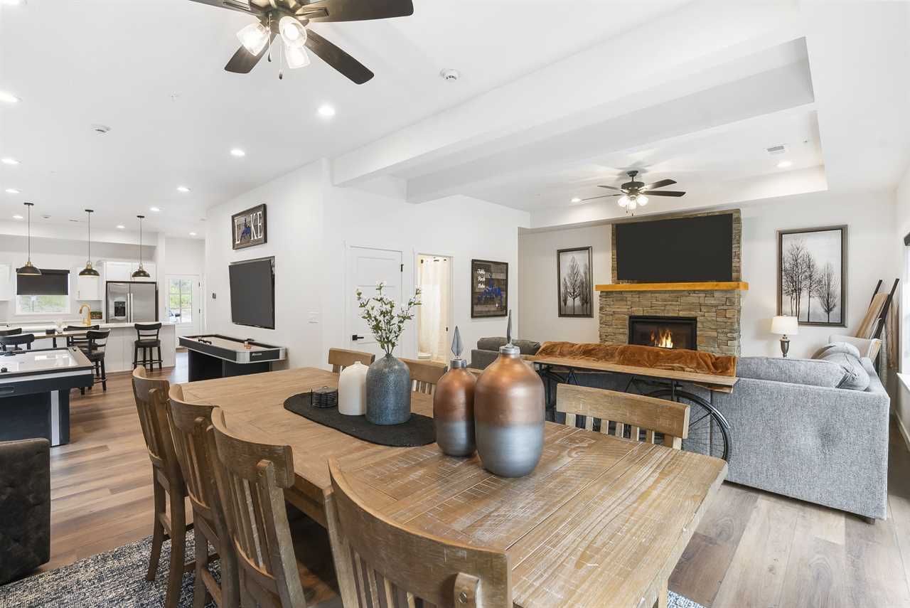 ✦ ✦ Living room with fireplace, game tables, and open-concept design
