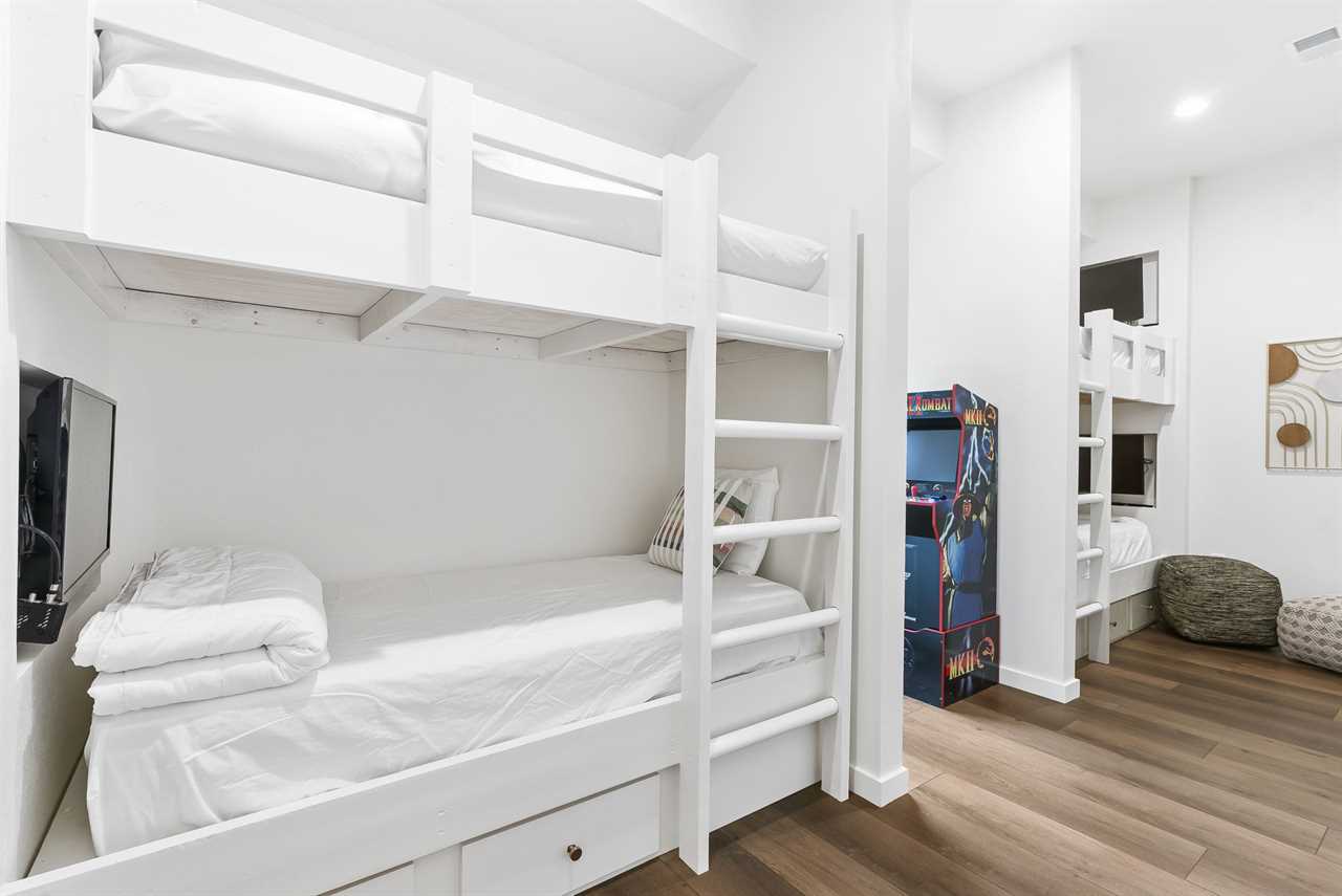 ✦ ✦ Bedroom 6 (Upper Level) – Bunk room with two sets of twin bunks, each with individual TVs + hall bath