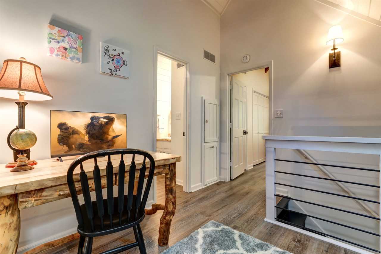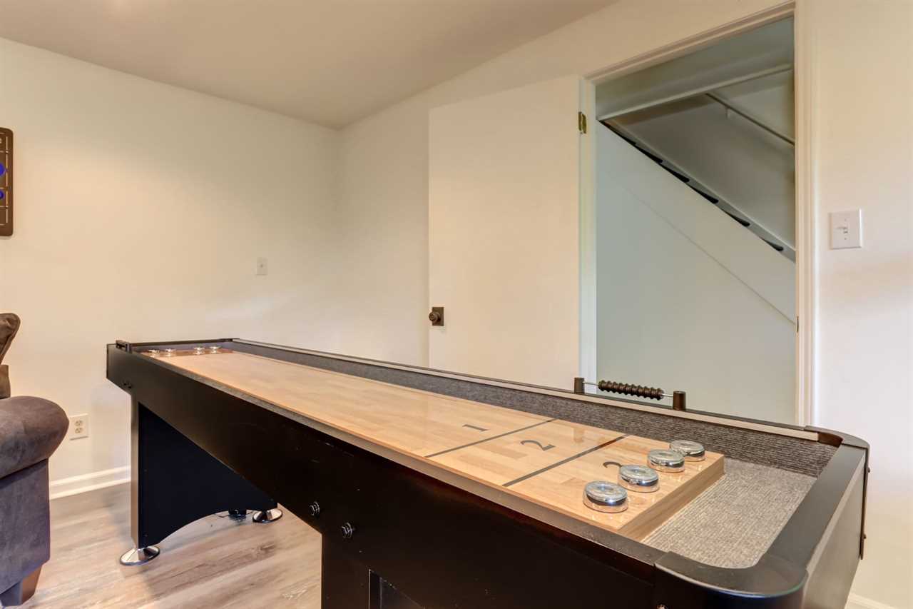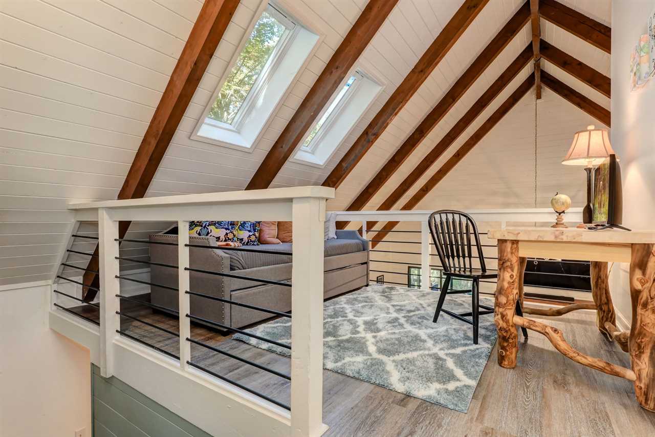 The flat, paved driveway makes arrivals easy, and the home has Wi-Fi, a fully equipped kitchen, a big screen TV and fireplace, a beautiful living room, a washer/dryer, and a loft with shuffleboard, board games, toys, and a big screen TV.