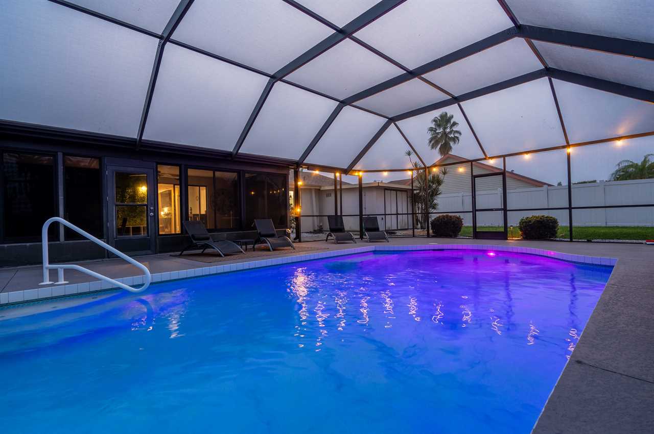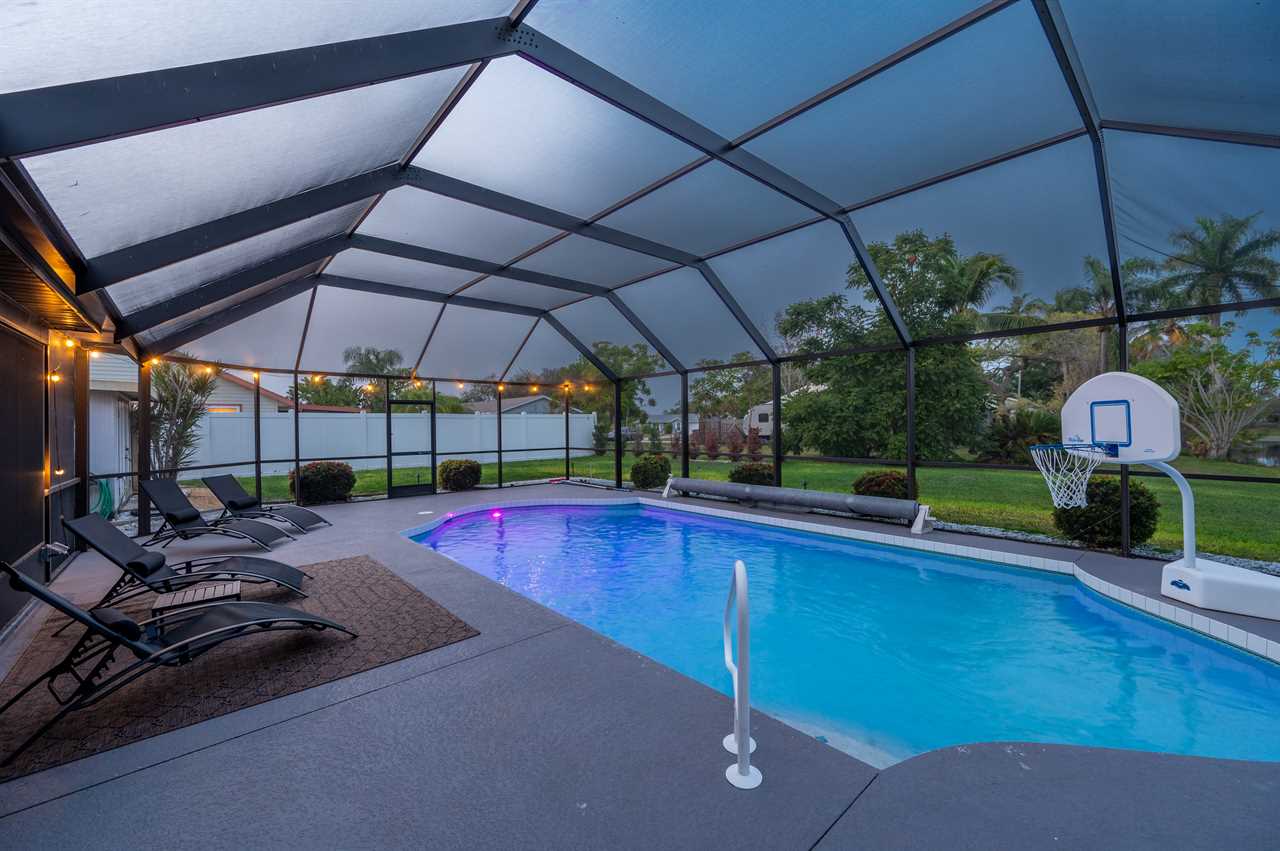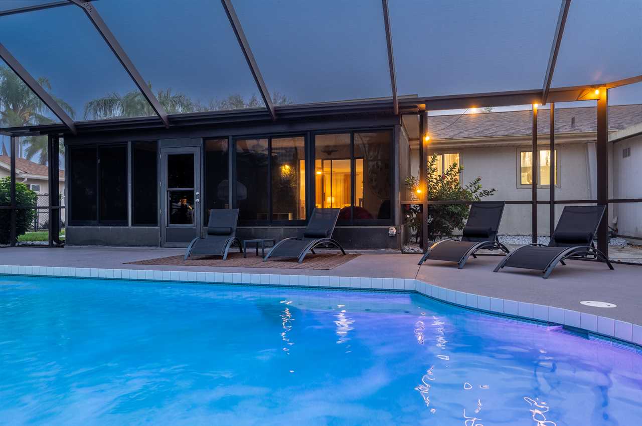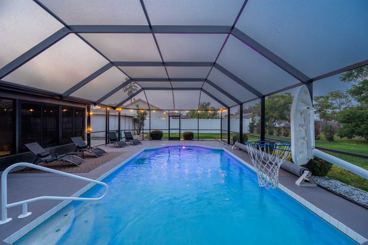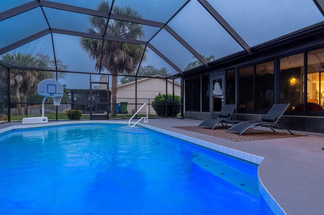 One of the highlights of this rental is the Florida room which sits just outside of the sliding glass door. This space offers plenty of exposure to the Florida air without the inconvenience of fickle weather. Step outside to the pool deck and immerse yourself in the refreshing waters of the fully screened-in pool, soak up the Florida sunshine on the poolside loungers or have fun shooting hoops in the summer. You will not believe the levels of serotonin you experience kicking back with the view of the pond just behind the home.