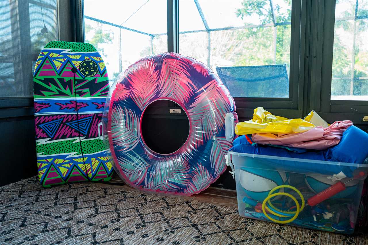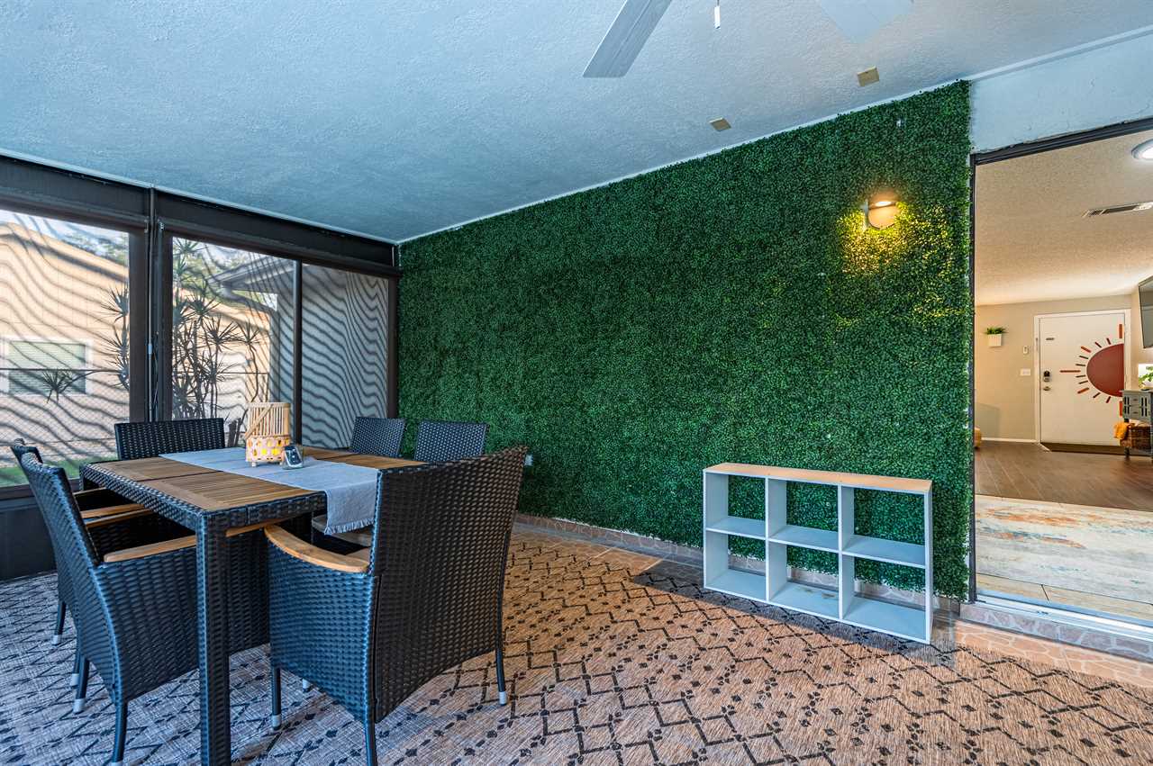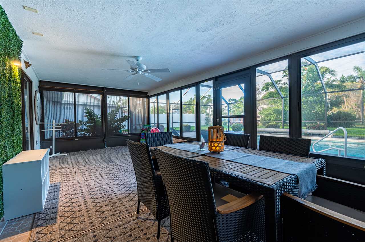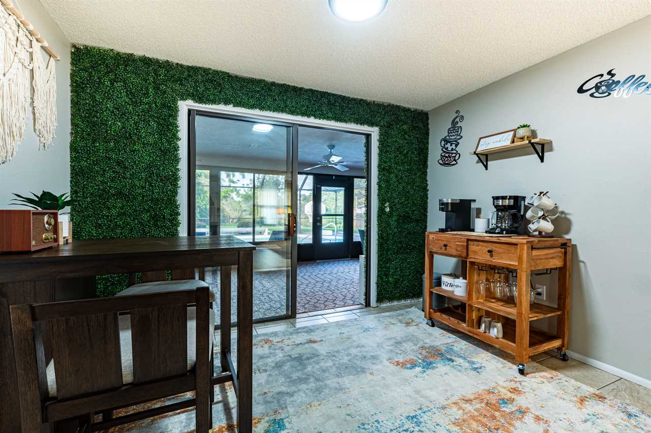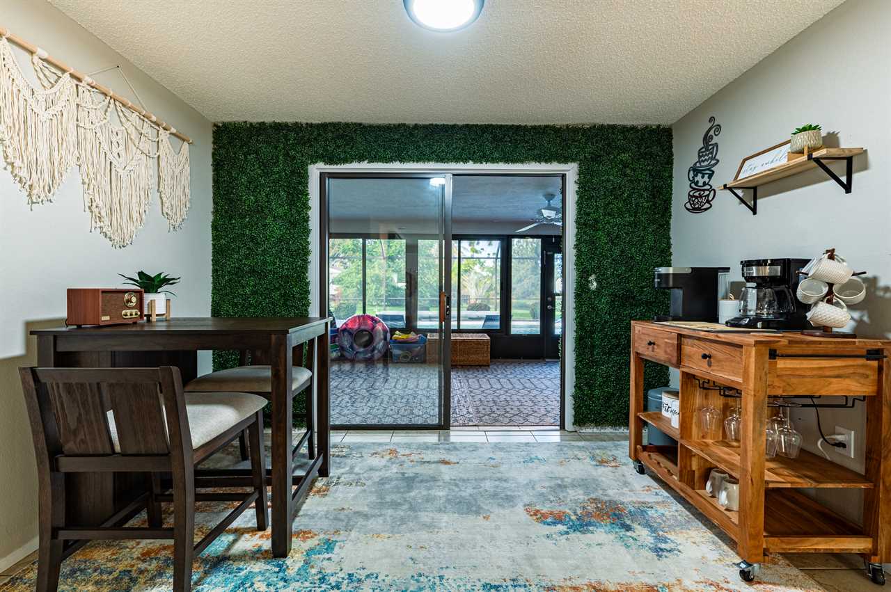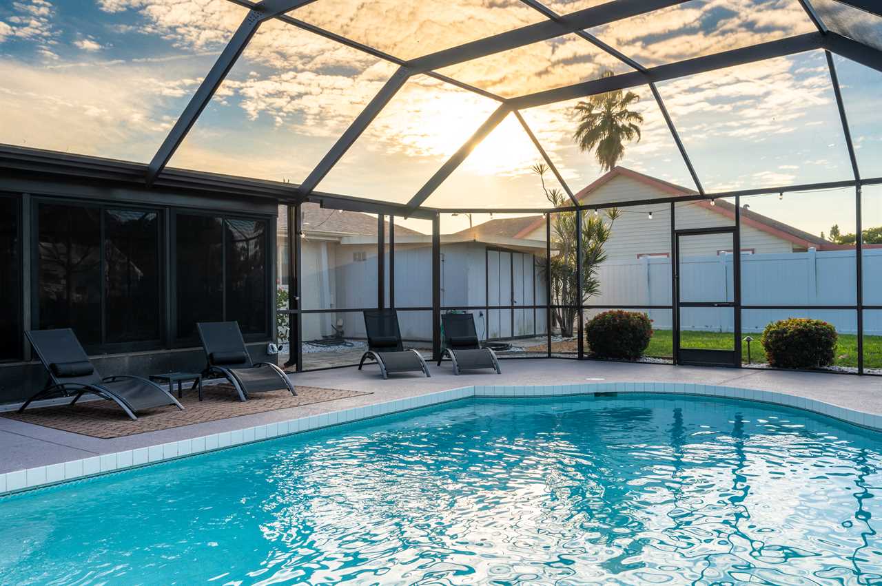 One of the highlights of this rental is the Florida room which sits just outside of the sliding glass door. This space offers plenty of exposure to the Florida air without the inconvenience of fickle weather. Step outside to the pool deck and immerse yourself in the refreshing waters of the fully screened-in pool, soak up the Florida sunshine on the poolside loungers or have fun shooting hoops in the summer. You will not believe the levels of serotonin you experience kicking back with the view of the pond just behind the home.