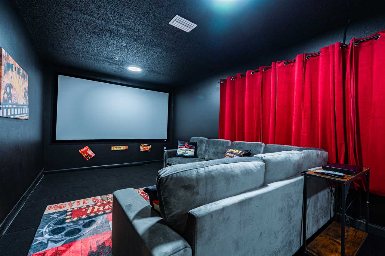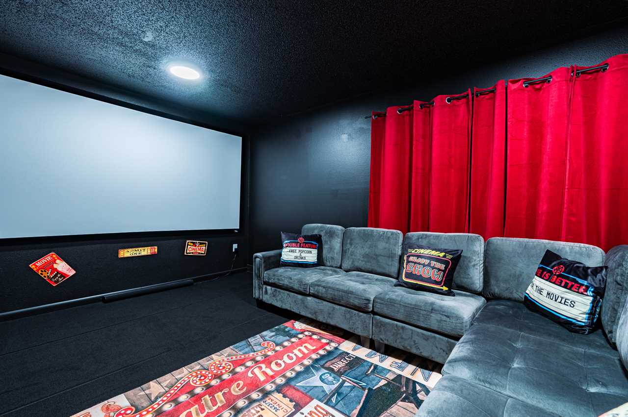 Through the kitchen, you will find the hidden gem of the property, the “Cinema Corner.” This room has been repurposed into a cinema-style theater room where you can watch your favorite movies or shows on the big screen, all from the comfort of the plush, L-shaped sofa!