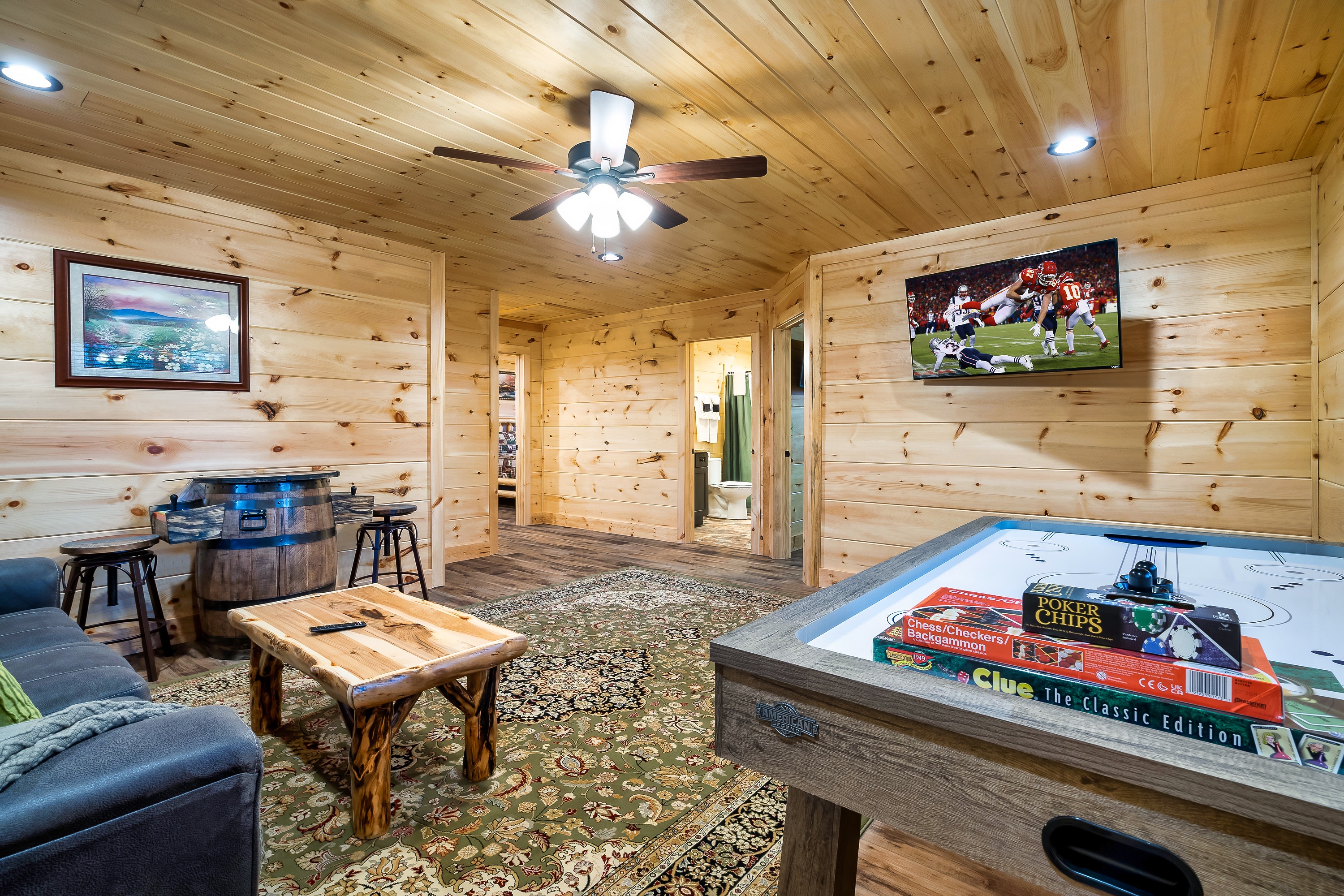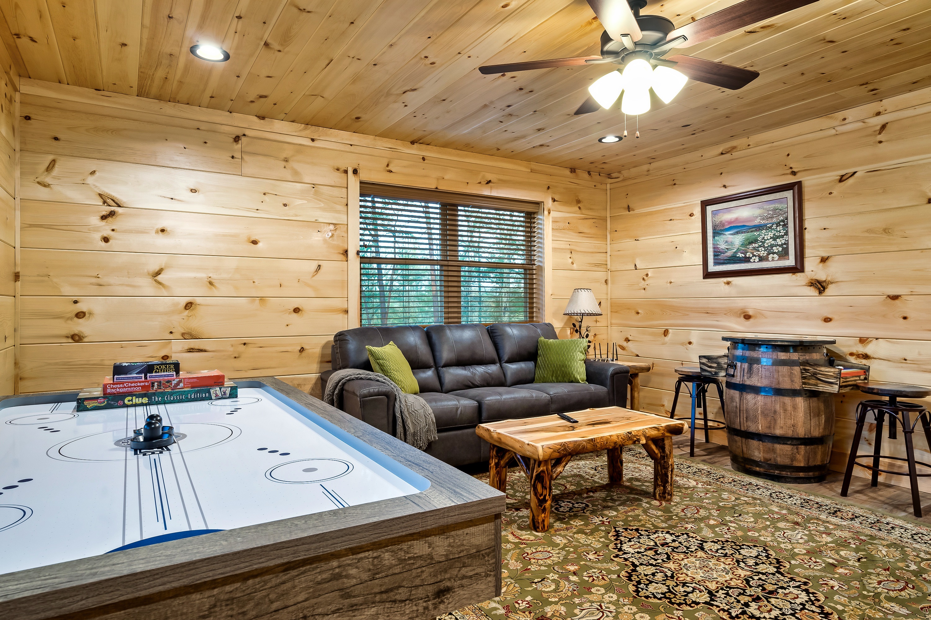 Silver Bear is a large, private cabin on 1.5 acres: no neighbors, no noise, just your family and friends. Kids take over the arcade and air hockey upstairs while adults soak in the hot tub or relax in front of the fireplace. End the night around the stone fire pit. Built in 2022 with granite countertops and king beds, this is the cabin everyone wishes they'd booked.
