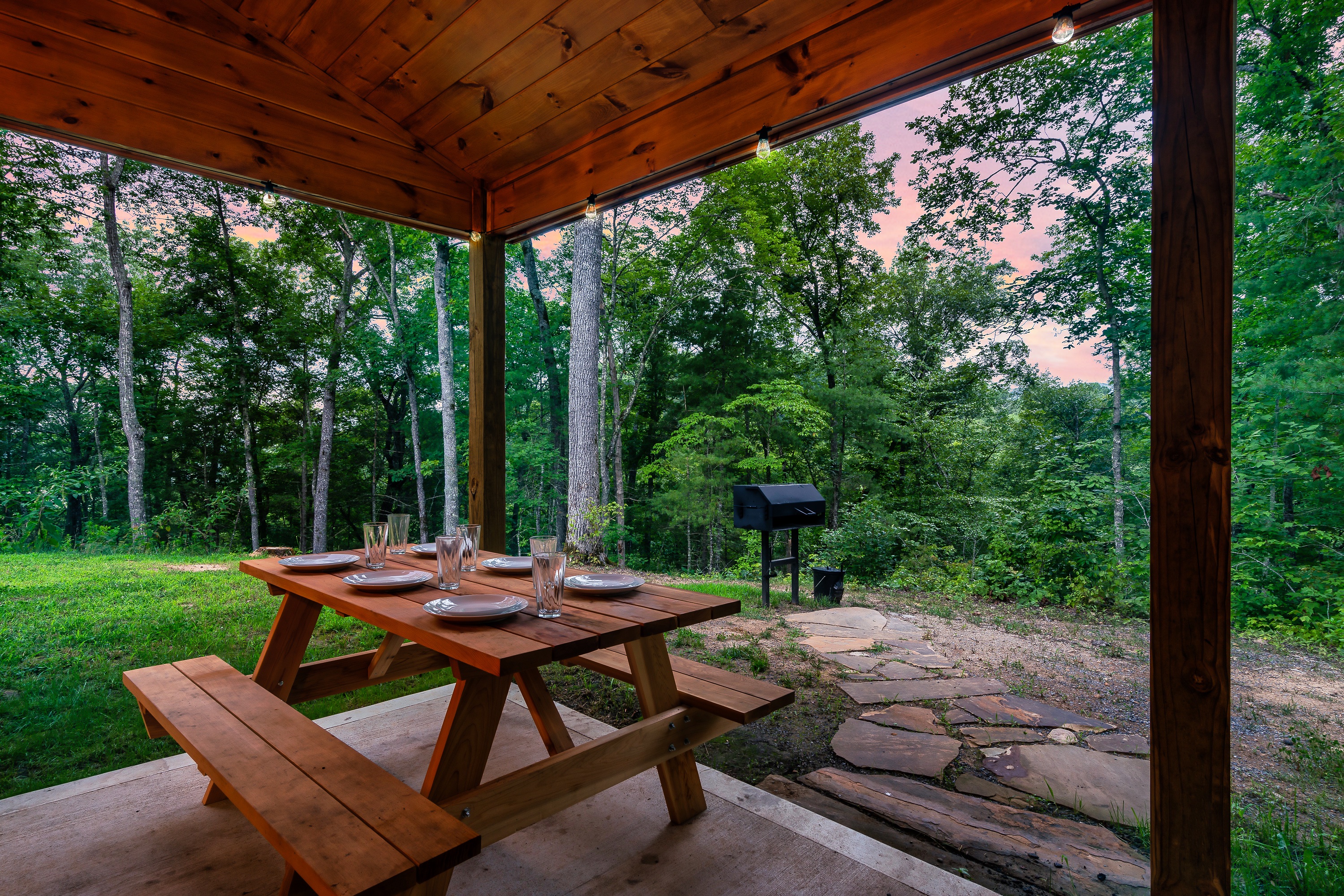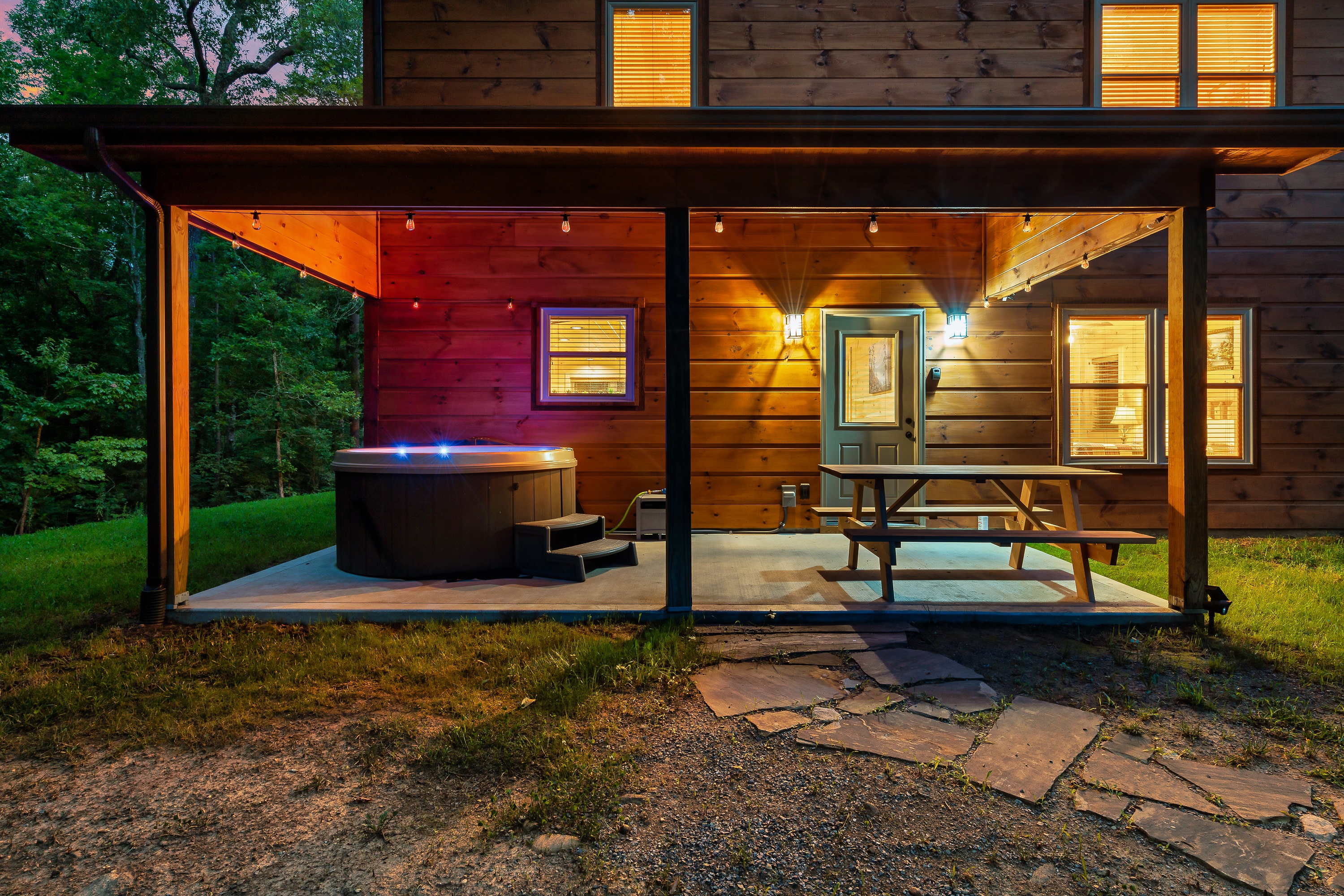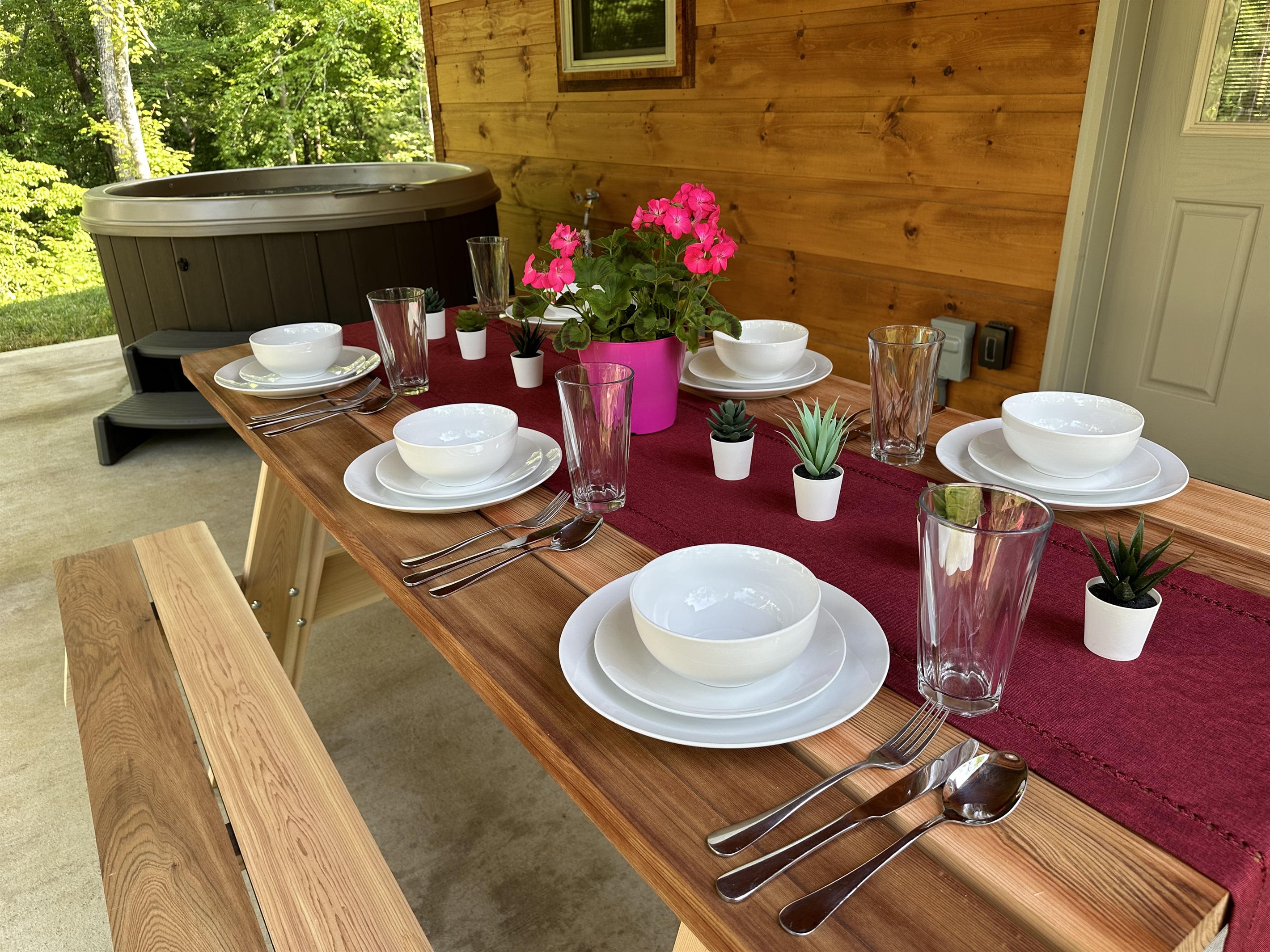 • Covered back patio: hot tub, outdoor cedar dining table for your al fresco meals, and a wood swing