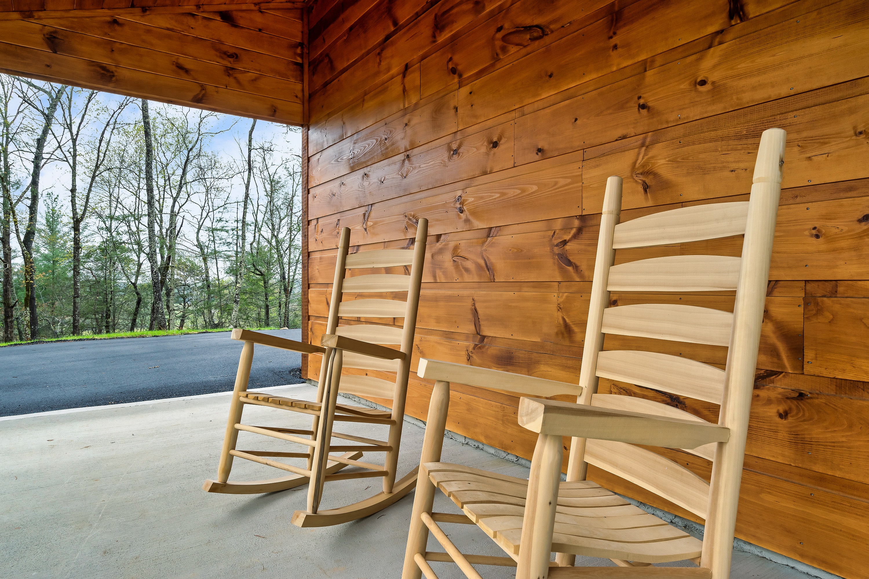 - Covered patio; rocking chairs on the porch