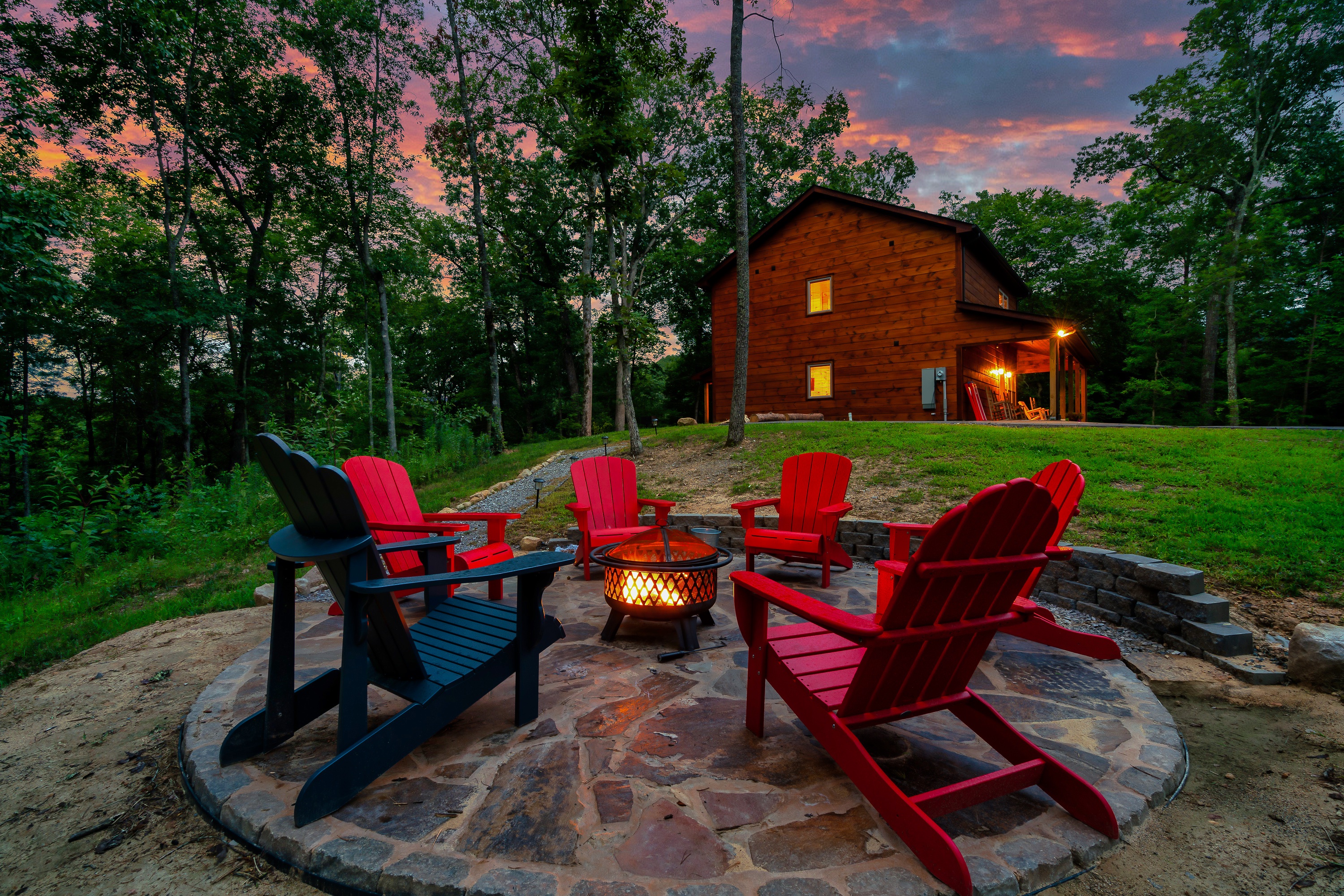 • Beautiful, handcrafted stone fire pit with Adirondack lounge chairs