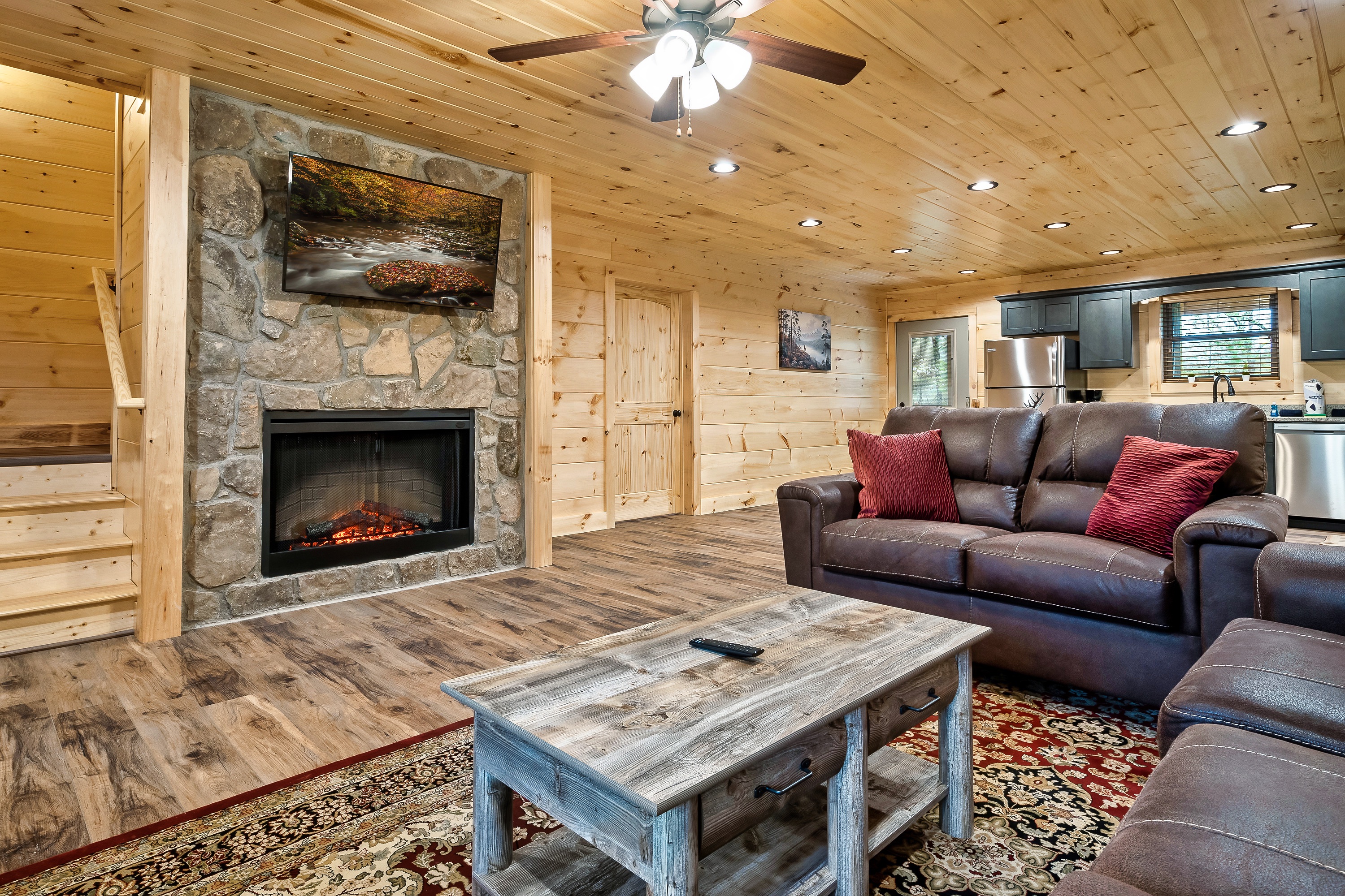 The living room has a big cozy feel with a stone fireplace and plenty of seating to relax after a day out.