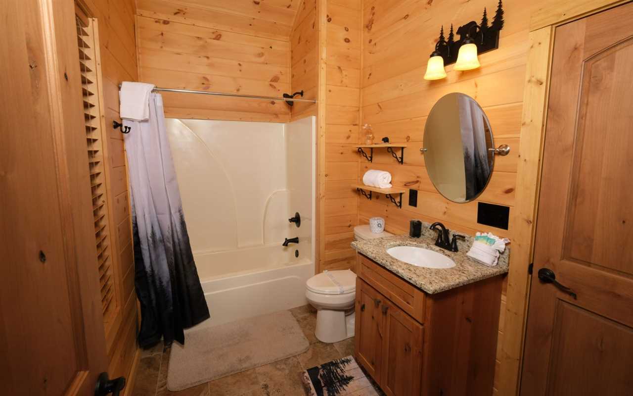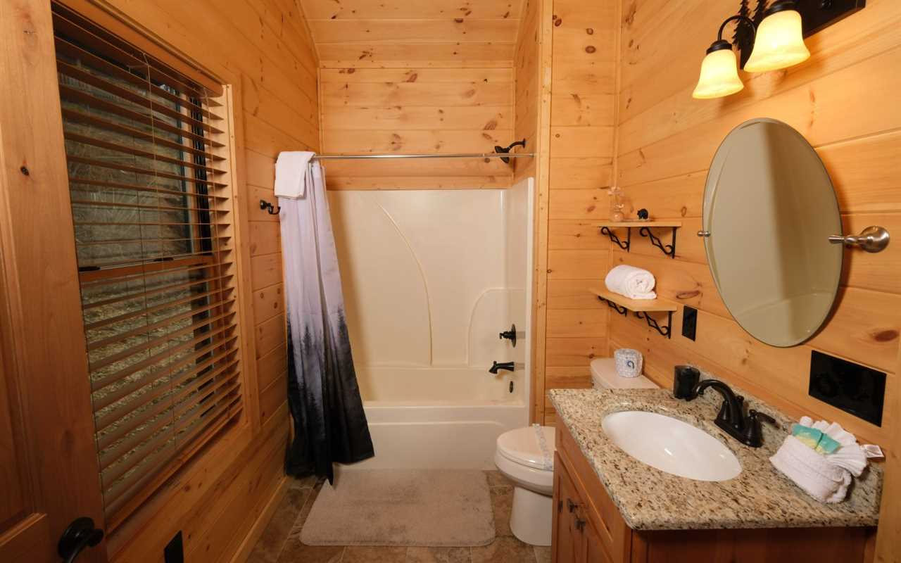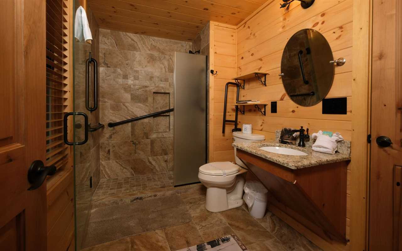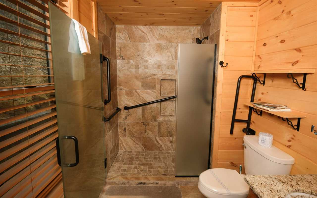 Both bathrooms are clean and functional, with features that support guests with mobility needs. The main level bath includes a walk-in shower with grab bars and an accessible sink.