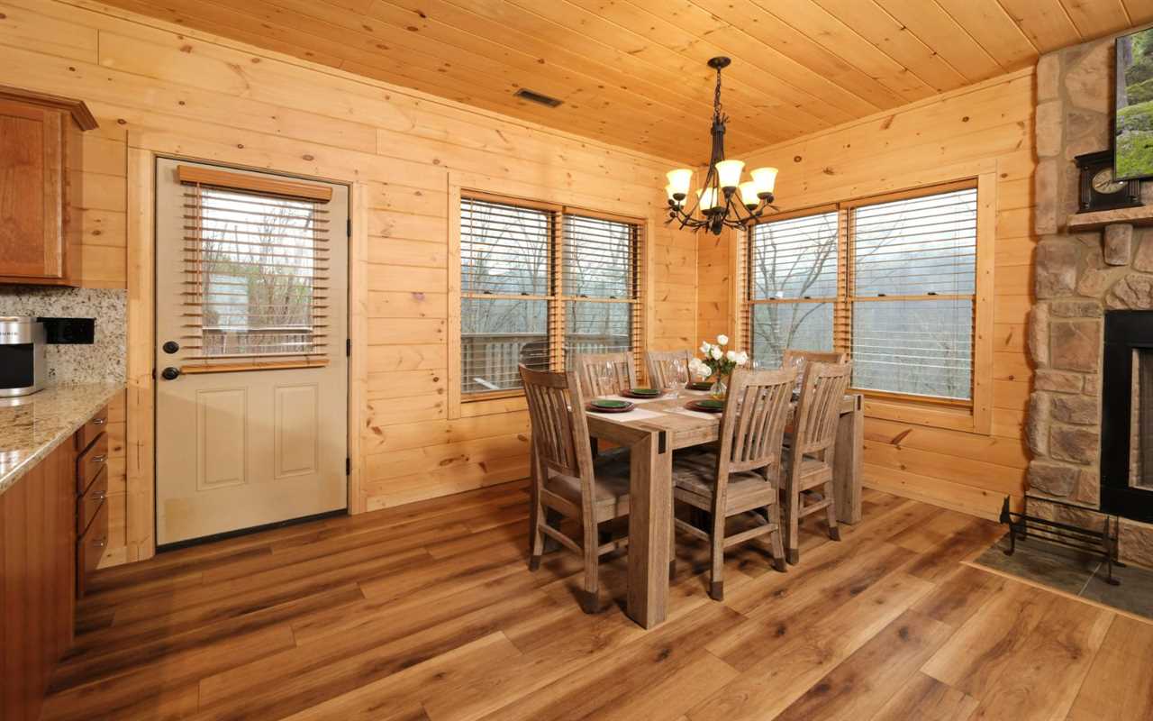 This charming living room offers a peaceful spot to relax after exploring the Smokies. Gather around the real wood-burning stone fireplace, watch a movie, or simply enjoy the company of family and friends. Floor-to-ceiling windows showcase scenic mountain views while filling the space with natural light.