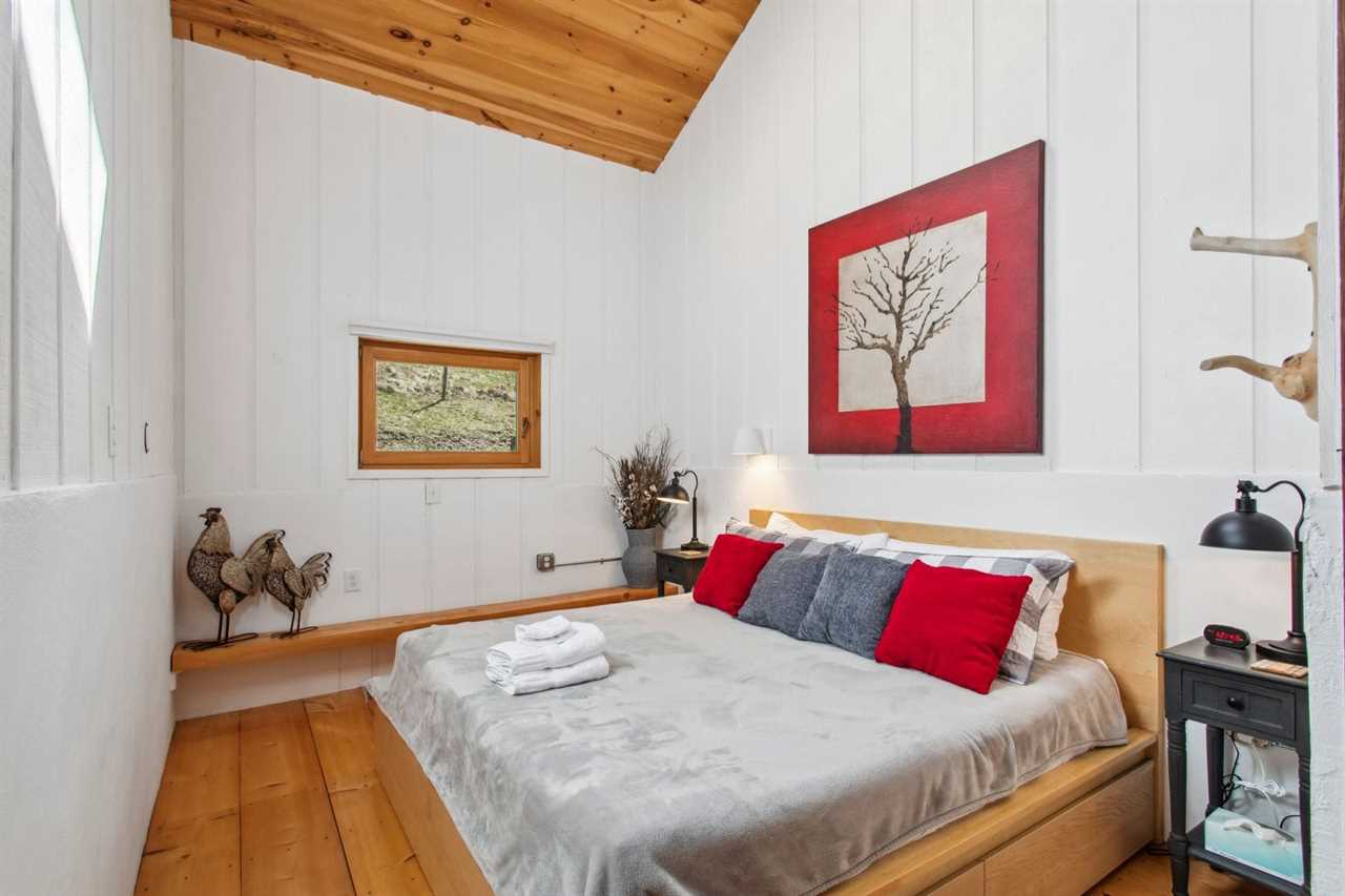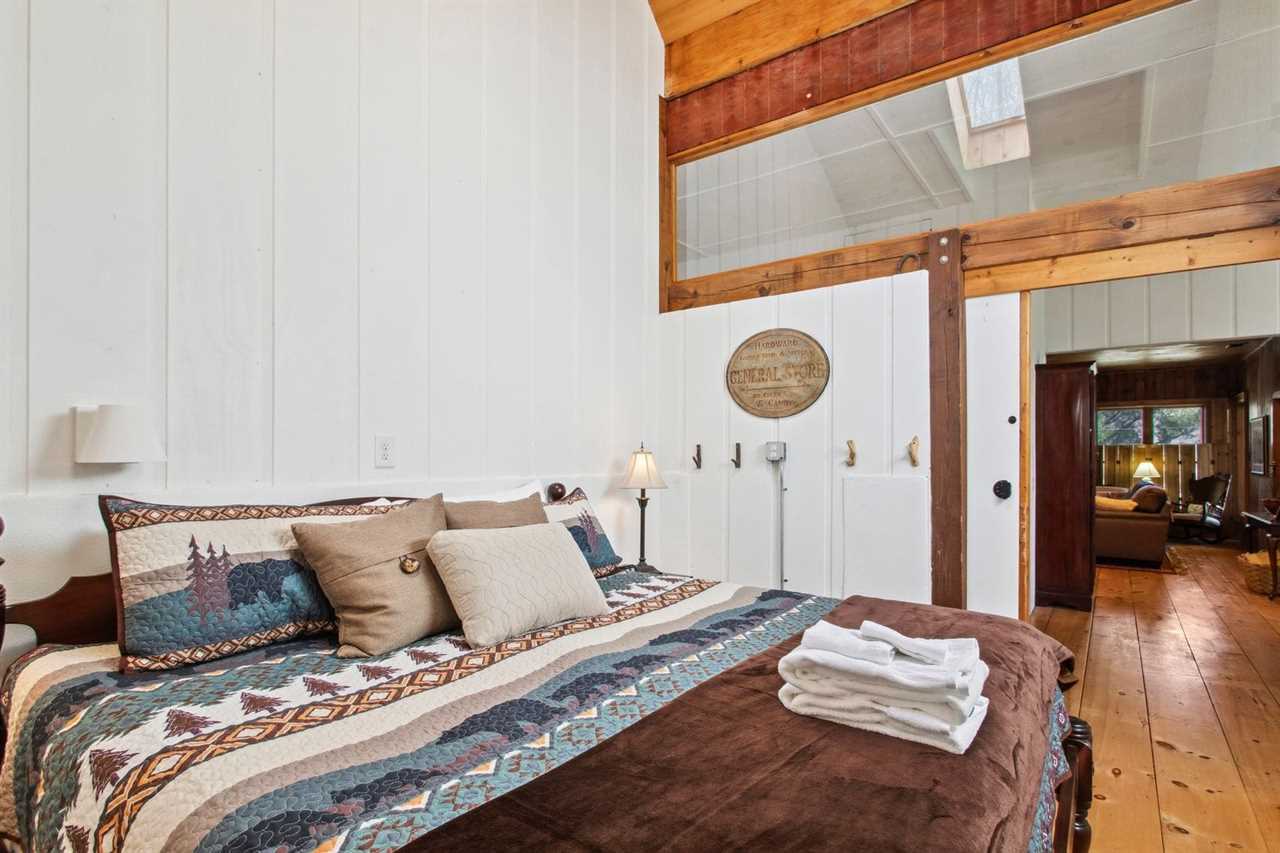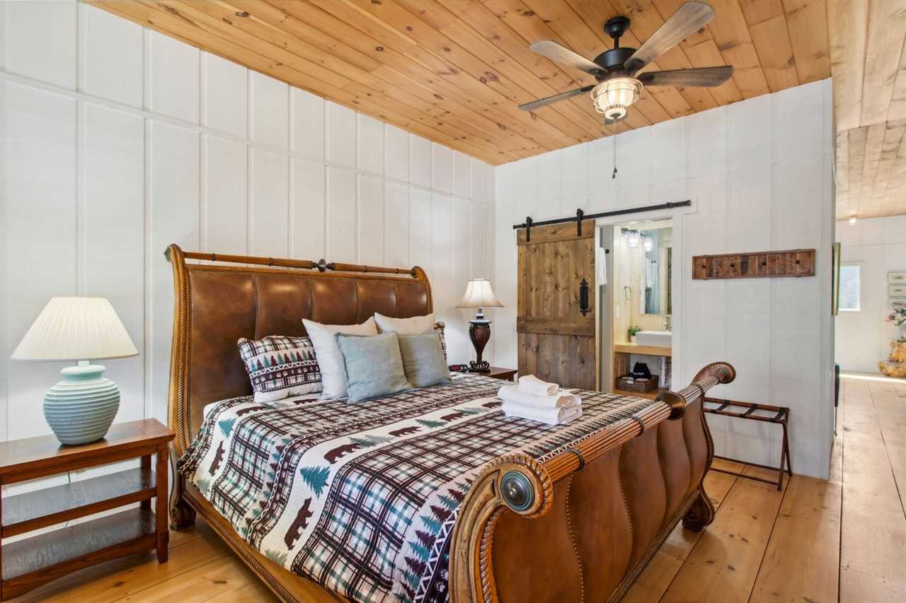Bluff View Farm features six sleeping areas, including two master suites, and can accommodate up to fourteen guests. The spacious loft master bedroom has a king bed, TV sitting area, and a private ensuite. There is also a desk for remote work. This bedroom is open to the floor below. The main floor is home to a second master suite with a queen bed, TV, and private ensuite with a step-in shower. Three barn stalls on the main level have been converted into cozy bedrooms with barn doors and skylights for natural light. Two of the bedrooms have king beds, while the third barn room can sleep three in twin-over-full bunk beds. An additional bedroom off the living room has a full bed and access to a covered sitting area just outside. A common bathroom is located just across the aisle from the barn stalls.