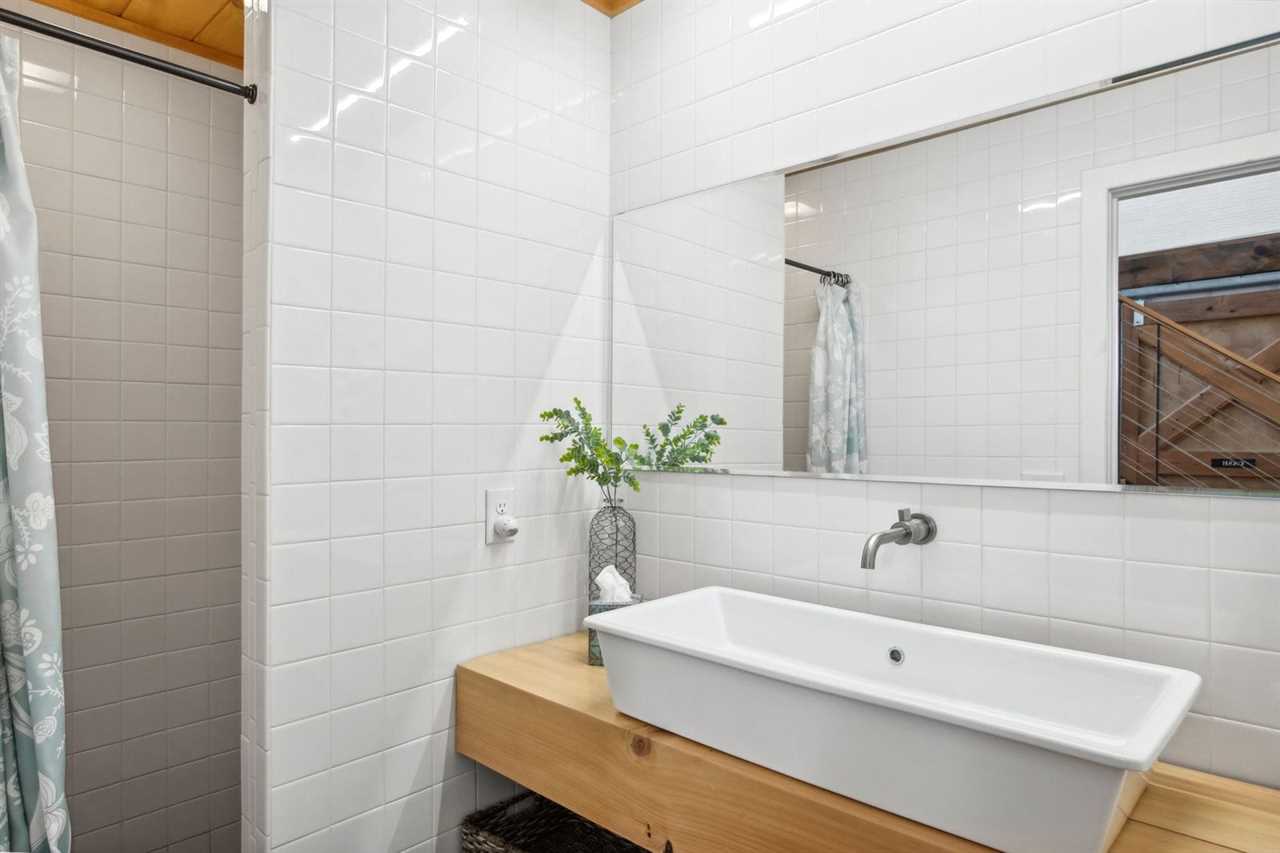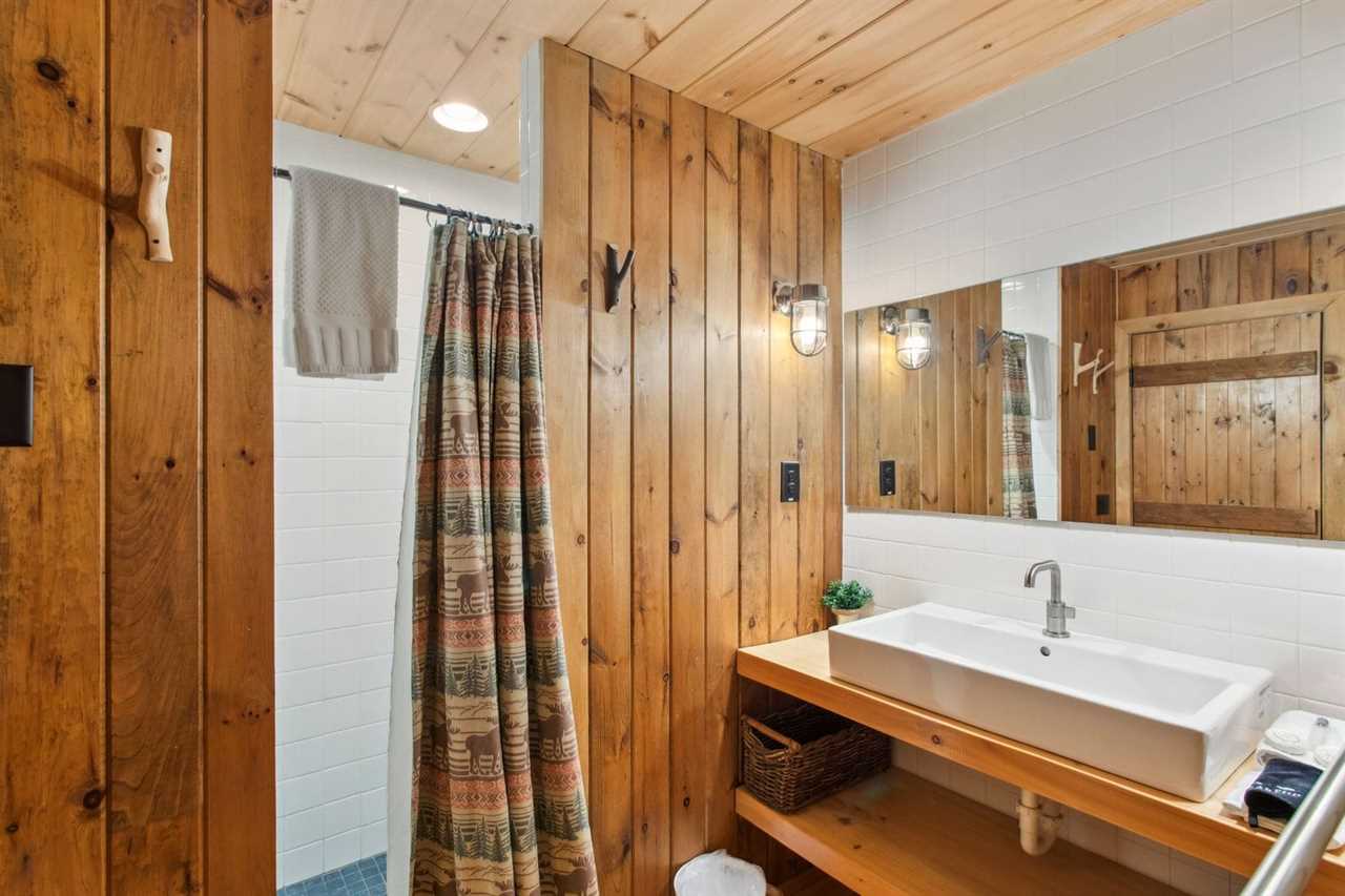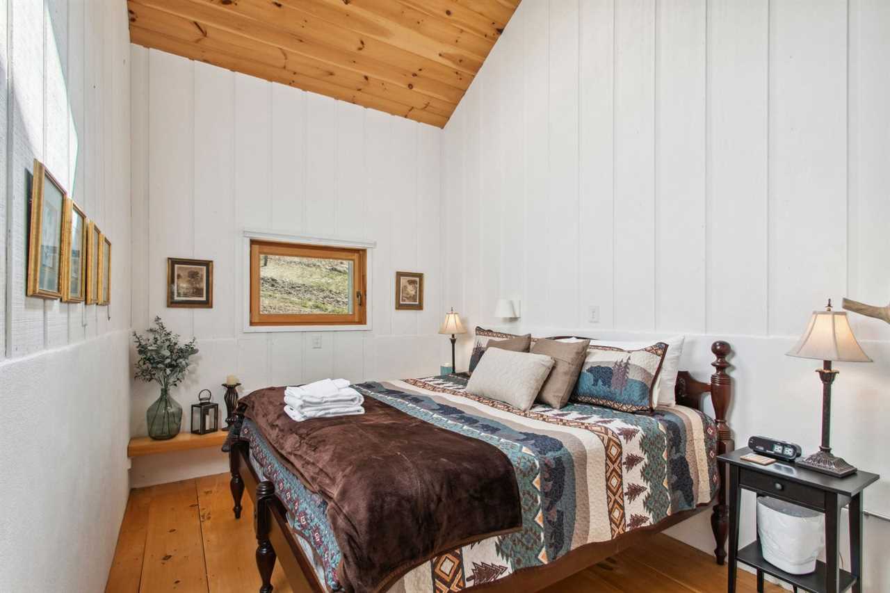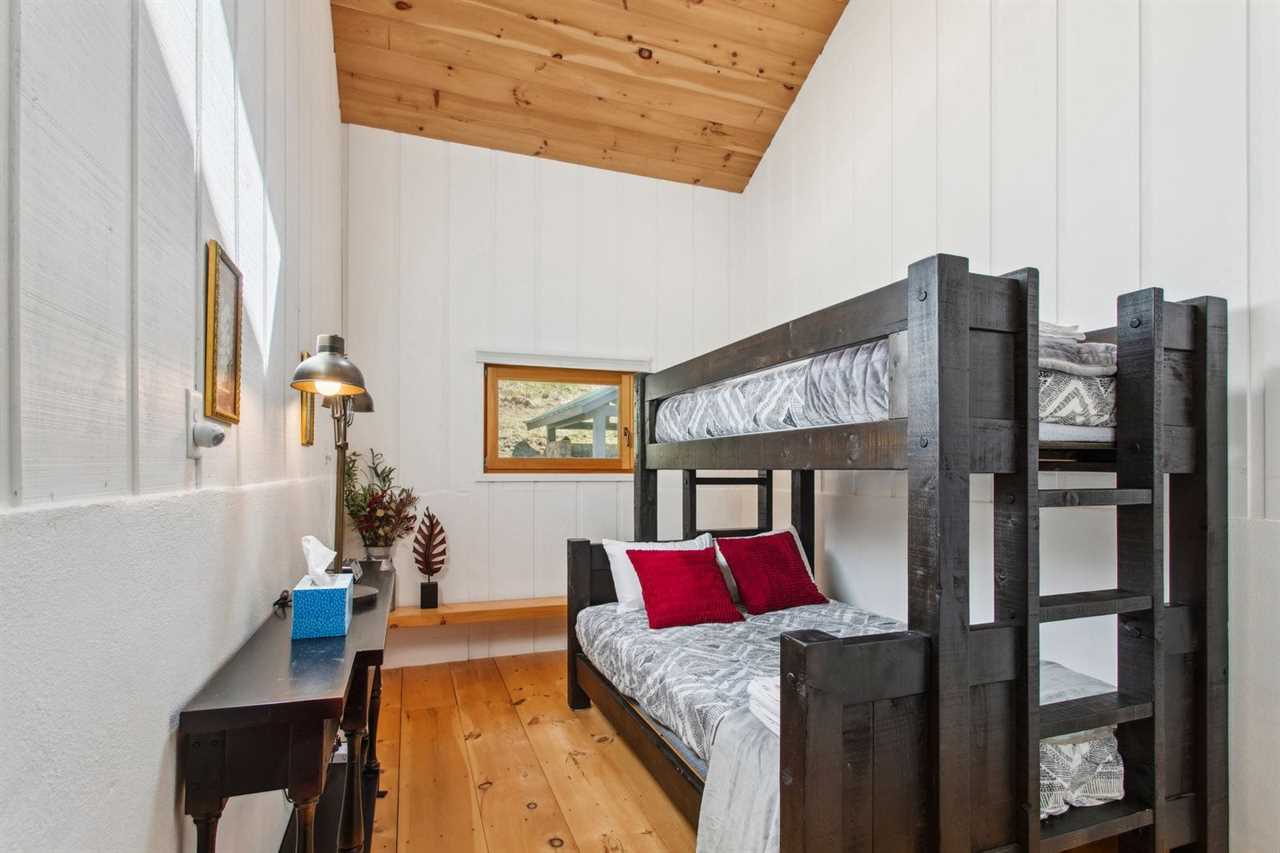 Bluff View Farm features six sleeping areas, including two master suites, and can accommodate up to fourteen guests. The spacious loft master bedroom has a king bed, TV sitting area, and a private ensuite. There is also a desk for remote work. This bedroom is open to the floor below. The main floor is home to a second master suite with a queen bed, TV, and private ensuite with a step-in shower. Three barn stalls on the main level have been converted into cozy bedrooms with barn doors and skylights for natural light. Two of the bedrooms have king beds, while the third barn room can sleep three in twin-over-full bunk beds. An additional bedroom off the living room has a full bed and access to a covered sitting area just outside. A common bathroom is located just across the aisle from the barn stalls.