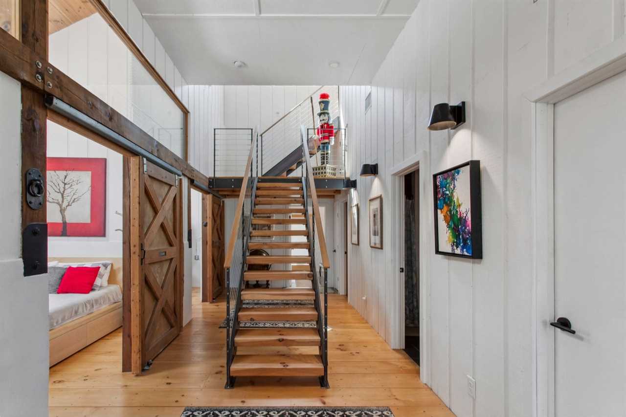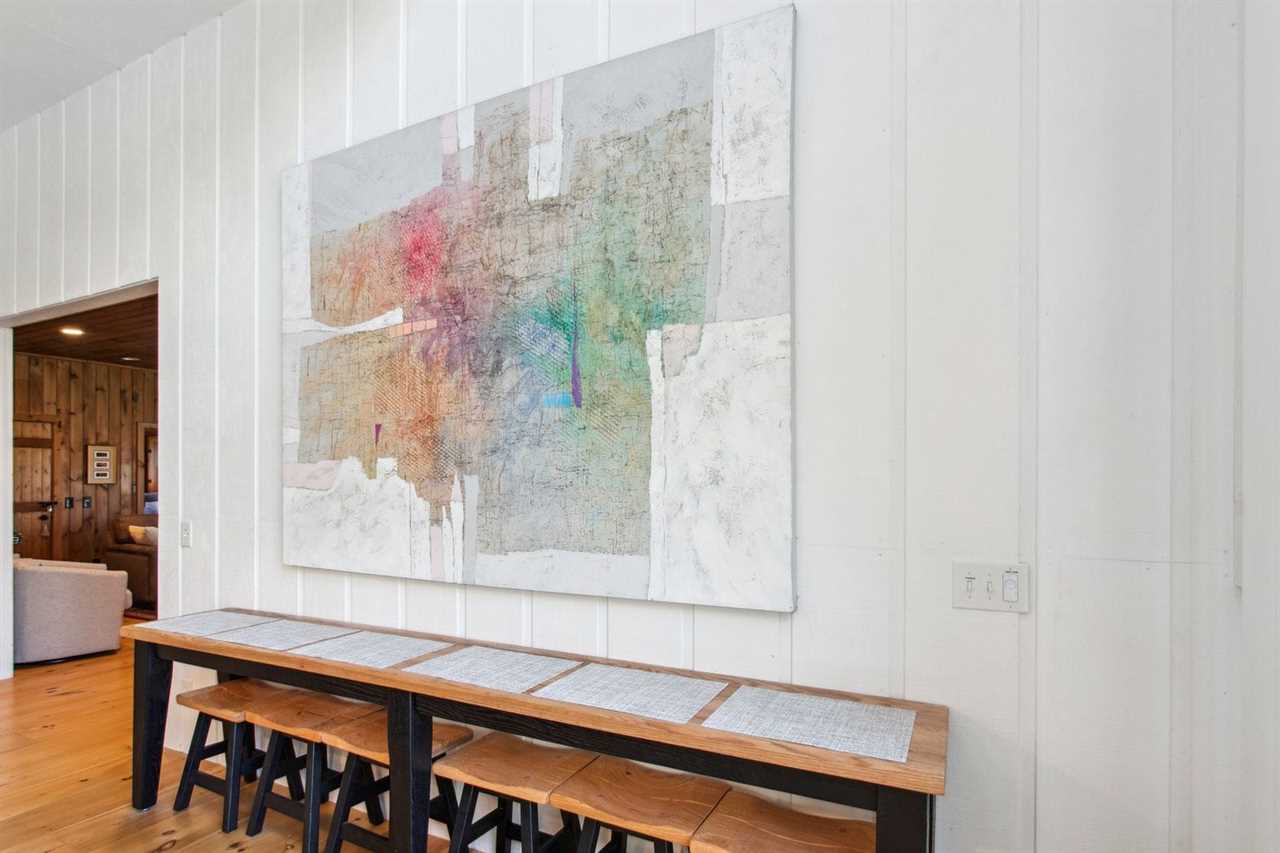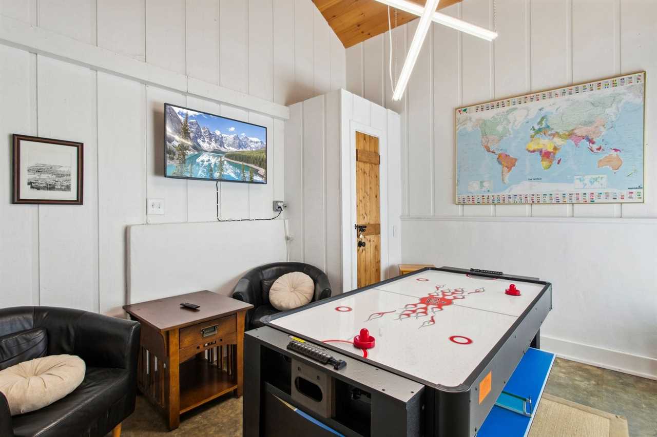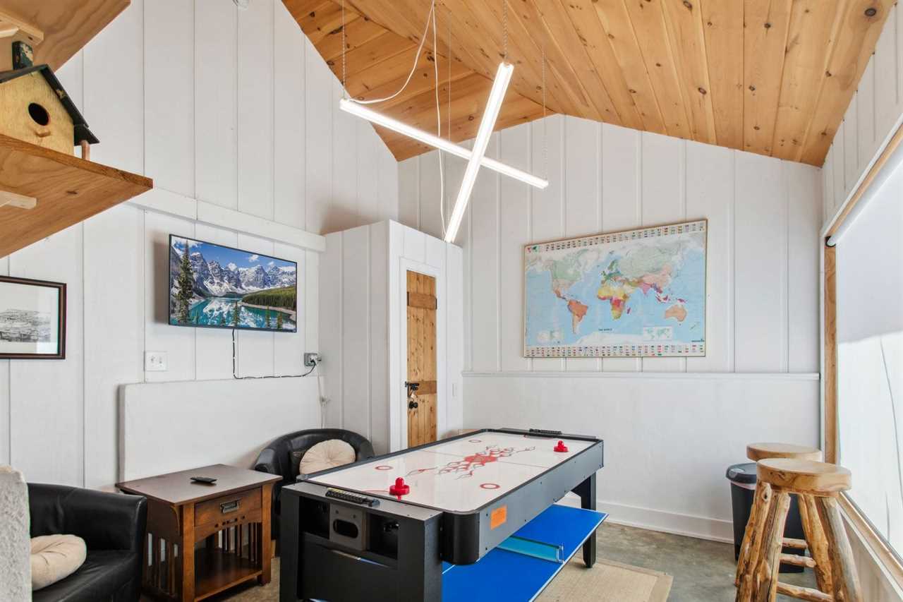 Bluff View Farm is a unique barn-to-house conversion that marries the rustic charm of a classic barn with the sleek elegance of contemporary design. The home sits on over 14 acres, providing entertainment for guests of all ages. Upon entering the barn, guests are greeted with bright white walls and beautiful wide-plank hardwood floors. The kitchen, located off the entrance, will delight the chef in your group, with high end stainless steel appliances. There is a grand dining table with seating for eight guests with additional seating along the wall for six guests. The large picture windows, where the barn doors used to be, allow the sun to brighten and warm the space. The family room invites you to relax on the comfortable couches while warming up by the gas fireplace after a day of exploring the pastures. The tongue and groove walls and ceiling offer warmth to the cozy space. Additional entertainment and TV rooms provide guests with additional room to spread out and enjoy the multi-game game table. The game table can covert into air hockey table, ping-pong, or a pool table.
