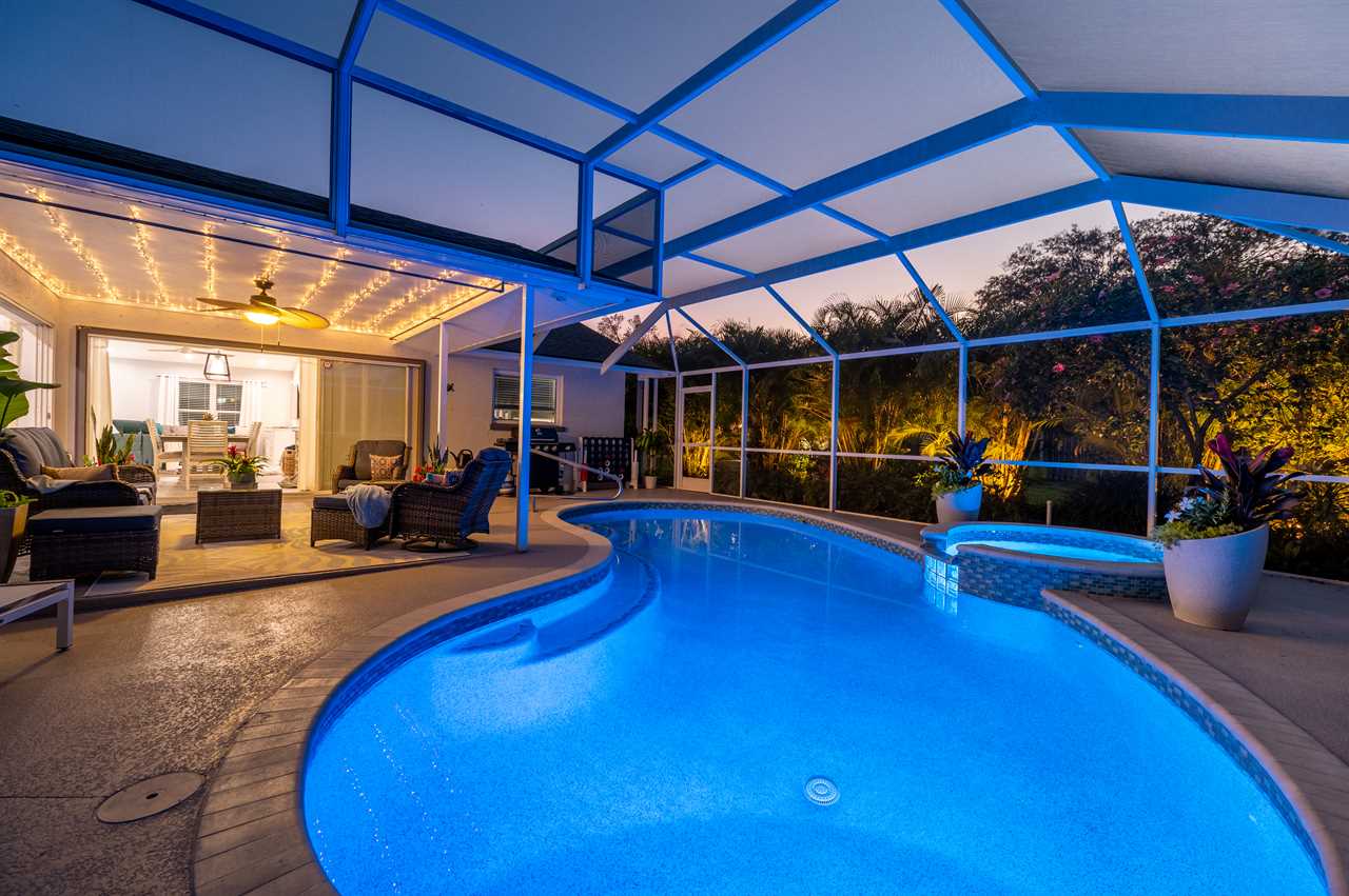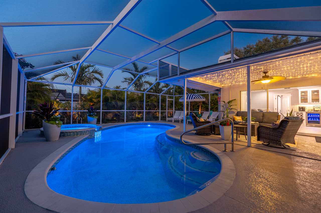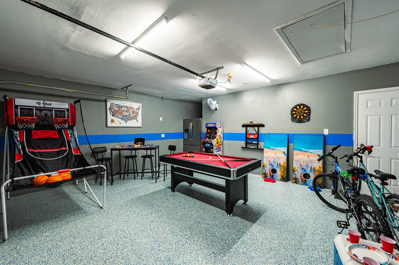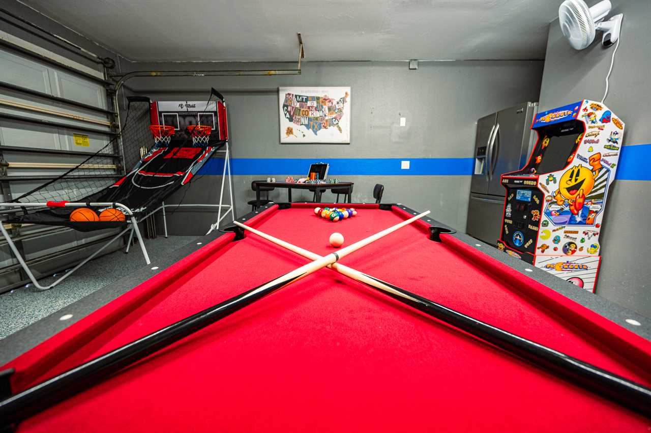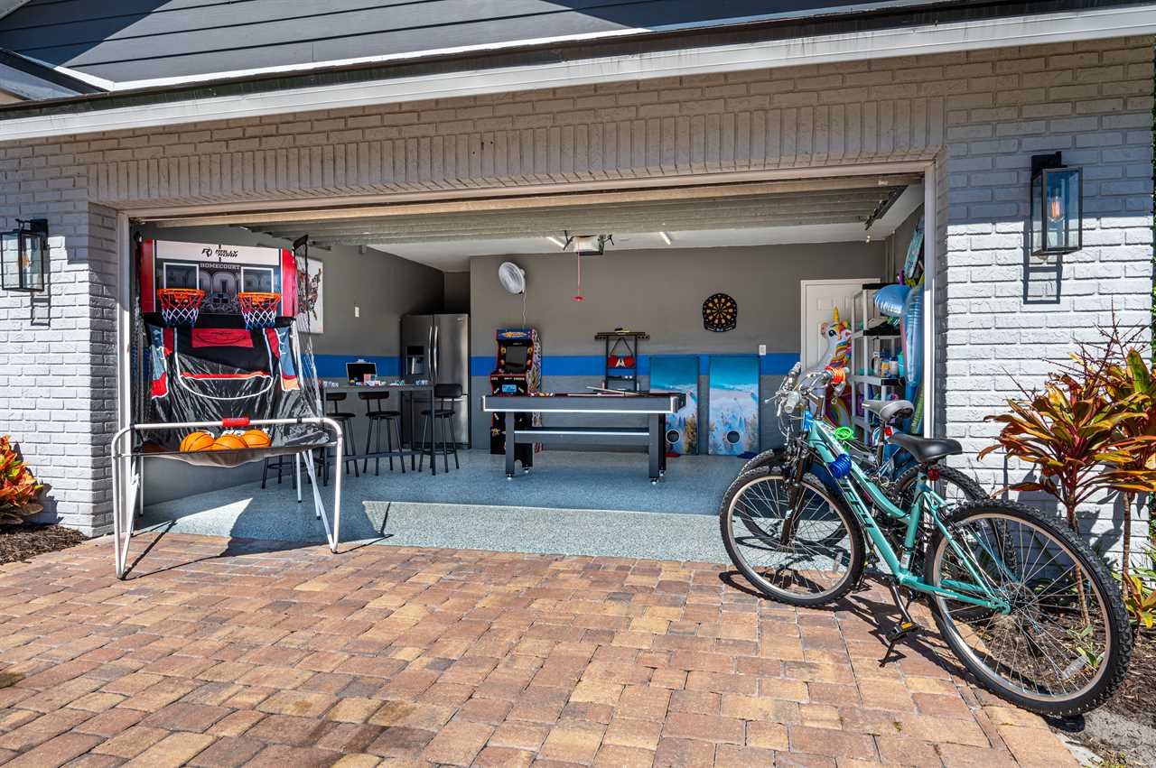 Just through the sliding glass doors, you will find the screened-in pool area with plenty of seating options to relax in the shade or soak in the Florida sunshine with your favorite book! Take a dip in your private pool to cool off after a long day at the beach or the pool can even be heated during those cold winter months or plunge into the heated spa! Enjoy the giant Connect Four or pull out the Cornhole boards for a competitive game in the tropical backyard. Looking for more entertainment? Head over to the game room/garage where you can enjoy arcade games on the Retro Game Center, a Pool Table, Poker, or Arcade Basketball!