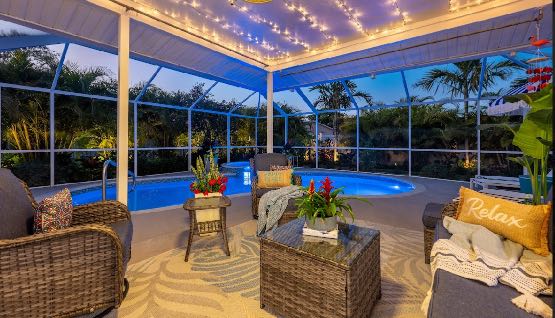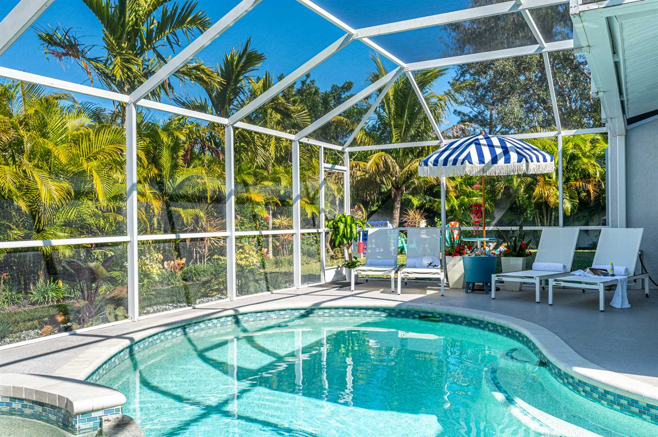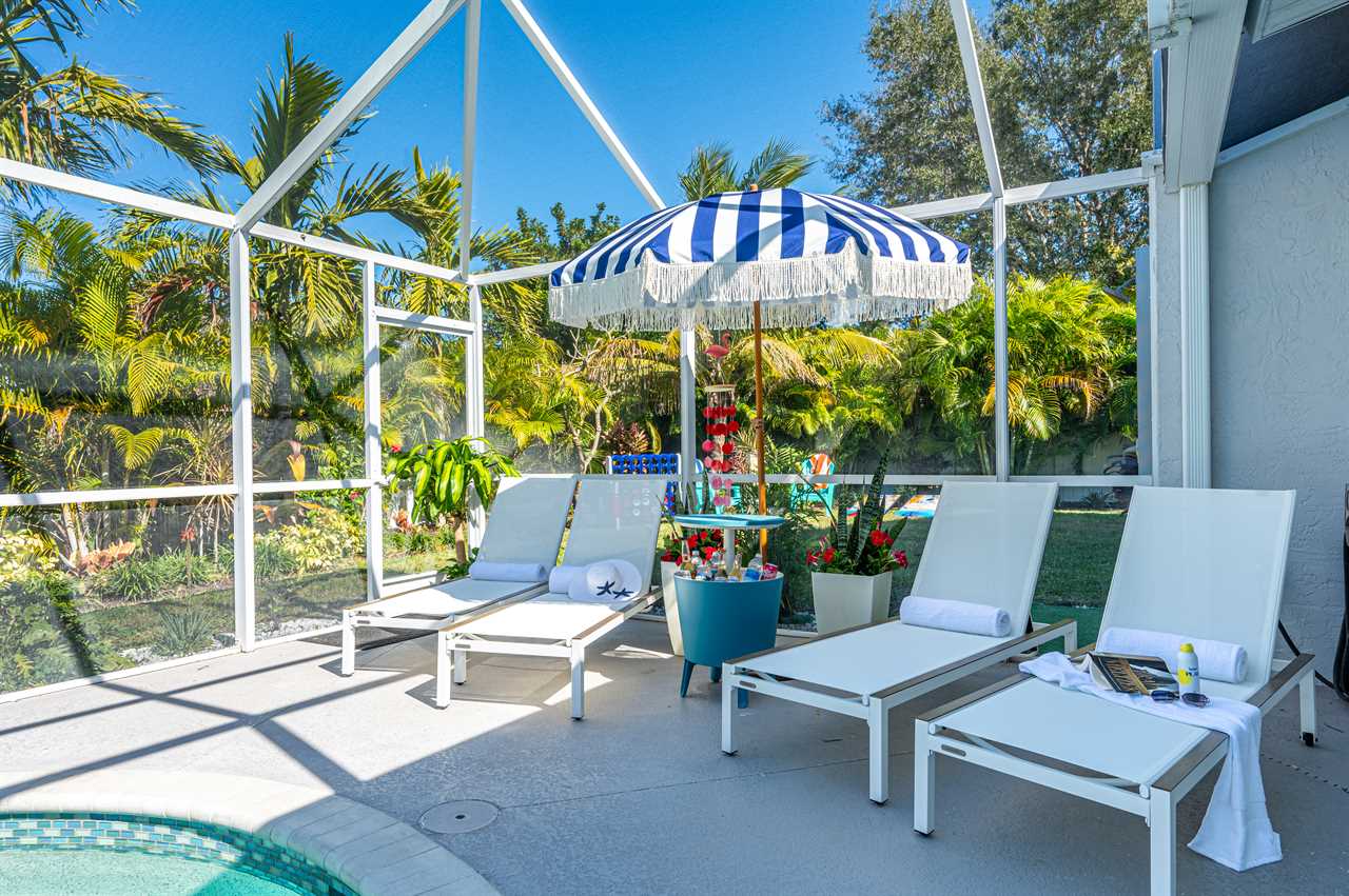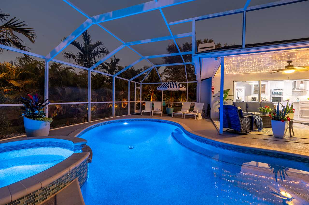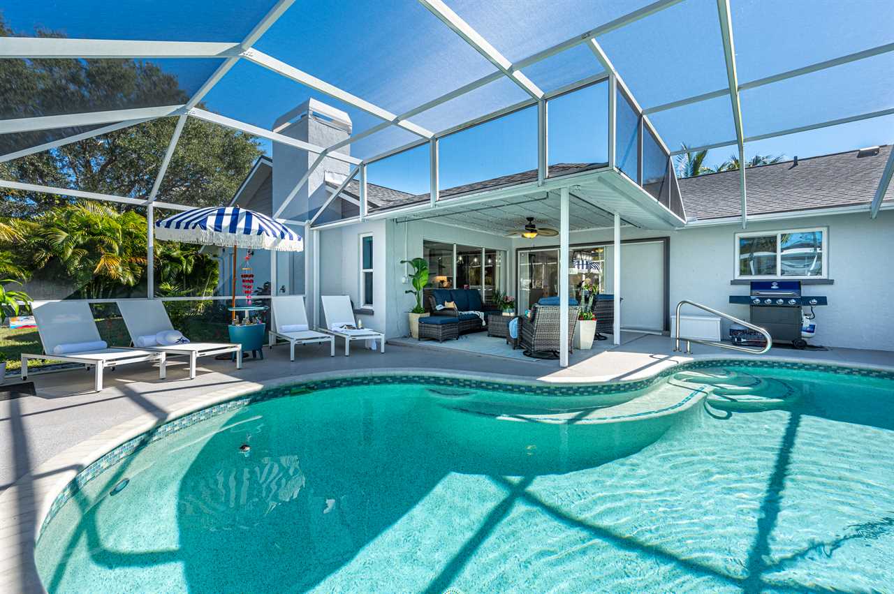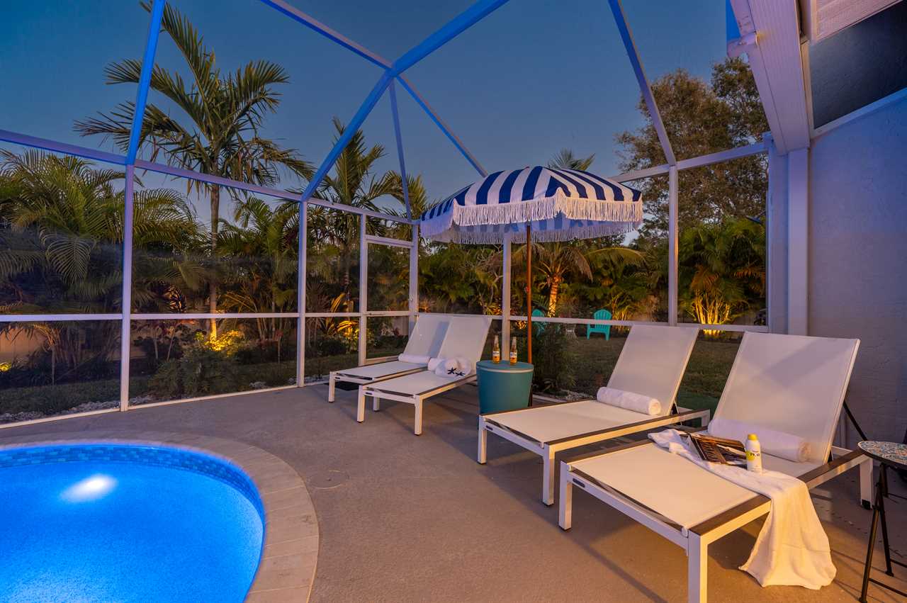 Just through the sliding glass doors, you will find the screened-in pool area with plenty of seating options to relax in the shade or soak in the Florida sunshine with your favorite book! Take a dip in your private pool to cool off after a long day at the beach or the pool can even be heated during those cold winter months or plunge into the heated spa! Enjoy the giant Connect Four or pull out the Cornhole boards for a competitive game in the tropical backyard. Looking for more entertainment? Head over to the game room/garage where you can enjoy arcade games on the Retro Game Center, a Pool Table, Poker, or Arcade Basketball!