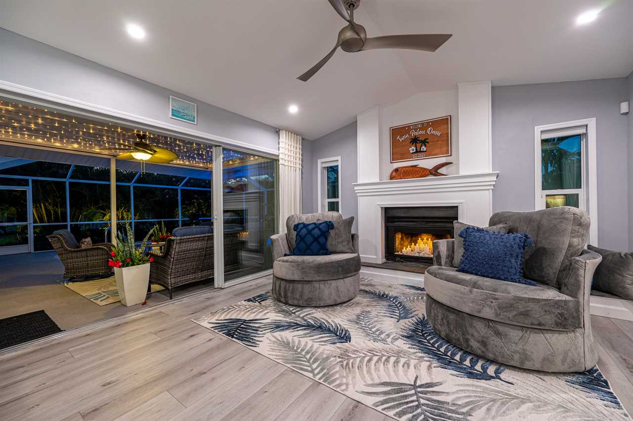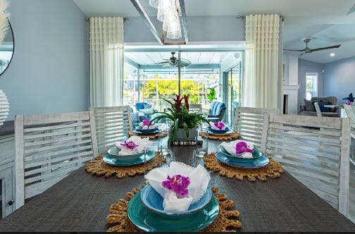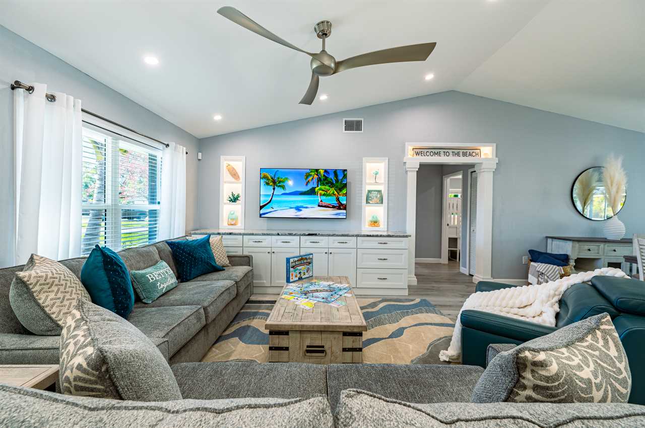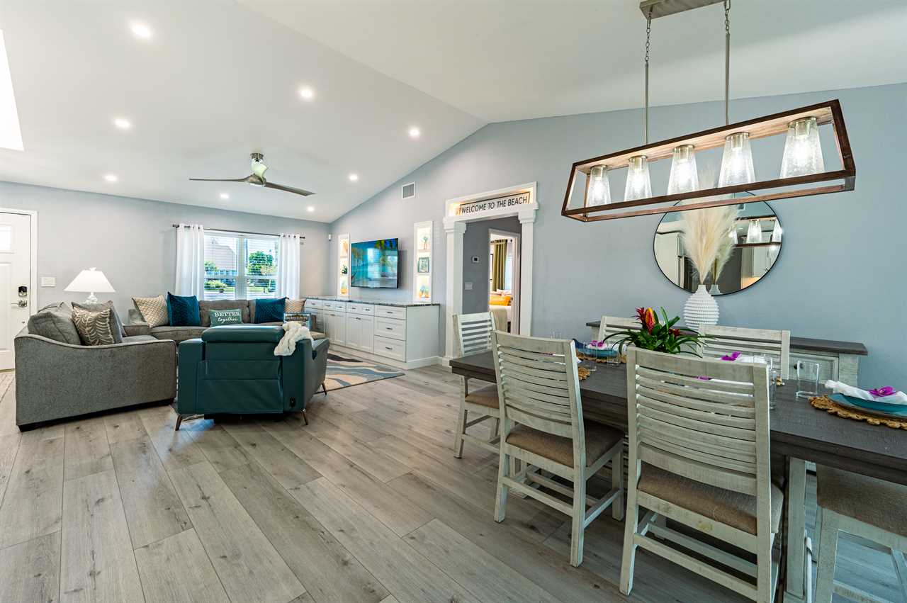 In addition to its unbeatable location, this property boasts charming comfortable furnishings and a beautiful, screened-in pool area surrounded by a palm tree paradise. The kitchen, dining room, and living room offer an open floor plan with different entertainment options for all! The living room boasts plenty of seating so everyone can grab a seat around the Smart TV and watch all your favorite shows or movies. If you are looking for some family fun convert the coffee table into a game table and enjoy your favorite board games. The kitchen comes equipped with a convection oven to help prepare everything you will need to make your favorite home-cooked meals. An additional beverage cooler as well as a fridge in the garage is available for all your favorite drinks. Nestled next to the kitchen, the dining room accommodates a table for six with room for six more at the island.