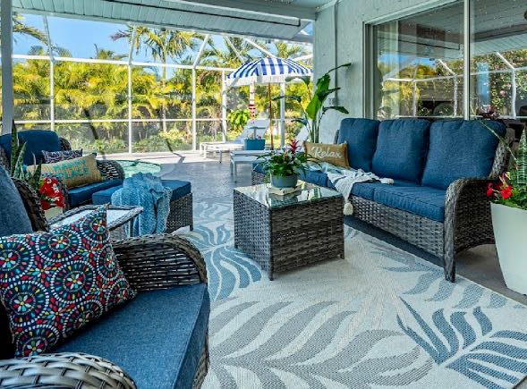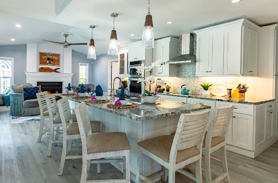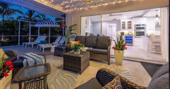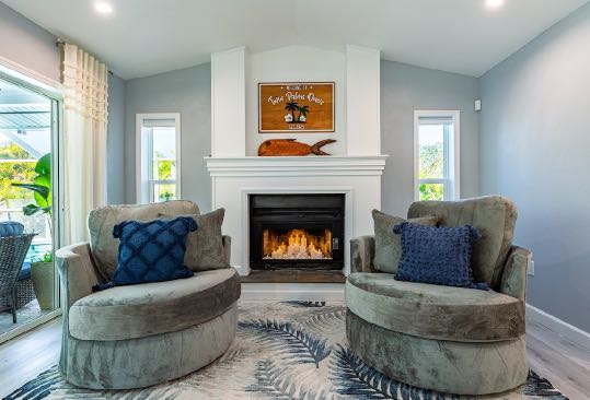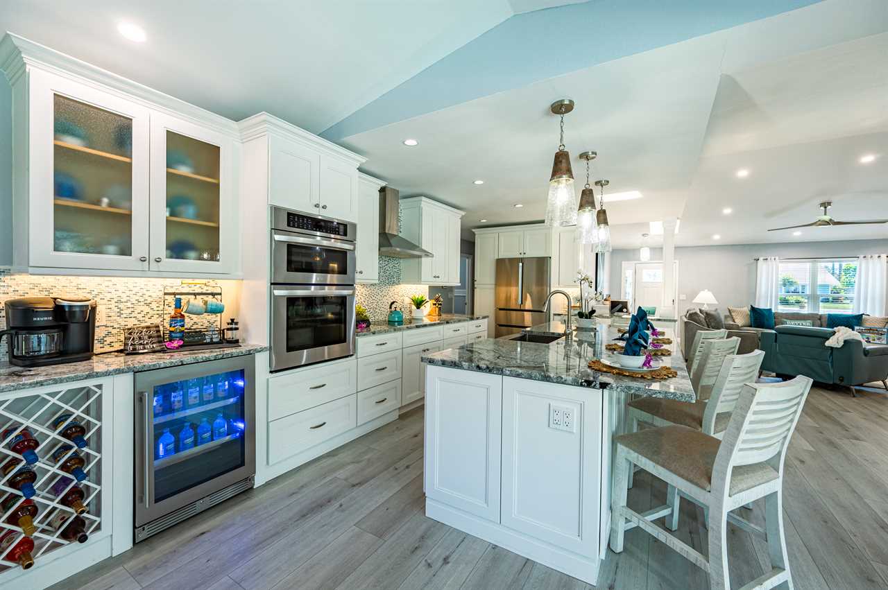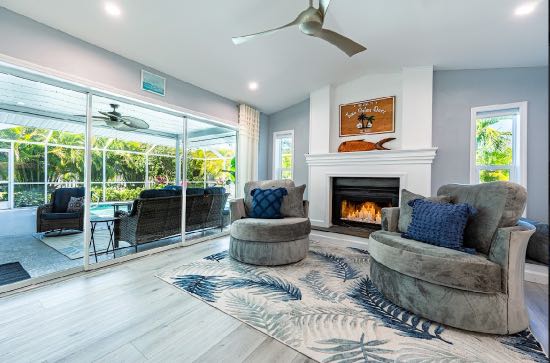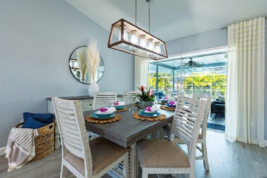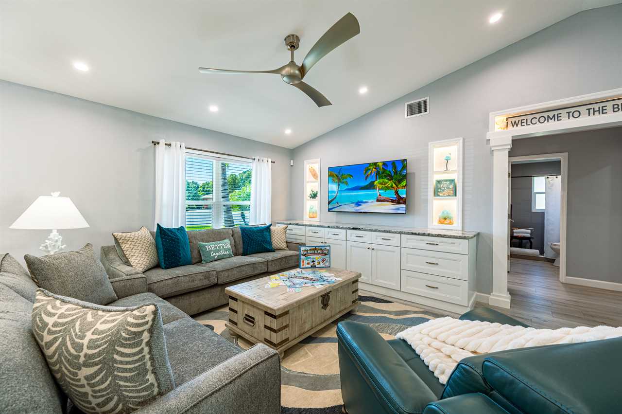 In addition to its unbeatable location, this property boasts charming comfortable furnishings and a beautiful, screened-in pool area surrounded by a palm tree paradise. The kitchen, dining room, and living room offer an open floor plan with different entertainment options for all! The living room boasts plenty of seating so everyone can grab a seat around the Smart TV and watch all your favorite shows or movies. If you are looking for some family fun convert the coffee table into a game table and enjoy your favorite board games. The kitchen comes equipped with a convection oven to help prepare everything you will need to make your favorite home-cooked meals. An additional beverage cooler as well as a fridge in the garage is available for all your favorite drinks. Nestled next to the kitchen, the dining room accommodates a table for six with room for six more at the island.