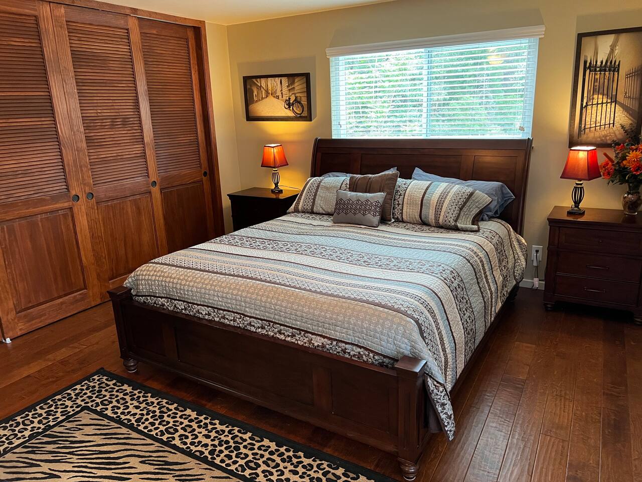 The master bedroom features a king bed, large windows, over sized closet, with an adjoining stone walk in shower. Down the hall is a 2nd bedroom with a queen bed and a full bath that sits across the hall. Off the kitchen is a laundry room with a large washer and dryer.