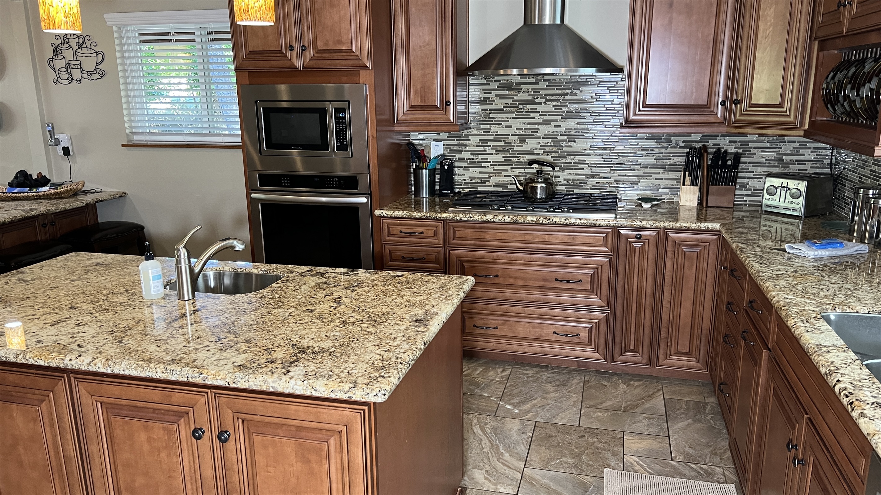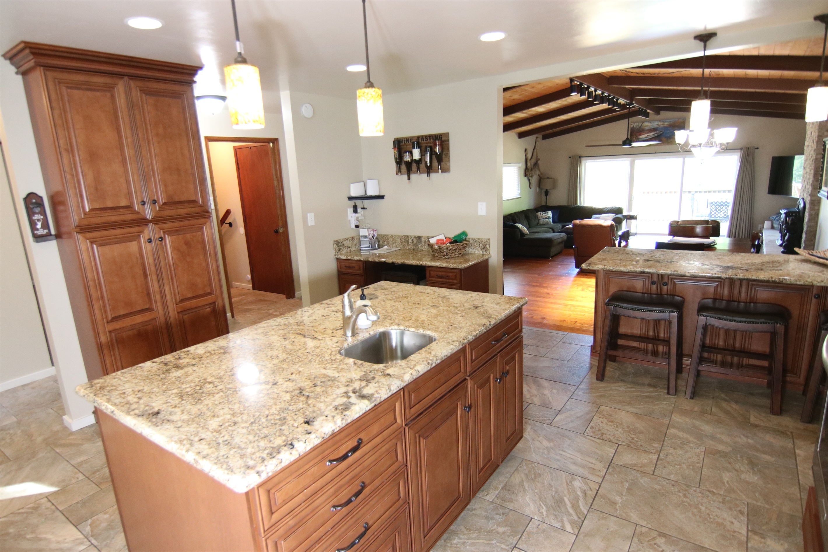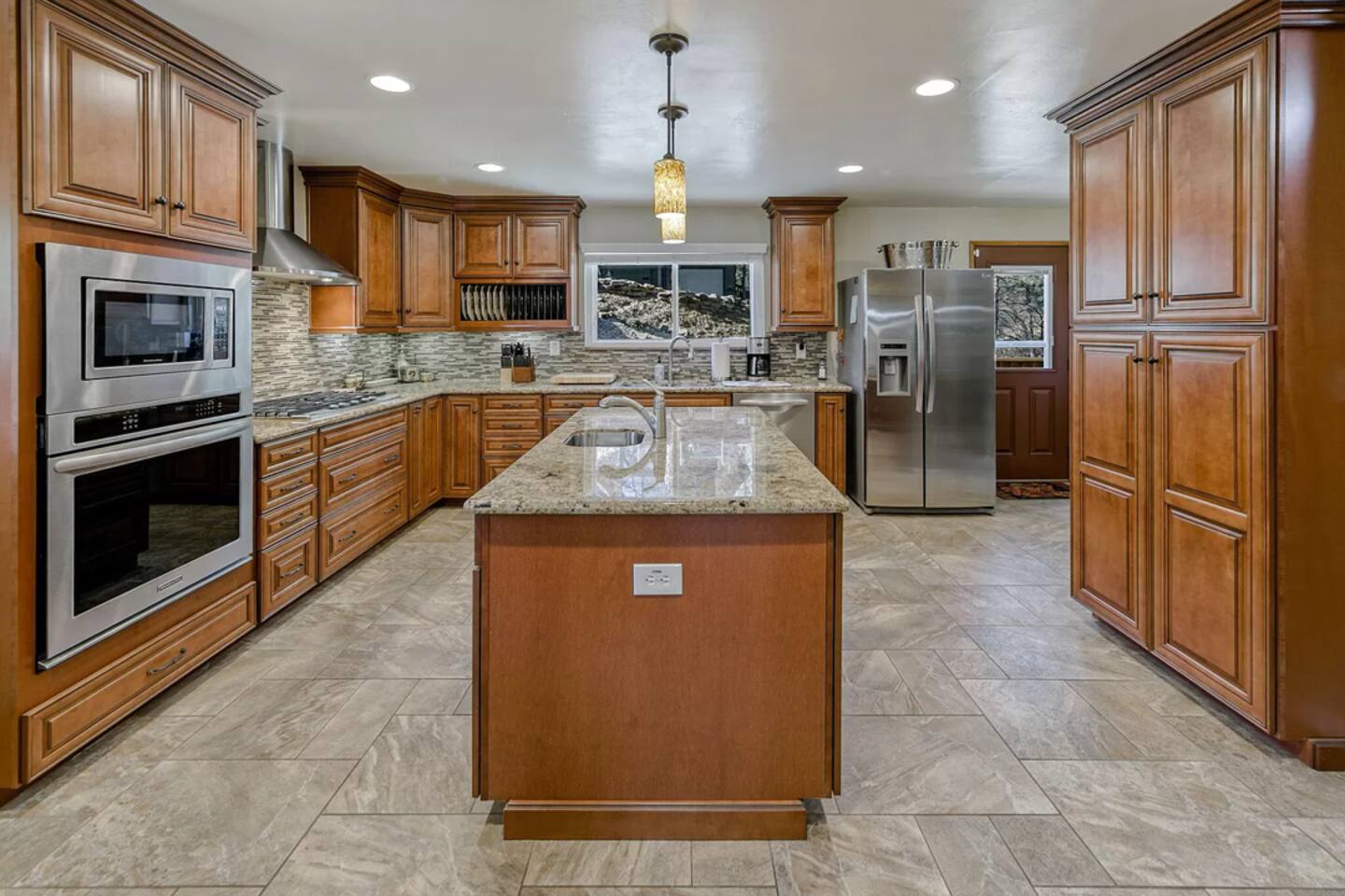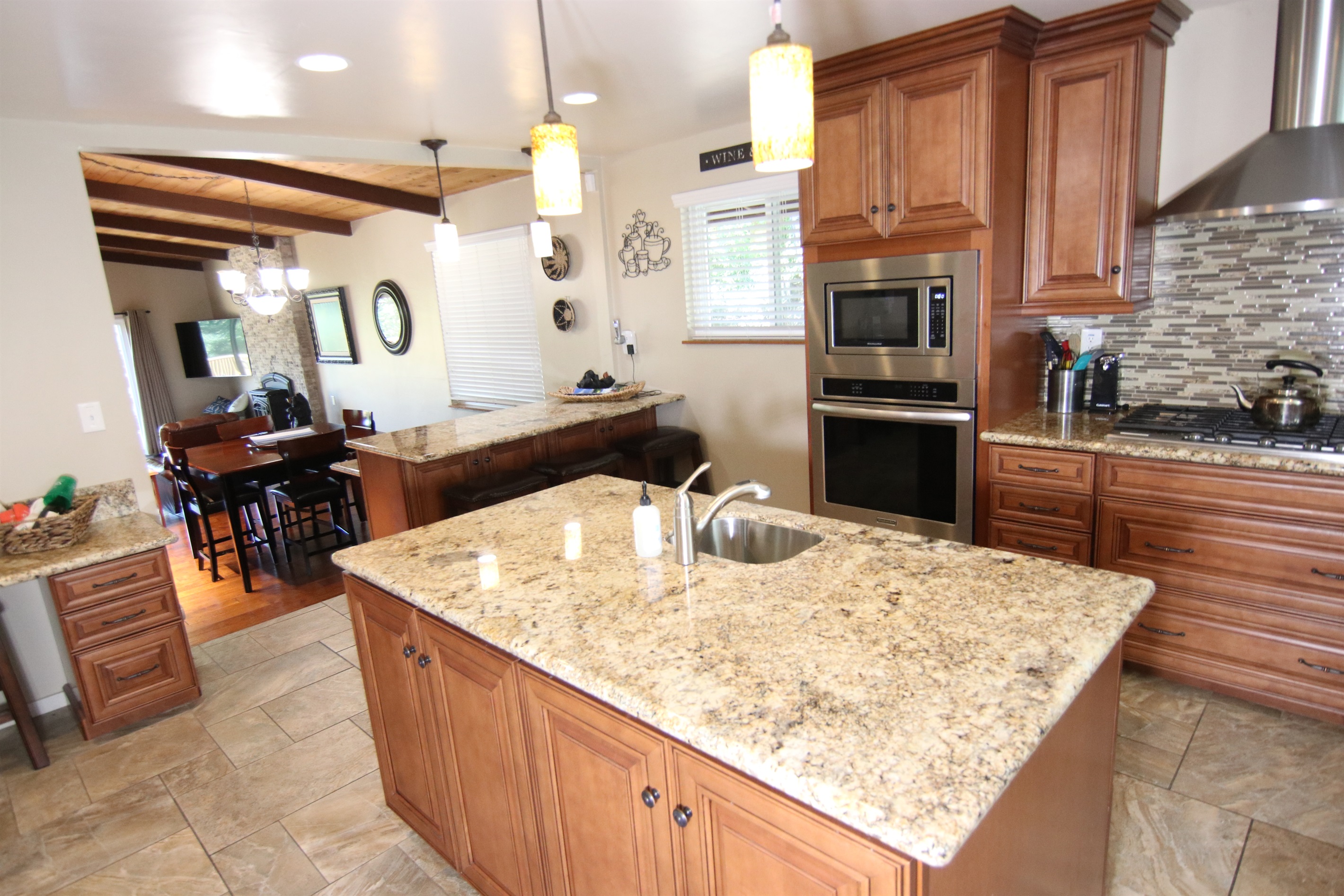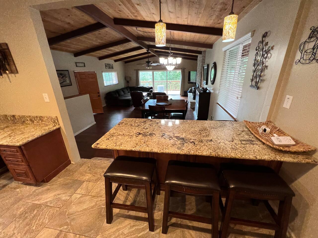 The upper floor is an expansive gathering space that features a large kitchen with fine wood cabinets, granite counter tops and brand name appliances. You will be cooking in style at Retreat 7 and will enjoy the large island and additional bar counter that flows into the main living area.