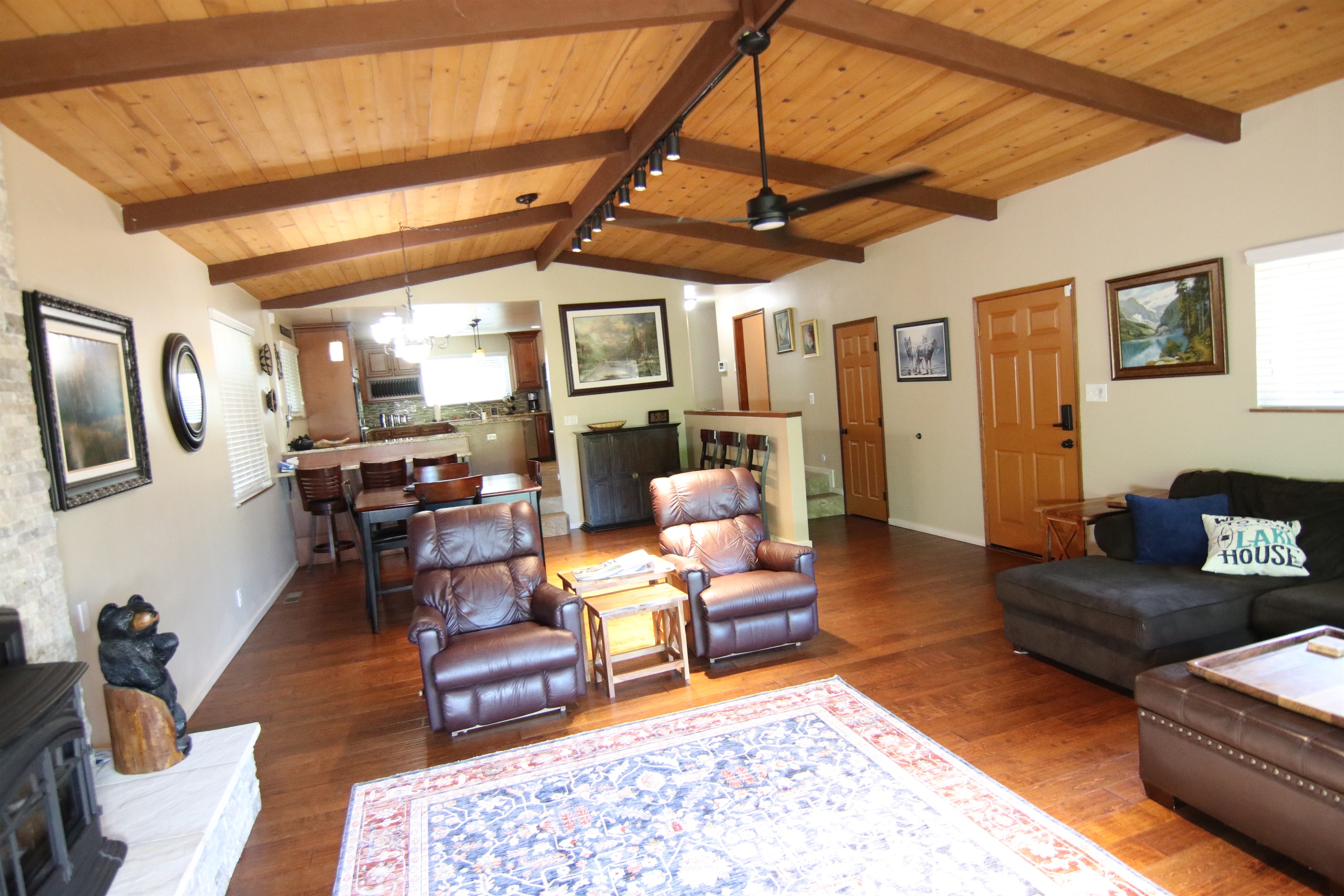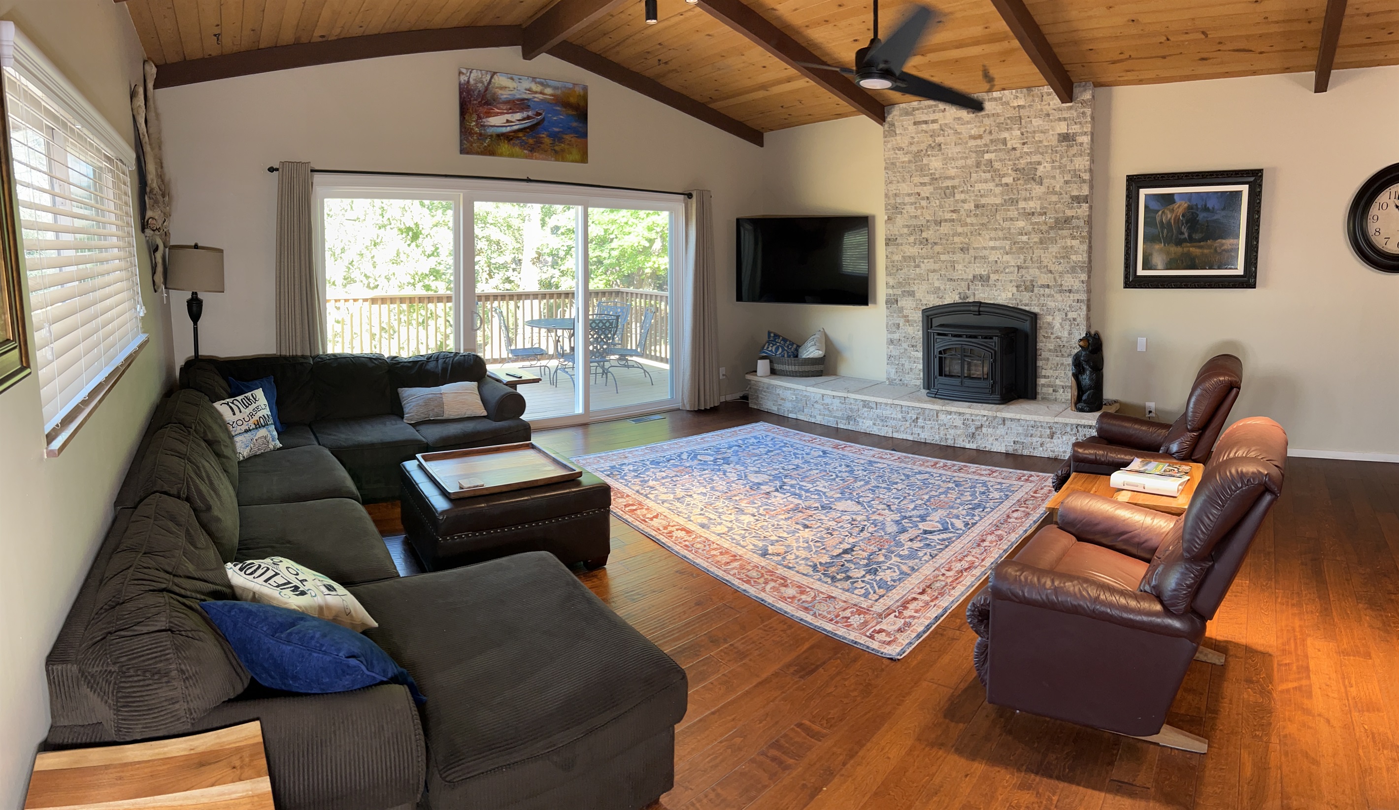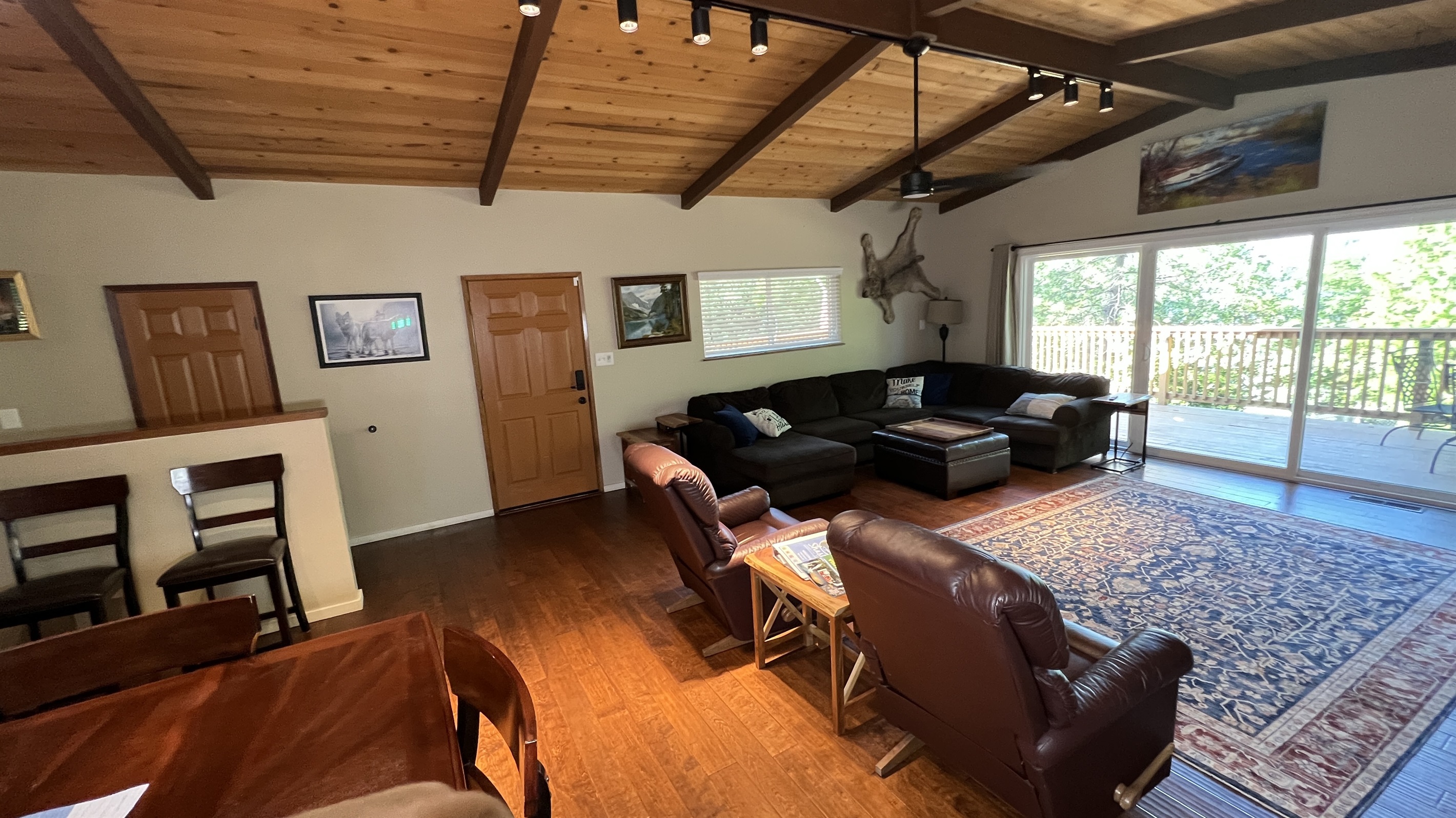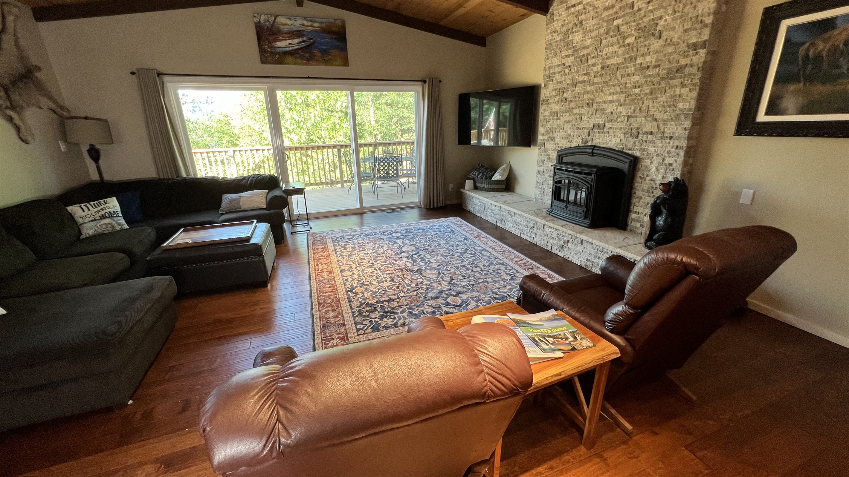 The "open" living area features leather couches, stone fireplace, high wood ceilings and views out to the large deck for entertaining.