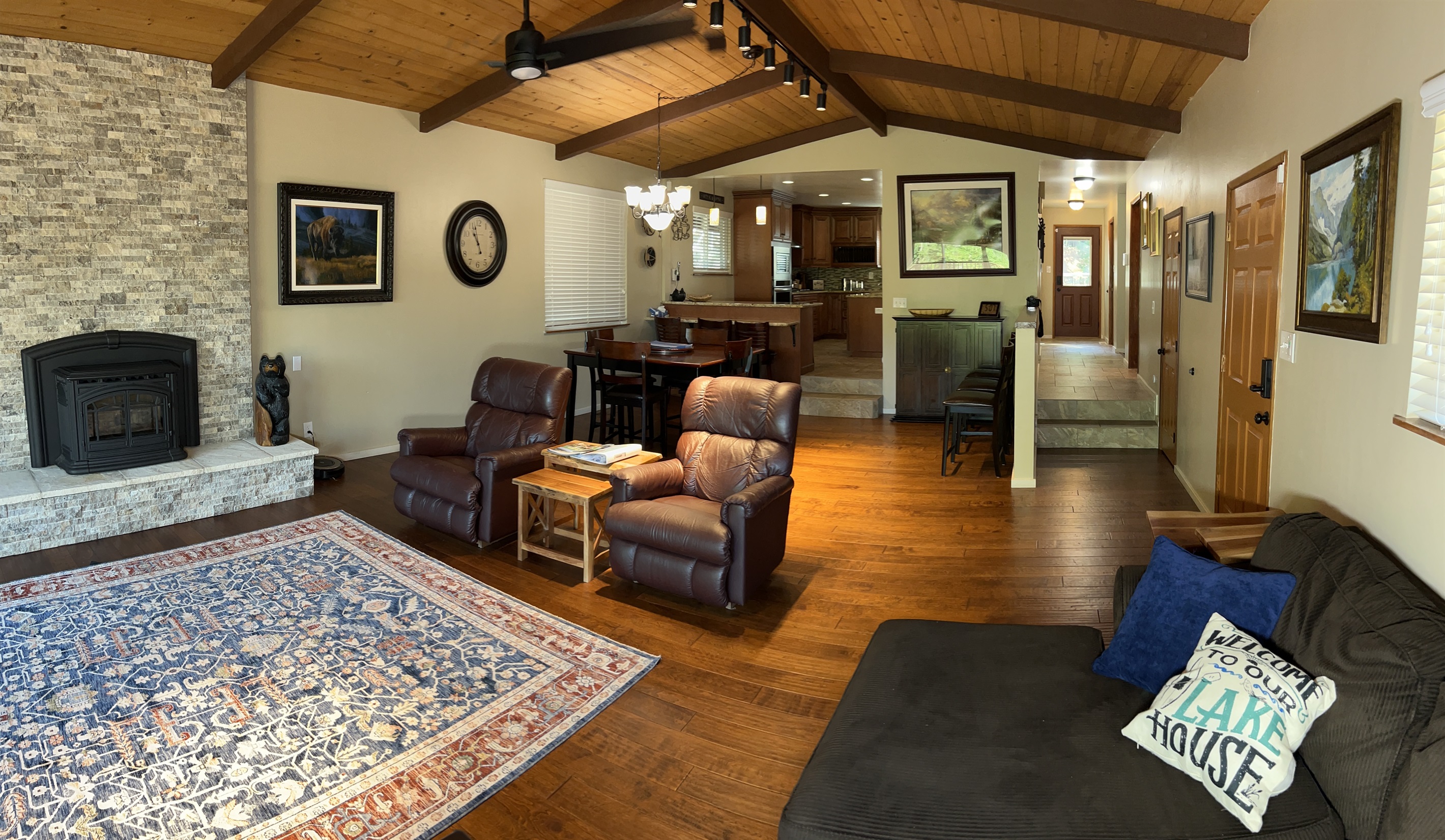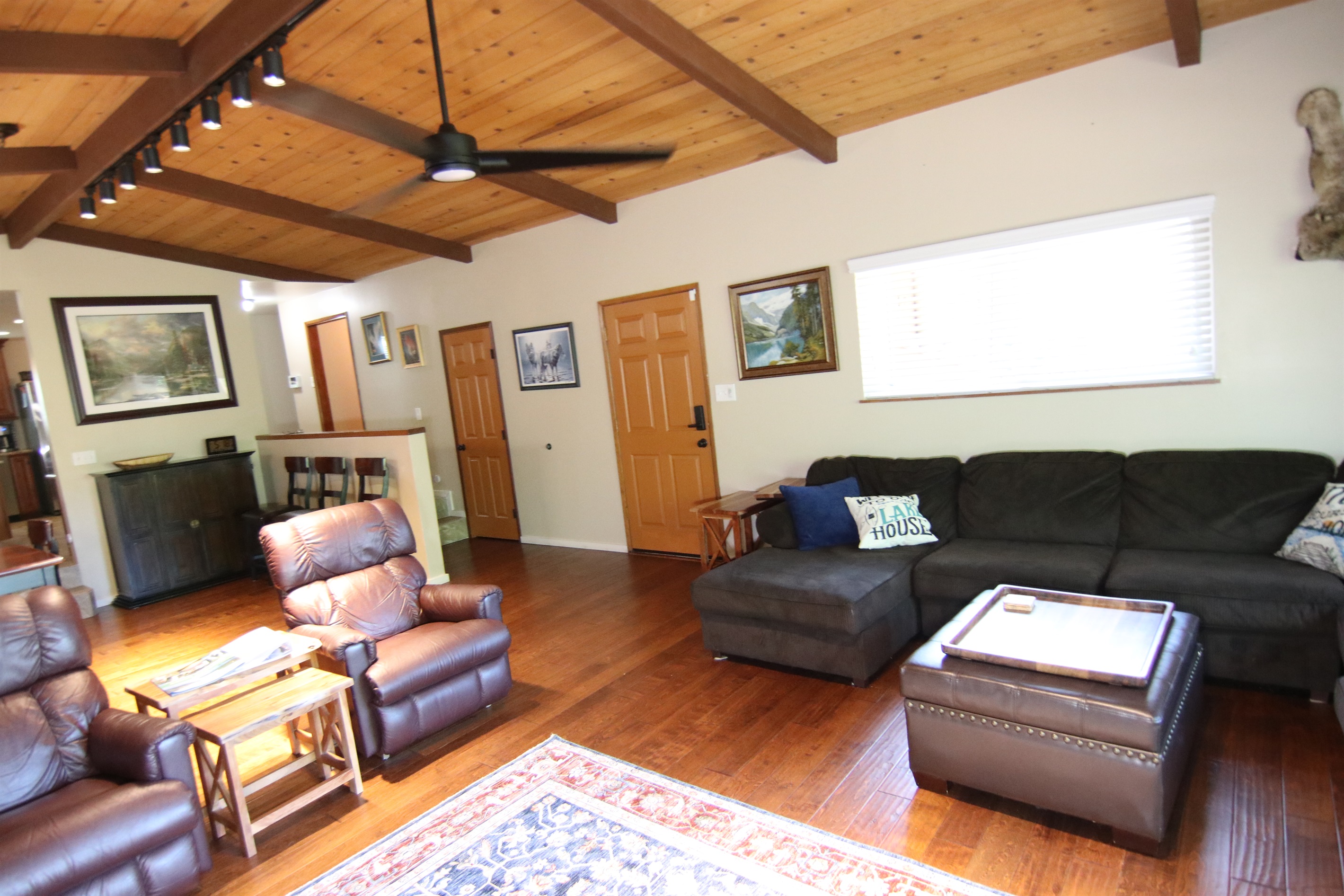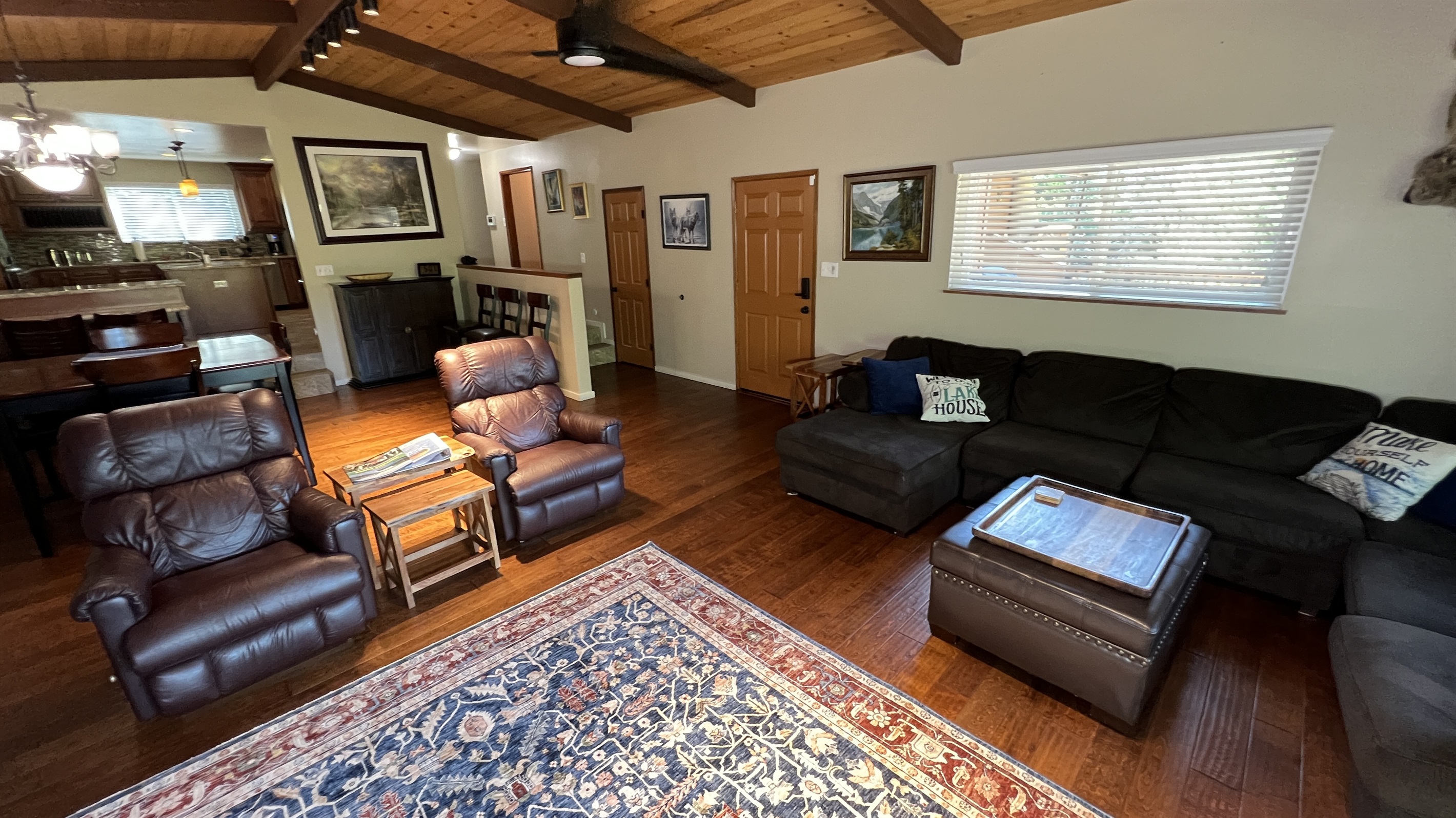 The "open" living area features leather couches, stone fireplace, high wood ceilings and views out to the large deck for entertaining.