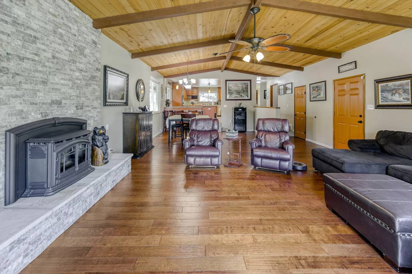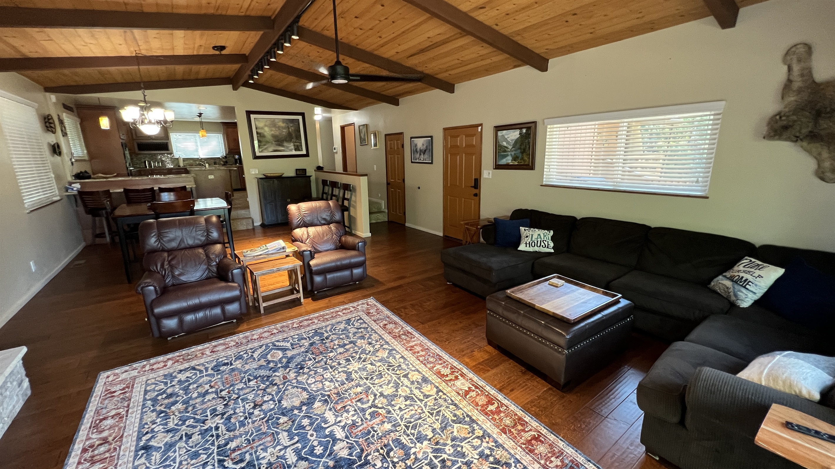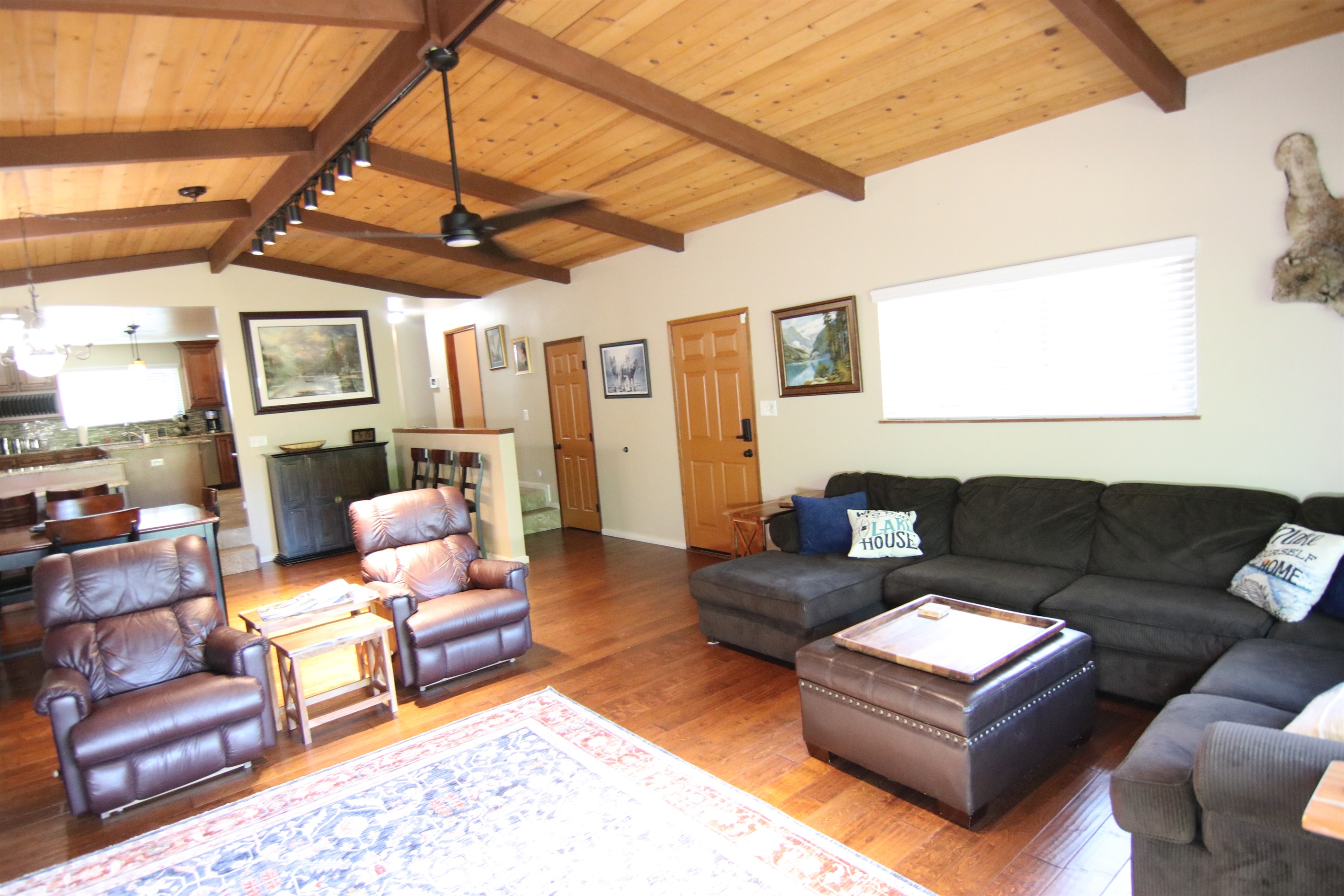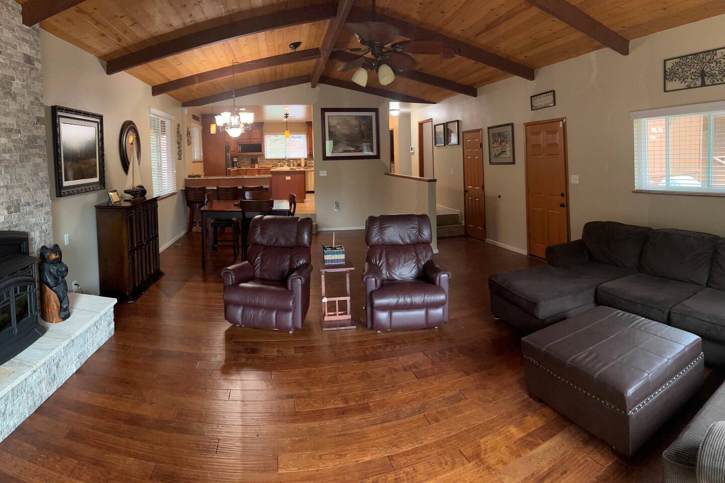 The "open" living area features leather couches, stone fireplace, high wood ceilings and views out to the large deck for entertaining.