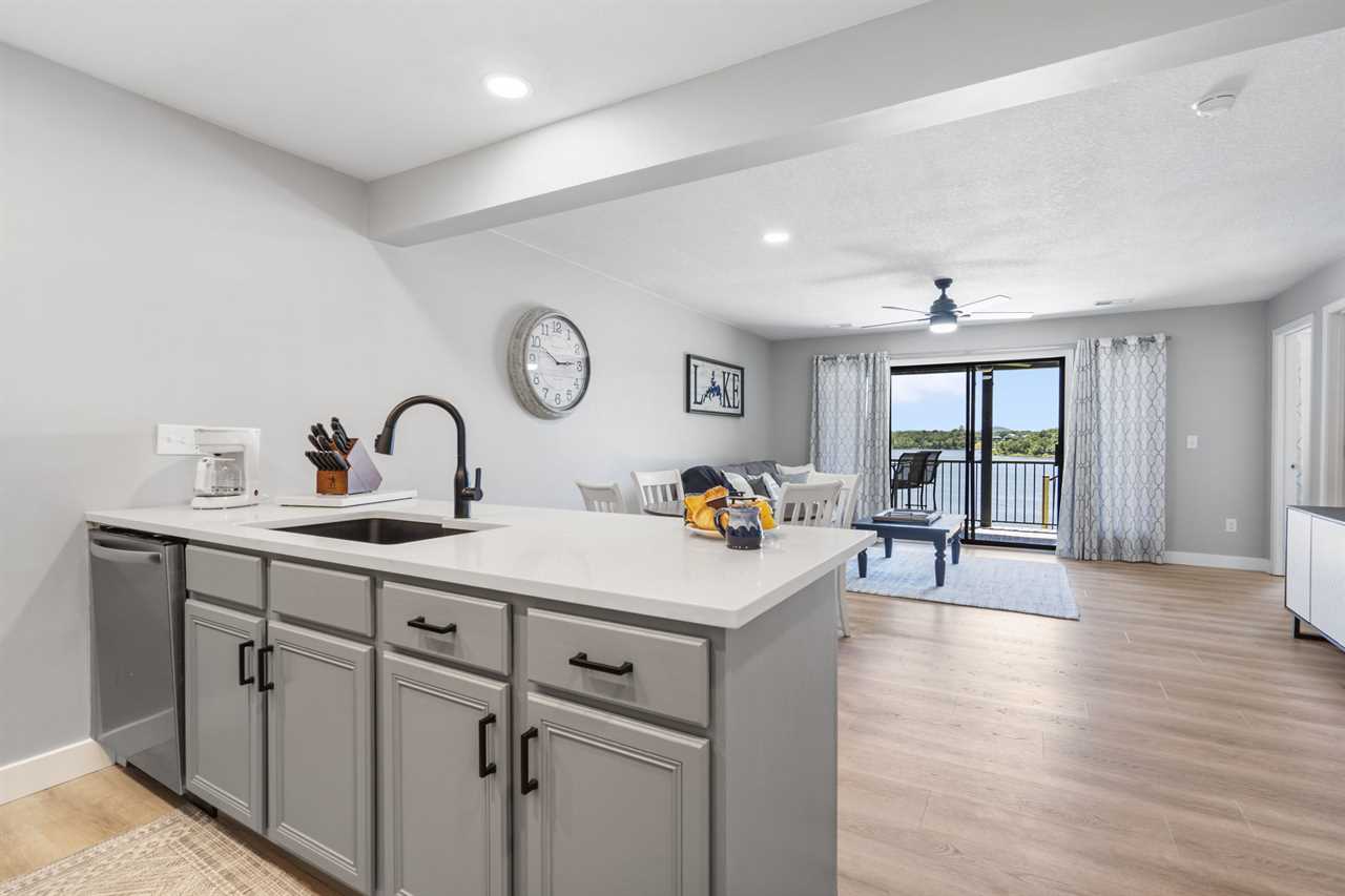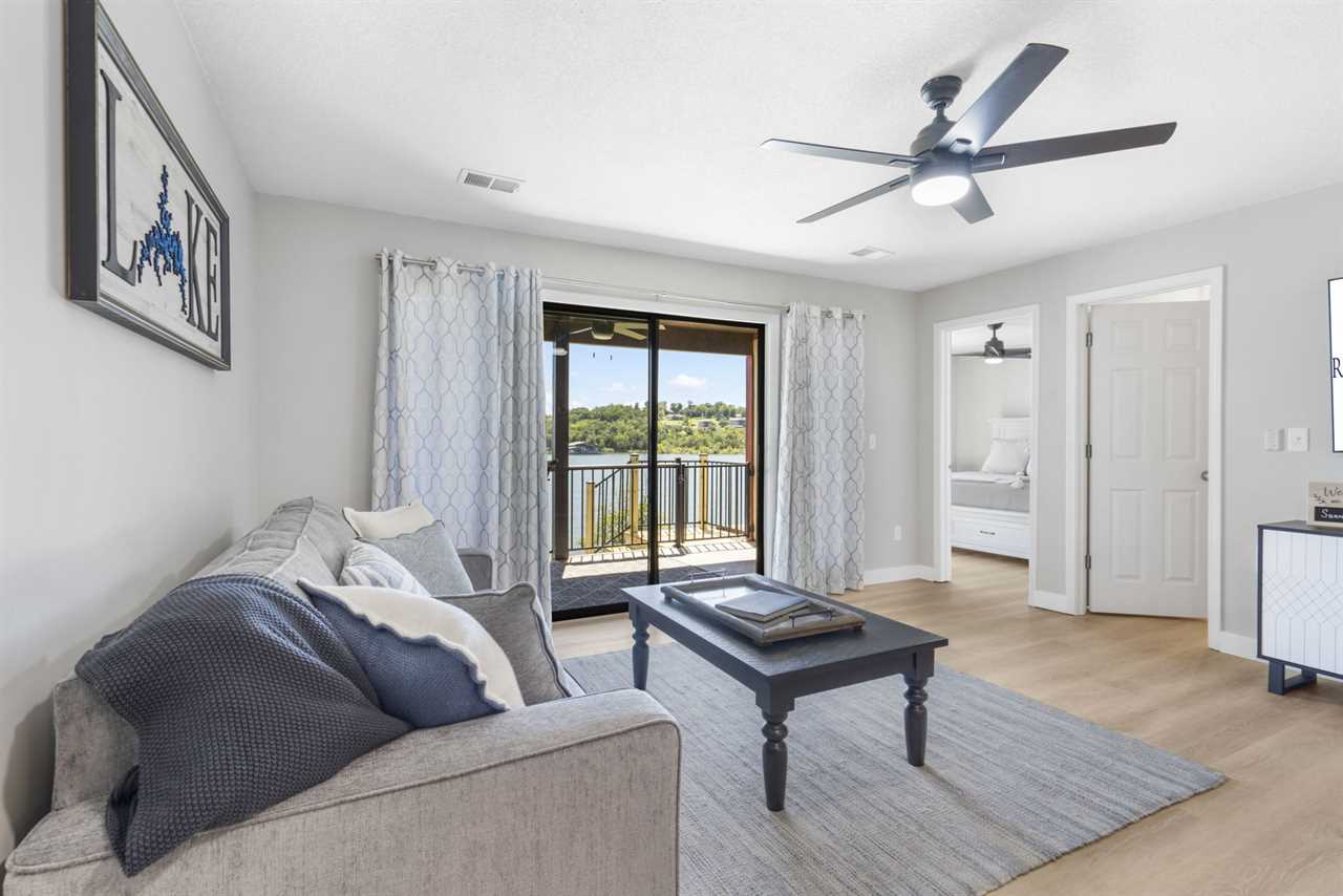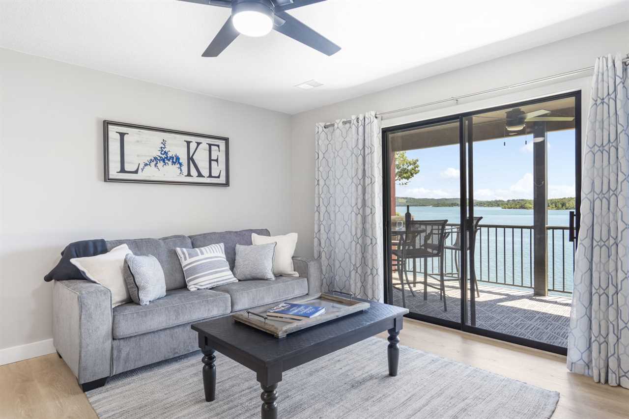 Inside you are greeted by the fully-equipped kitchen to your left. Enjoy your culinary creations at the dining table or cozy up in the spacious living area for a movie night. Just beyond the sliding glass doors, Table Rock Lake awaits you. You are steps from cooling off in the lake or casting your line for some dinner.