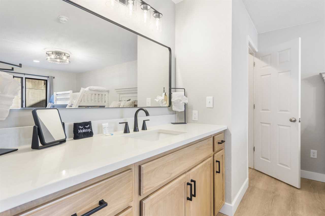 Back inside, you will find yourself refreshed in either of the two bedrooms. The master bedroom boasts a king bed, spacious ensuite bathroom, deck access, and an unparalleled lake view. The second bedrooms offers a queen bed, twin over full bunk, and an ensuite bathroom.