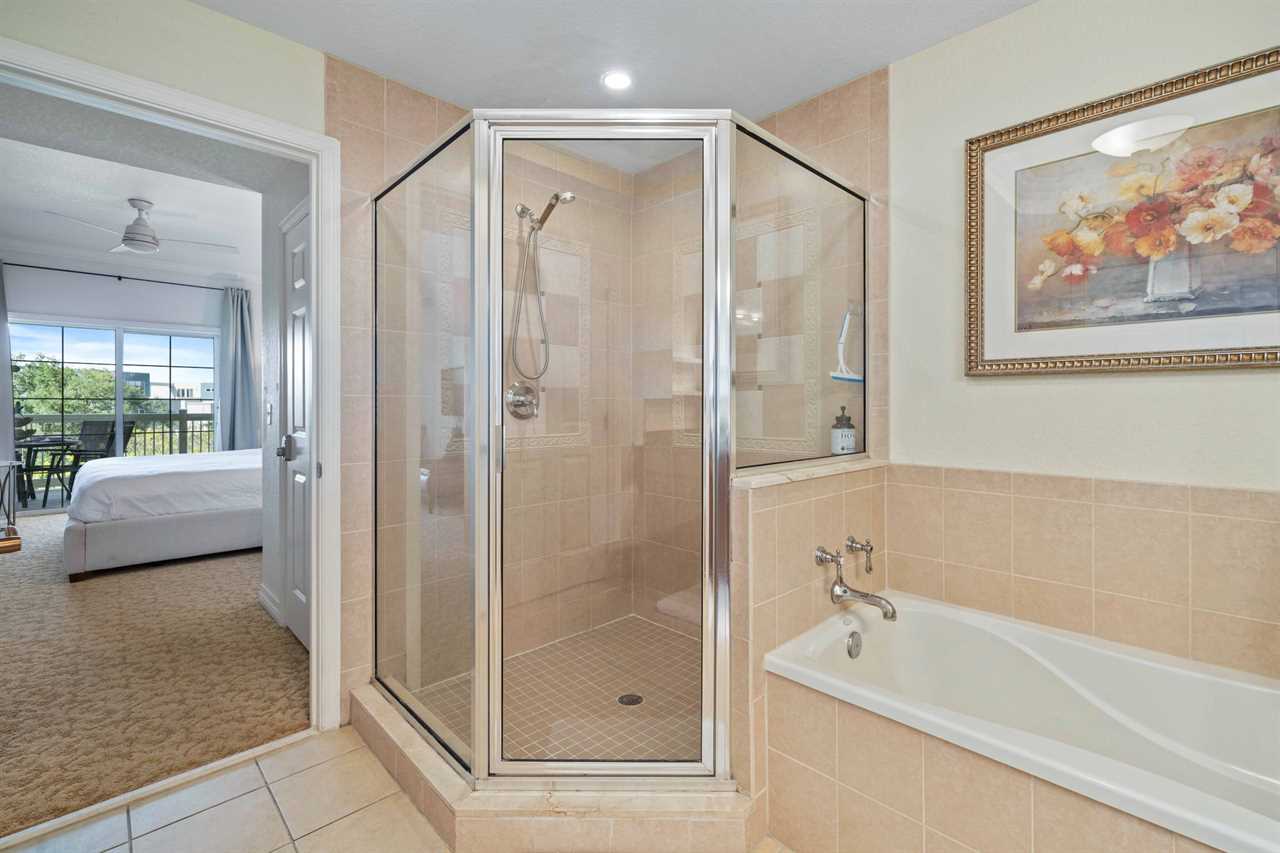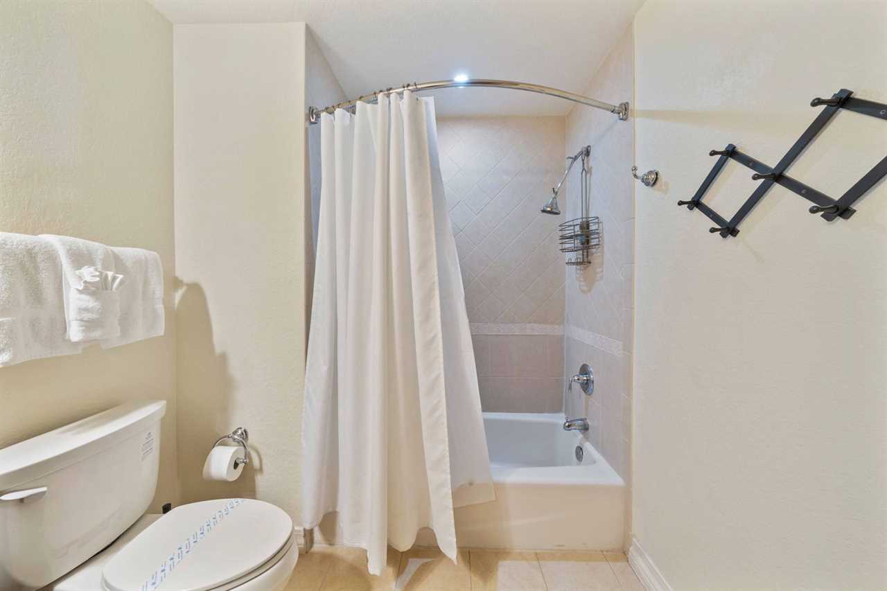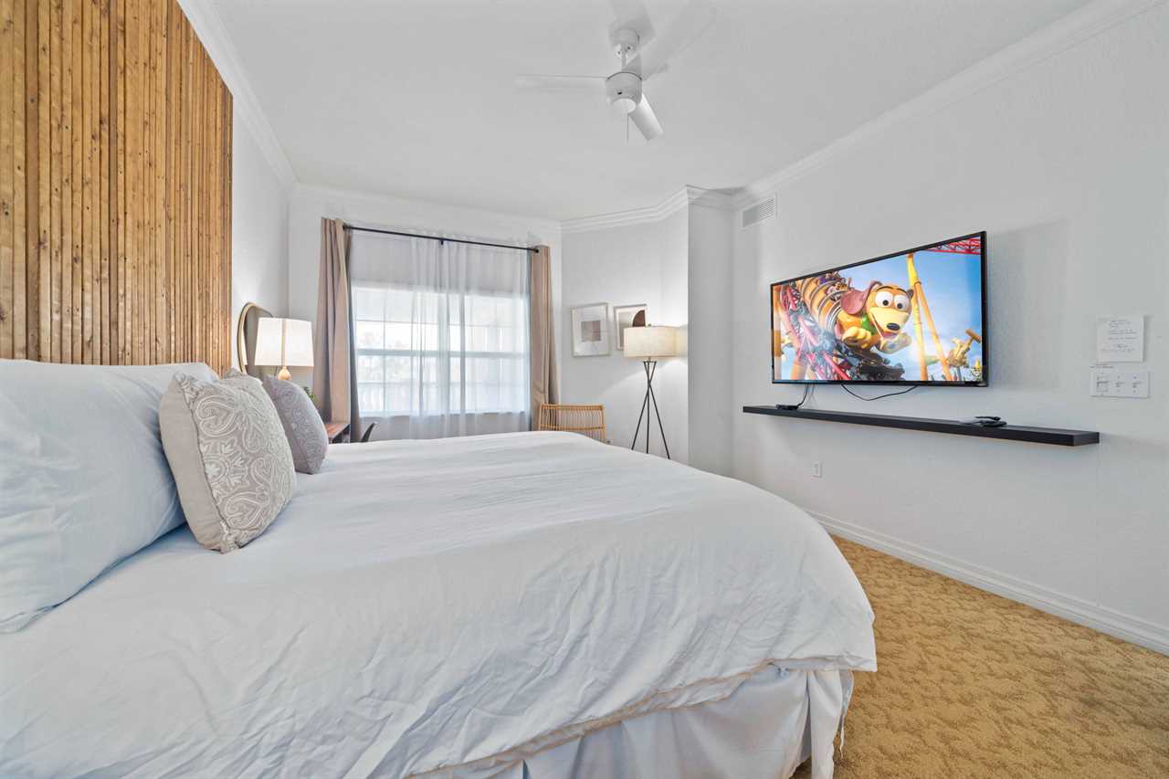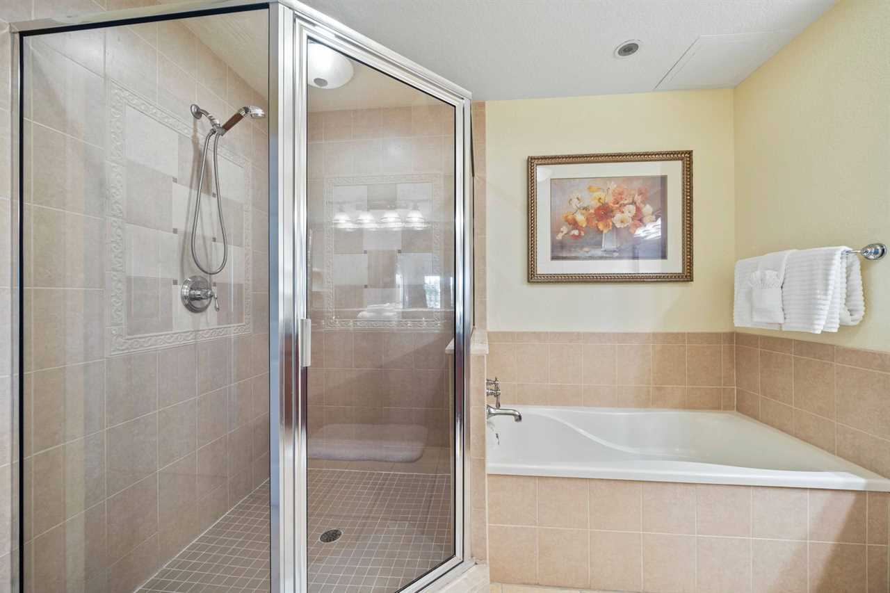 The condo features three spacious bedrooms, each offering a peaceful retreat for rest and relaxation. The left king master bedroom is equipped with a large wall-mounted smart TV, a desk with a chair, and a ceiling fan. The master bathroom features a tub/shower combo for your convenience. The queen master bedroom boasts similar amenities, including a large wall-mounted smart TV, as well as a tub/shower combo in the master bathroom. The back king master bedroom offers a serene oasis, with a wall-mounted smart TV with cable, a ceiling fan, and access to a balcony where you can enjoy the fresh air and scenic views. The master bathroom features a luxurious tub and shower combination.