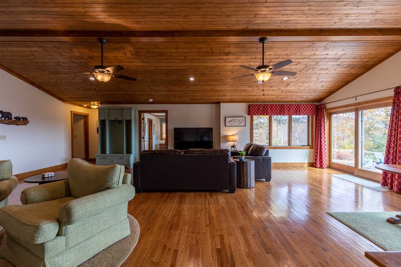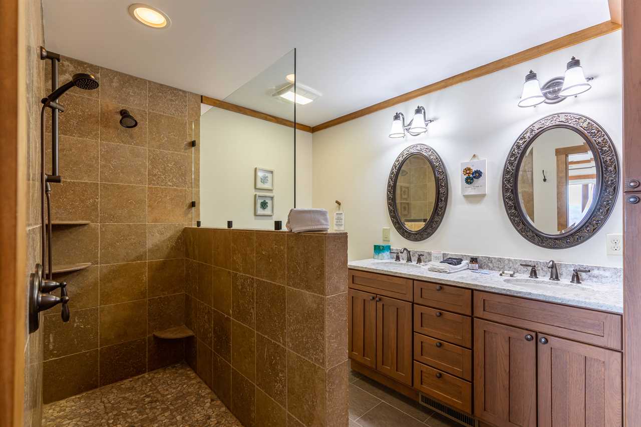 With everything situated on one level and just 3 steps to enter, this is an ideal home for guests with mobility concerns. All doorways are 36" wide and the two showers are zero entry. The open great room features vaulted tongue & groove ceilings, a gas fireplace, a 65” TV offering the highest cable package available, cozy leather furnishings, and deck access. The leather sofa situated at the TV is also a queen sleeper sofa. The space flows into the kitchen with unique concrete and recycled glass counters, stainless steel appliances, and dining table for 8 with room for 2 more at the kitchen island.