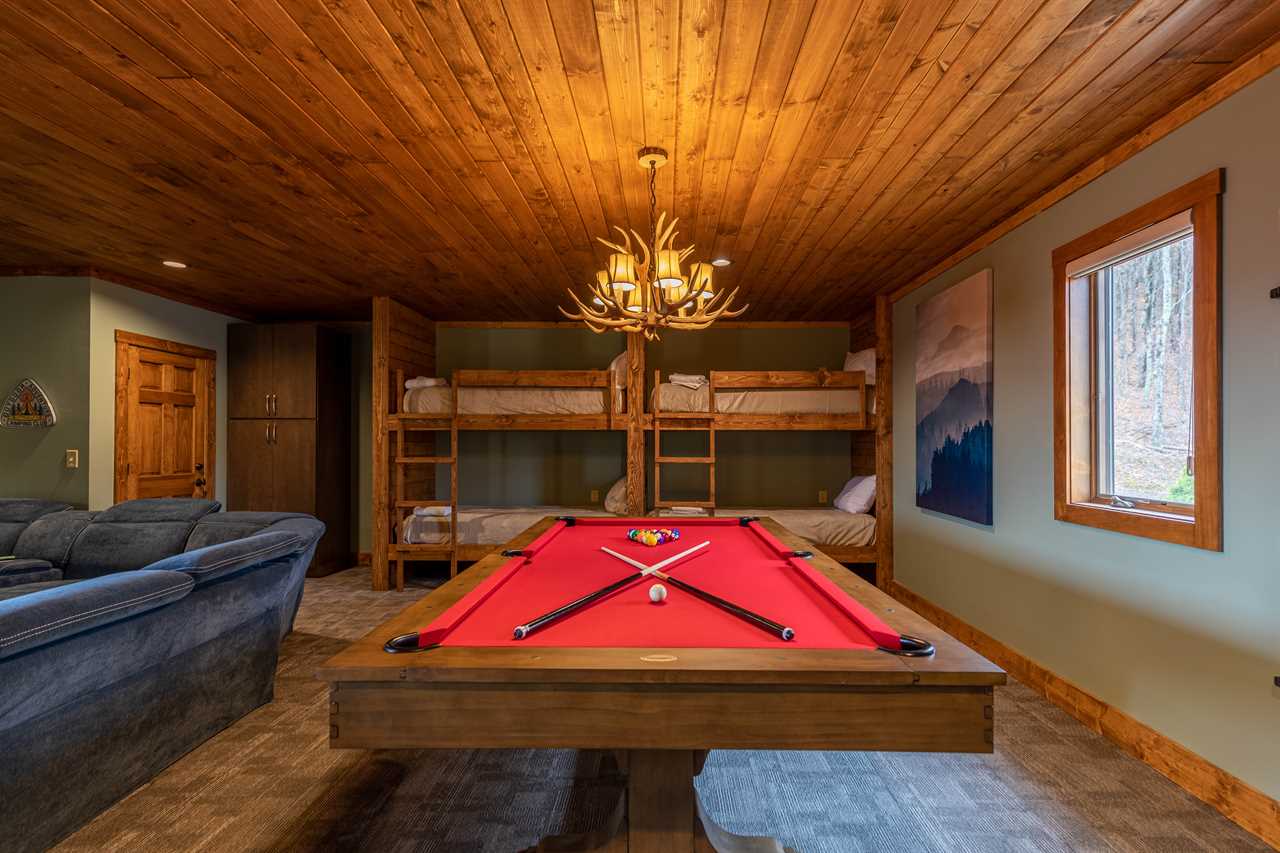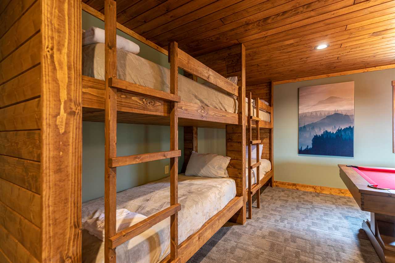 Lookout Lodge offers three beautiful King bedrooms, each with a full bath attached. Off of the kitchen is the laundry center, a half bath. Next to that is the game room. Here you can catch the game on the 85" TV while lounging on the large sectional with queen sleeper sofa. During halftime, shoot a round of pool or make some snacks over at the fridge and microwave. This fun room also offers two sets of XL Twin over Twin bunks.