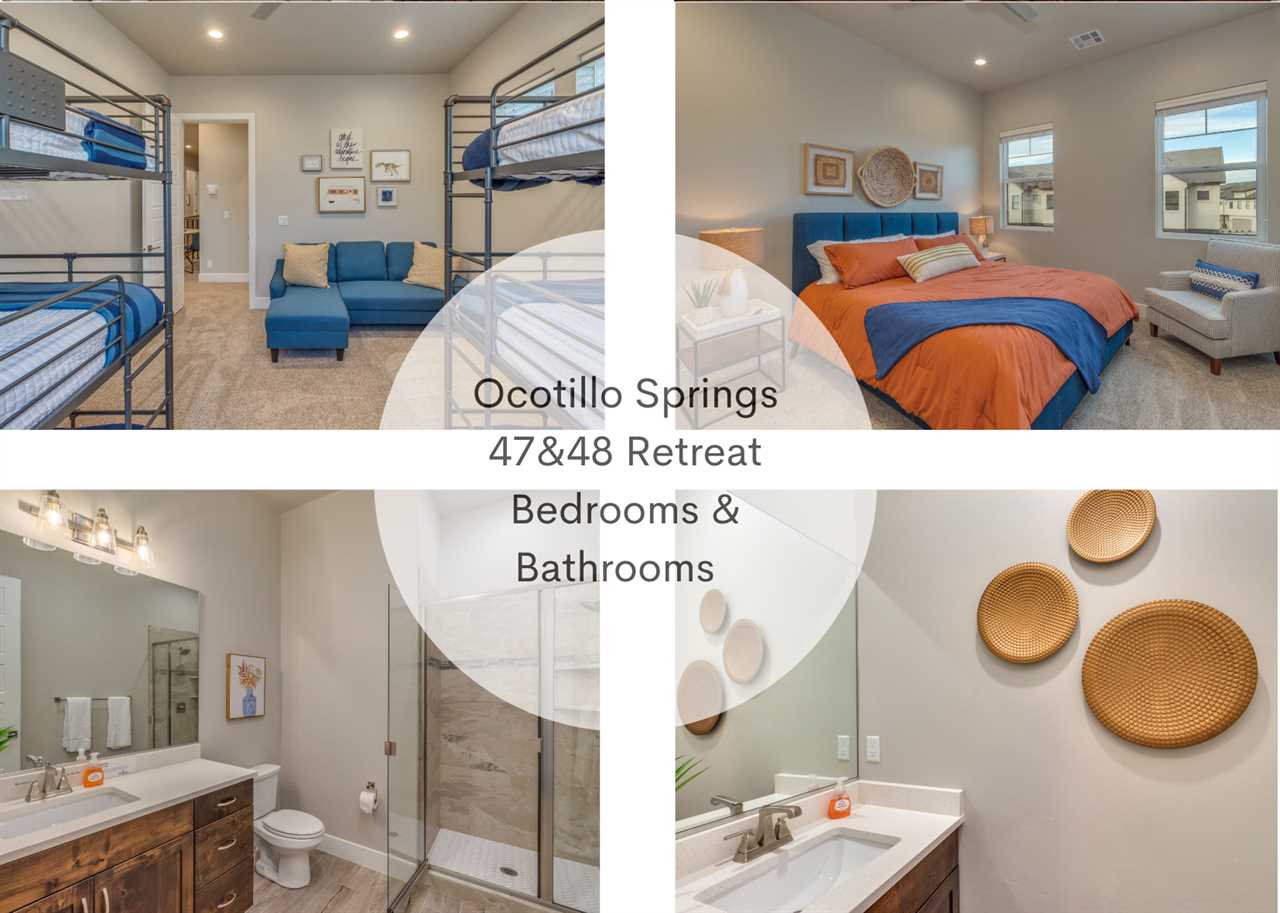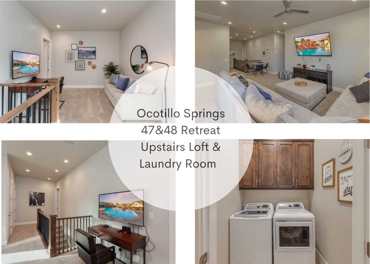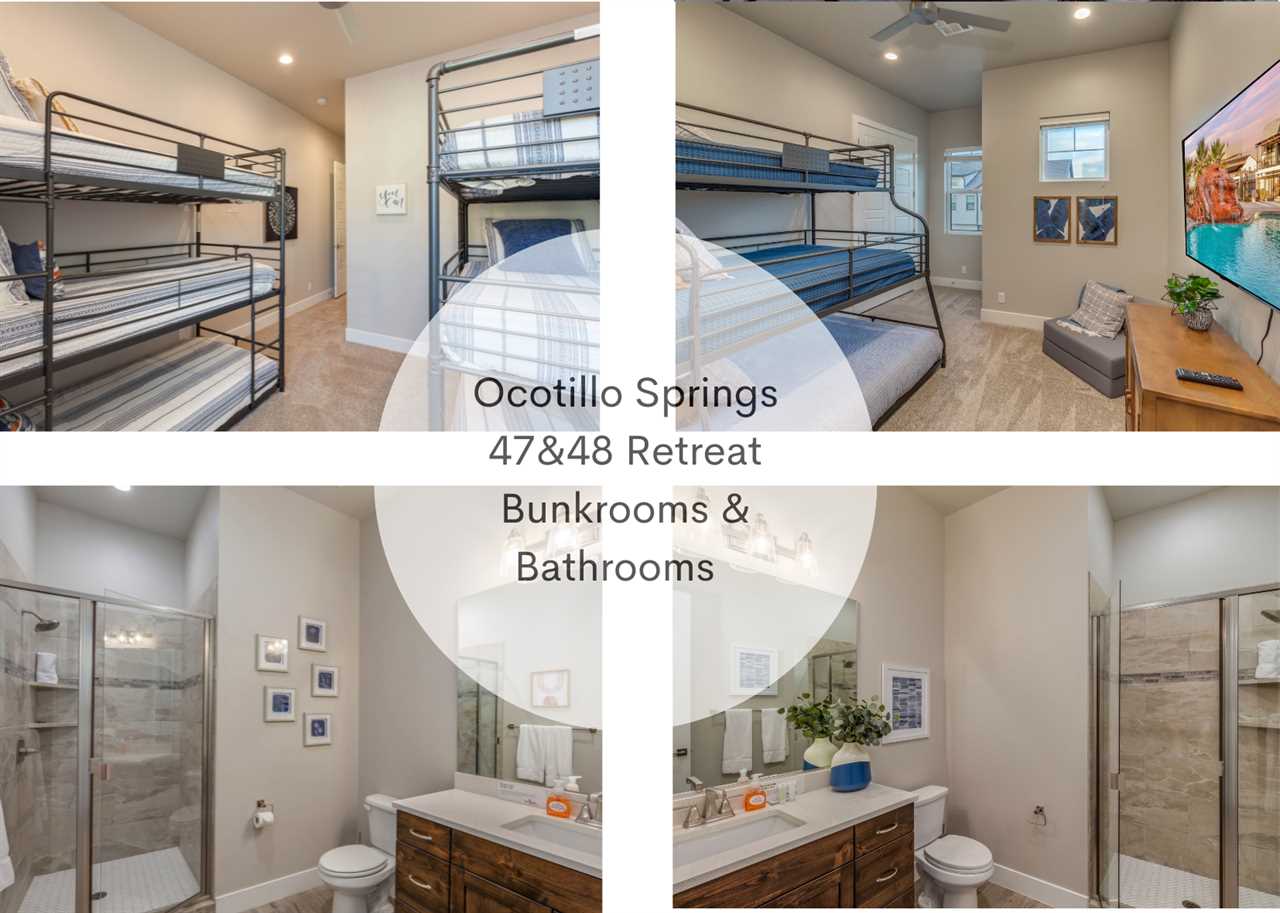 This gorgeous 5 bedroom/ 5.5 bathroom home can comfortably sleep 17 guests but up to 19 with the use of the sleeper sofa. The master bedroom has a king-size bed, Samsung TV, a private bathroom with a walk-in shower and soaker tub, and private access to the backyard pool/ spa. Bedrooms 2 & 3 each include a king-size bed, Samsung TV, and a private bathroom with a walk-in shower. Bedroom 4 is the first of the 2 bunk rooms, with 1 Twin/Full/ Queen bunk bed, Samsung TV, and a private bathroom with a walk-in shower. The last bedroom, just off the spacious loft, is the second of the 2 bunk rooms and it contains 2 triple tier twin bunk beds (6 twins) and a full sleeper sofa. This bedroom shares a bathroom with the loft and has a shower/ tub combo. You will also find a porta-crib provided for your use. As the sun sets, come home after a day full of adventure and relax in your private pool and hot tub. Host a game night by challenging each other to games on the Nintendo Switch, playing card/ board games, or having a ping pong tournament! With countless local wonders to visit, as well as gorgeous on-site amenities, Oasis at Ocotillo Springs is sure to be a favorite vacation destination for years to come!