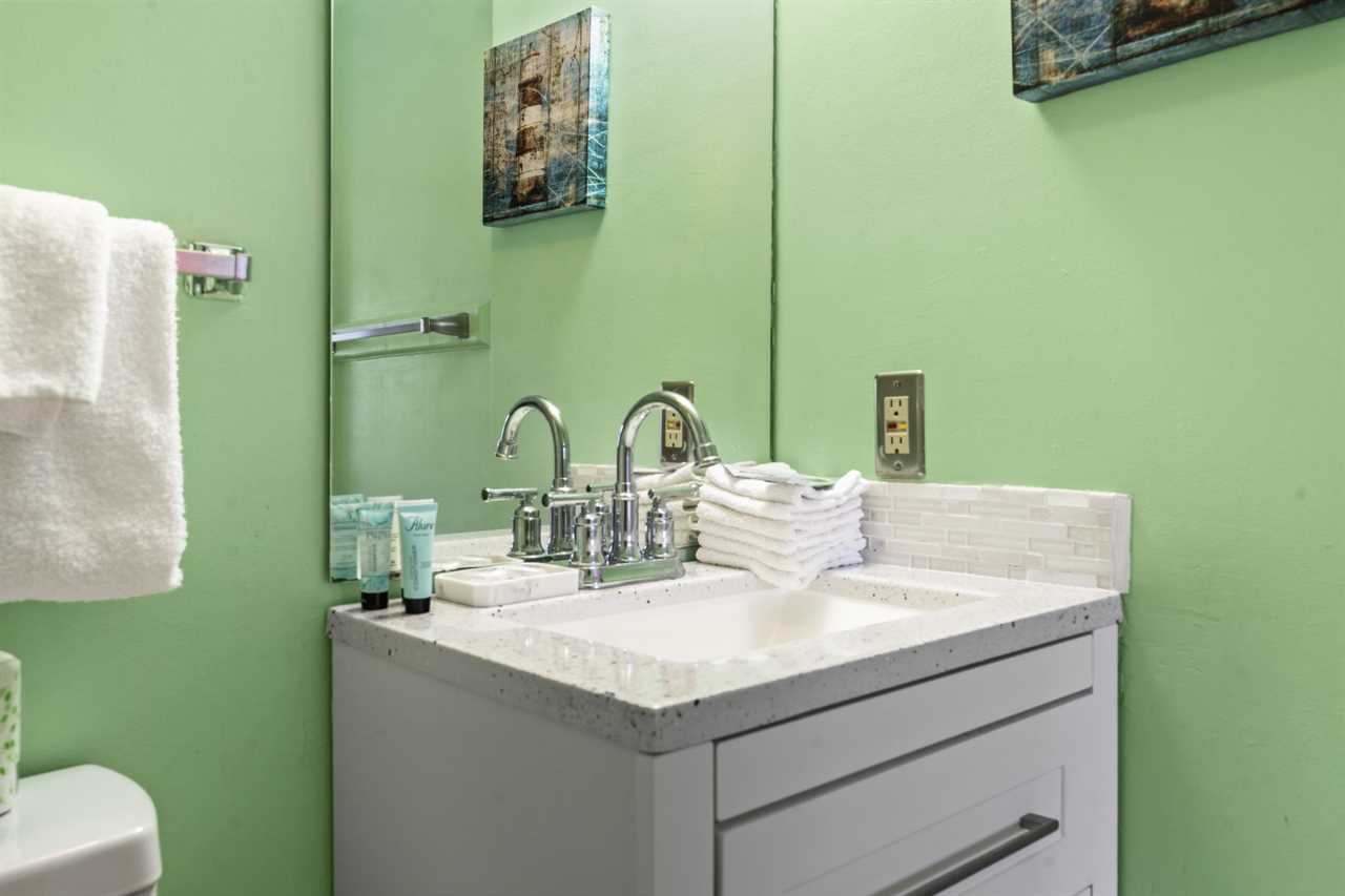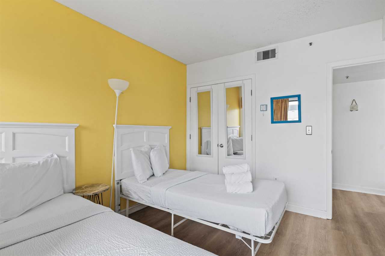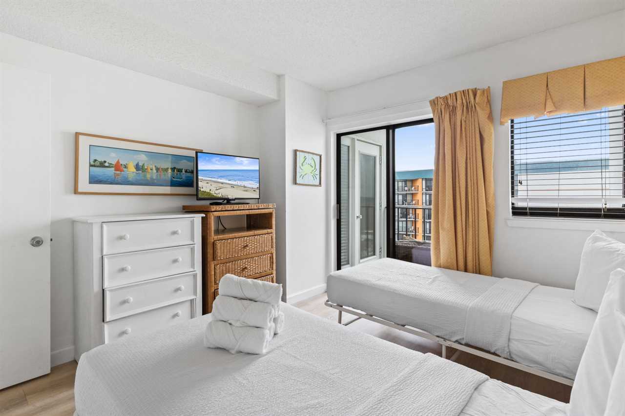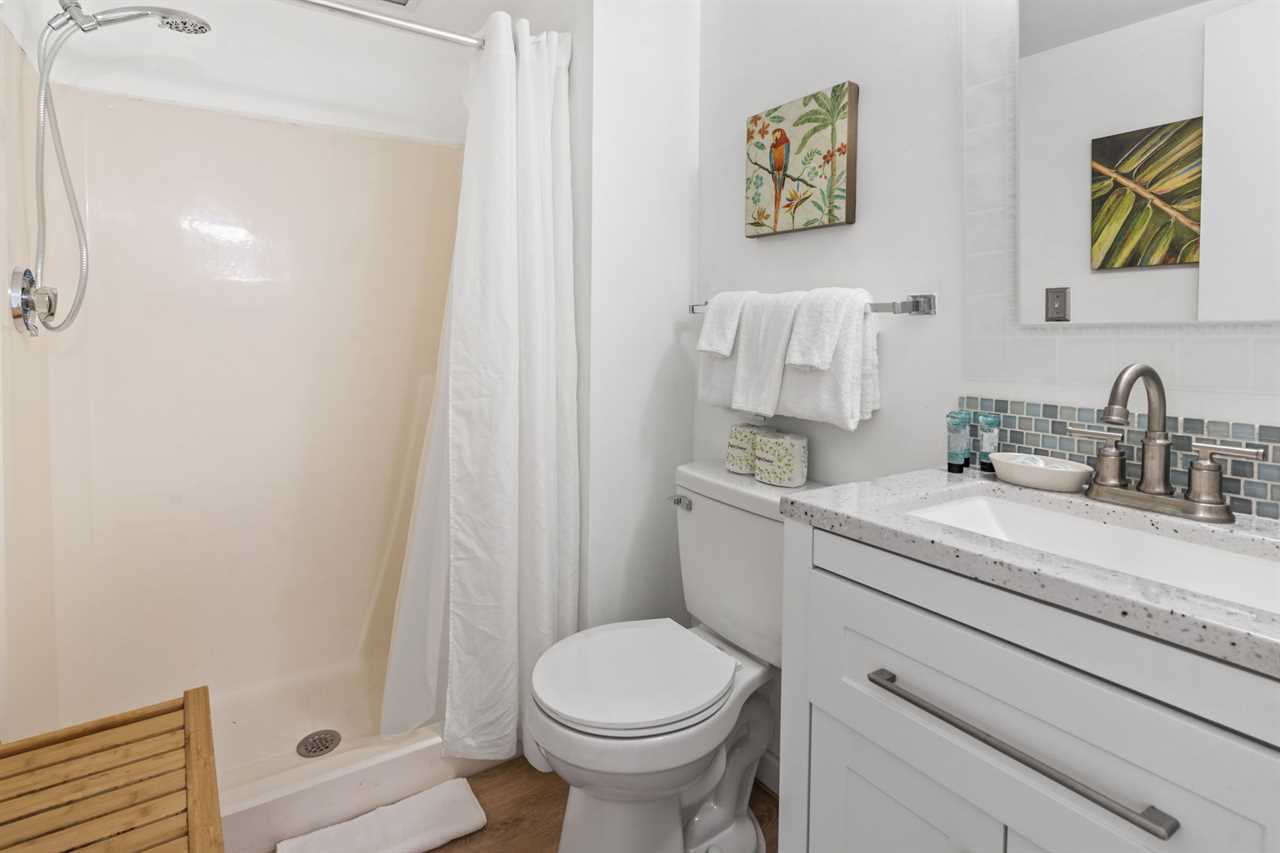 Upon arrival, guests will enter into the kitchen and living room area. Directly to the right is where the guest bedroom and guest bathroom are located. The guest bedroom features two twin sized beds, a nightstand between the beds, two dressers for storage, a flatscreen TV, access to the private ocean view balcony through the sliding glass doors, and access to the bathroom right outside the bedroom. The bathroom features a standing shower, new vanity, mirror, and toilet.