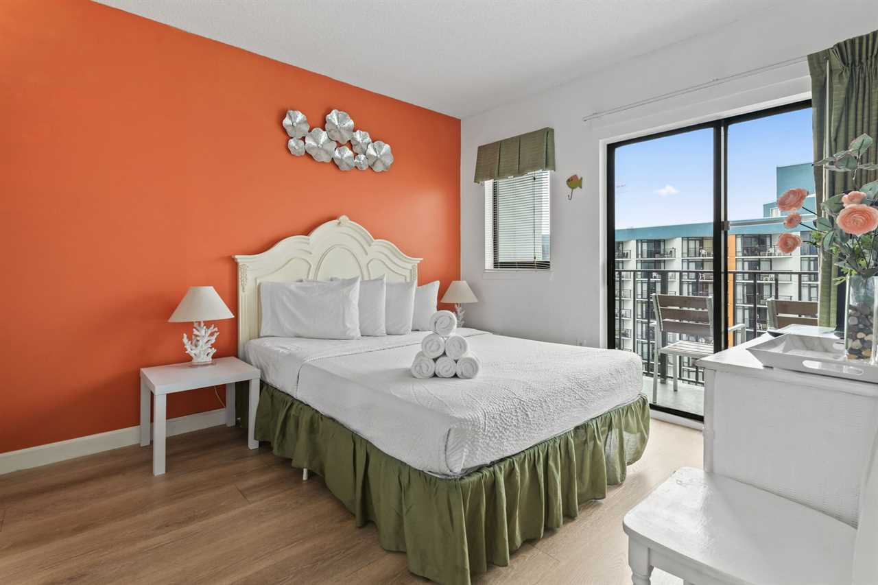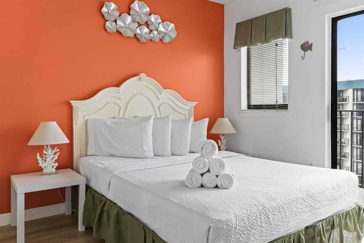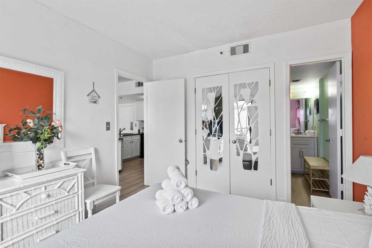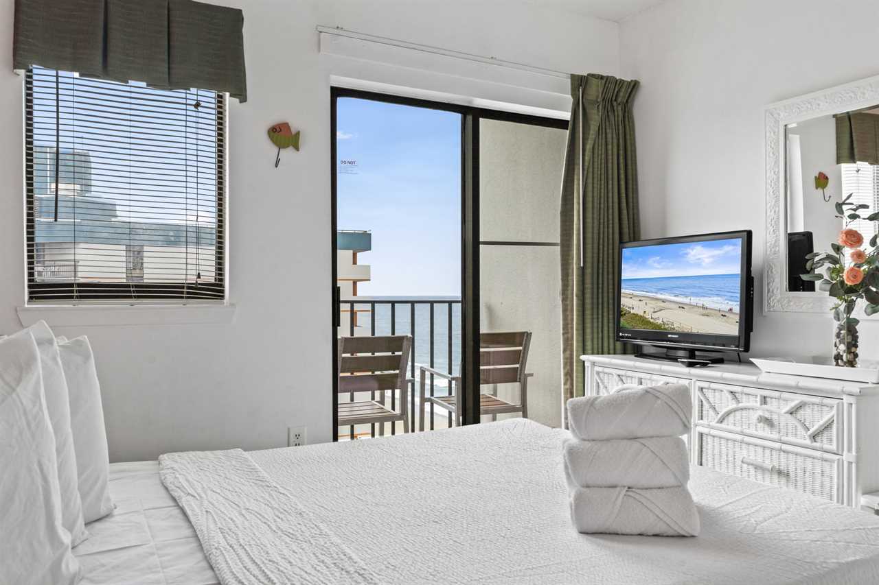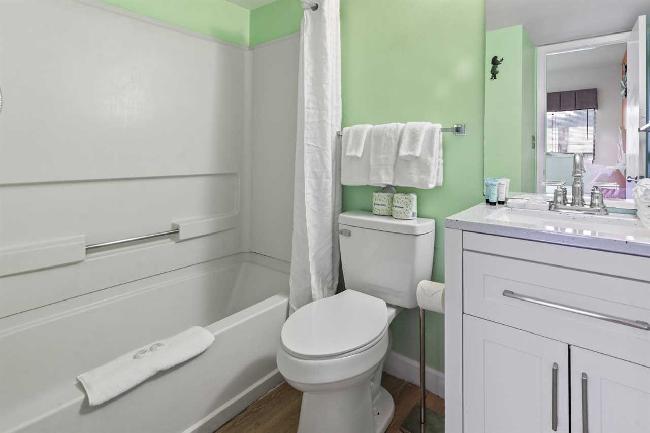 Across from the living and kitchen area guests will find the master bedroom. This bedroom features a queen-sized bed, two nightstands, dresser for storage, flat screen TV, access to the second ocean view balcony through the sliding glass door, and access to the ensuite bathroom. This bathroom features a tub/shower combo, new vanity, mirror, and toilet.