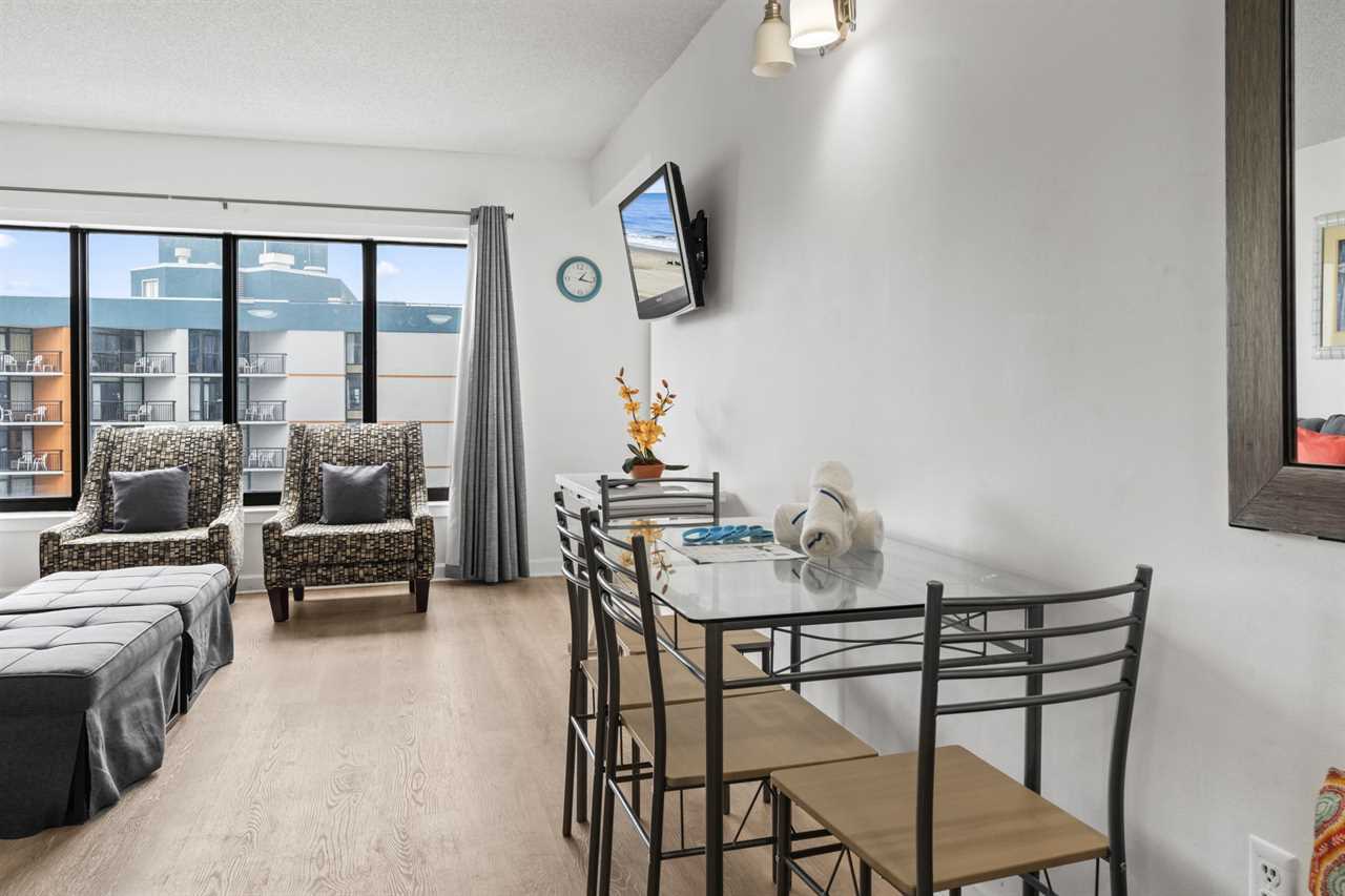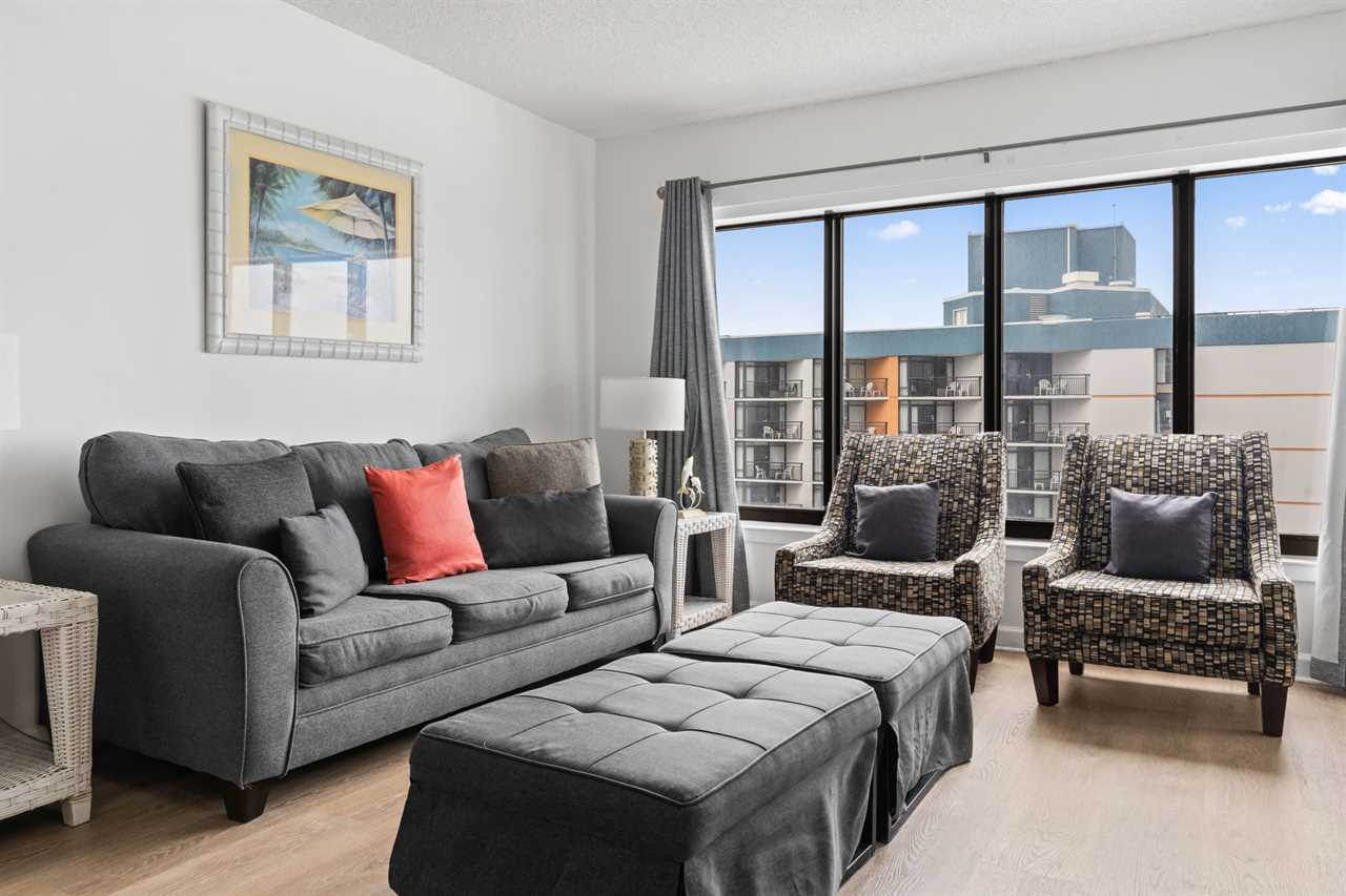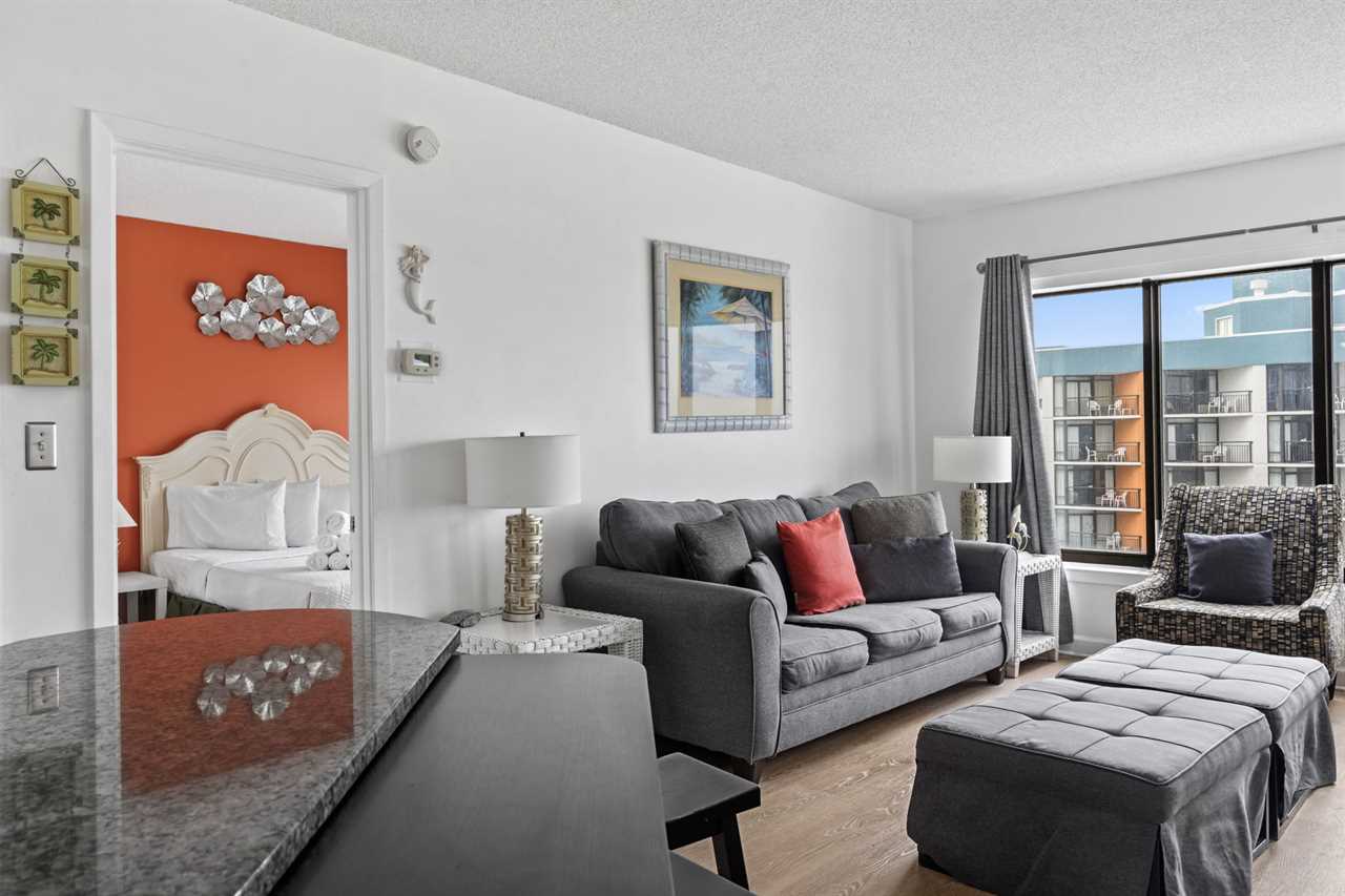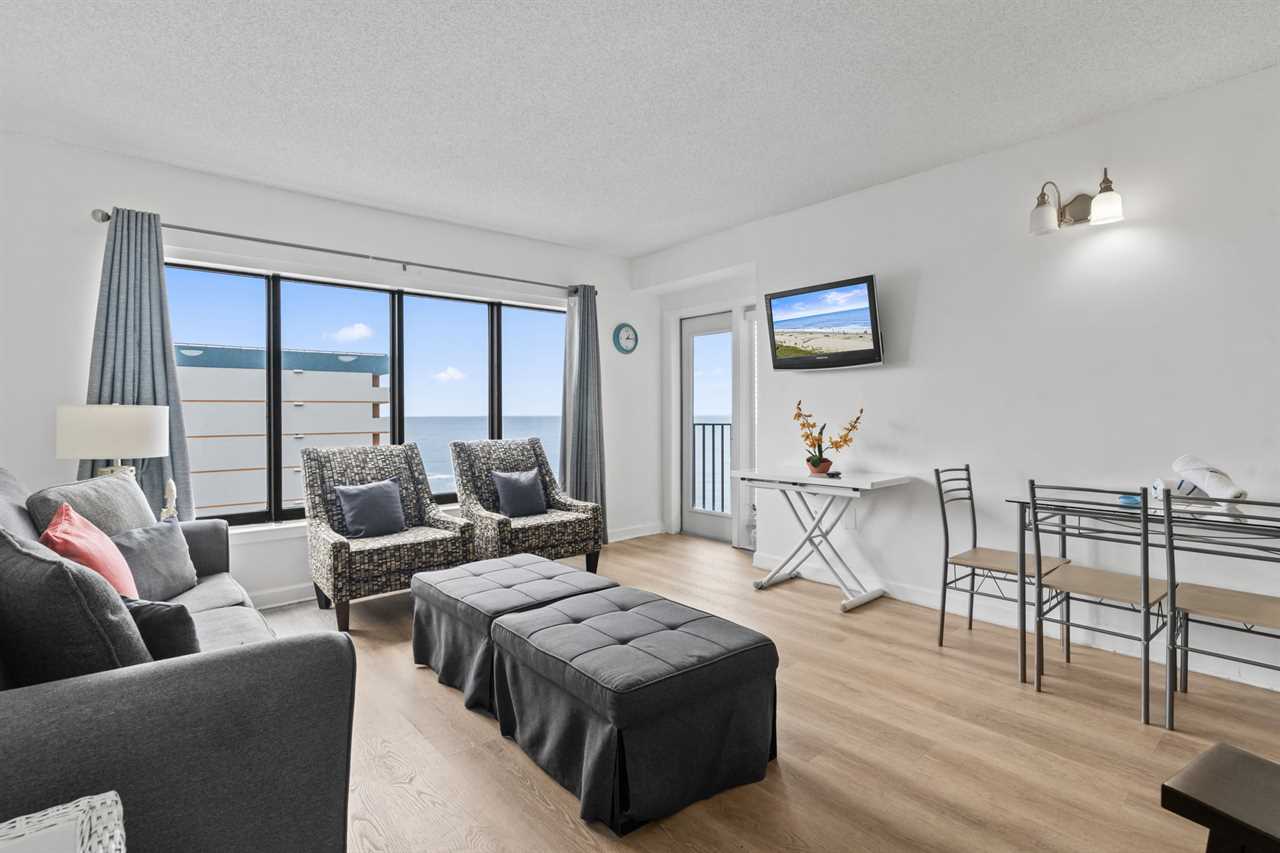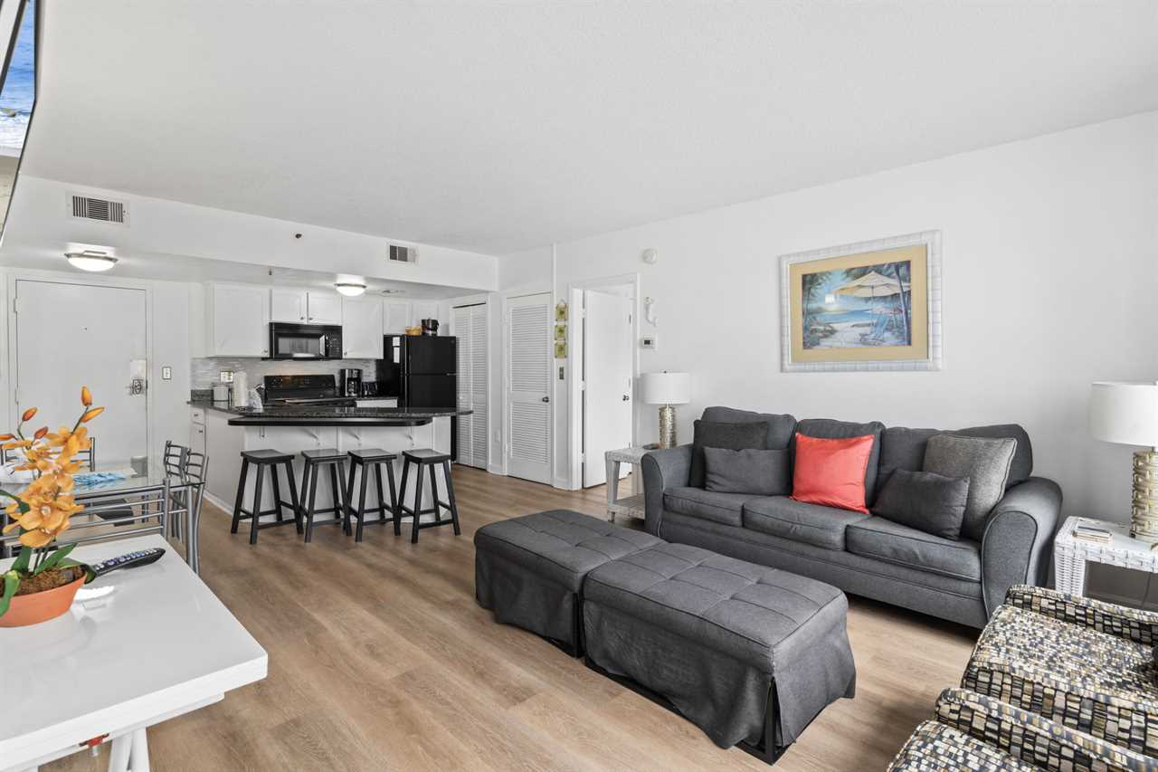 Just past the kitchen is the main living space which is the most relaxing part of the entire condo! This area features two large couches, one of which is a sleeper sofa, multiple accent chairs, two side tables, a coffee table, large wall mounted flatscreen TV, glass dining table with enough seating to accommodate 4 guests, and access to the private ocean view balcony!