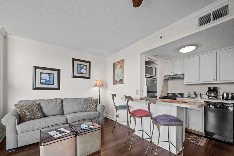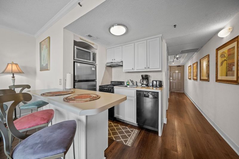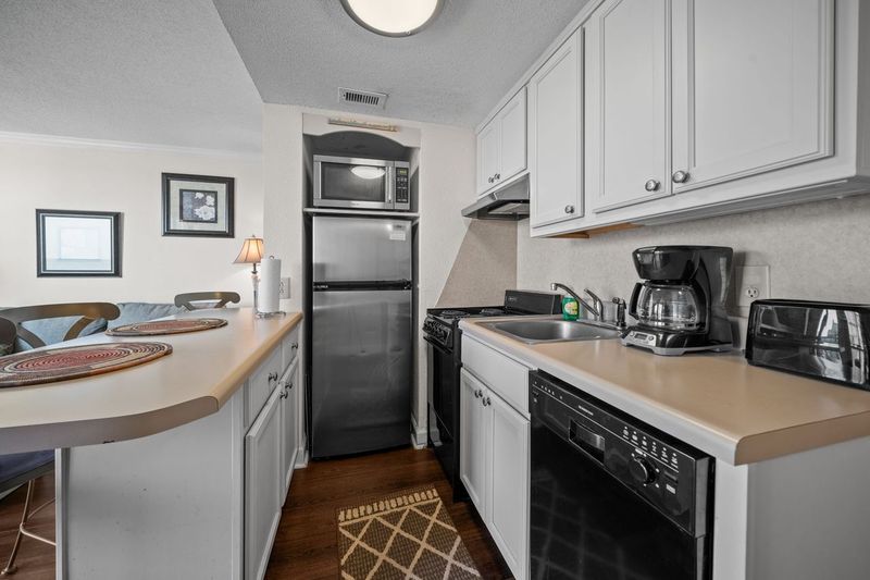 Entering into the kitchen, guests will have access to full size appliances. The kitchen features a full-size fridge/freezer, microwave, oven/stove, dishwasher, toaster, coffee maker, and plentiful cabinet space. Our guests love the fact they can easily cook a meal or a snack right from the condo! We provide all basic cookware, kitchen necessities, utensils, glassware, and more. For guests who prefer to dine out, the Meridian Plaza is within a short walk or ride to many of Myrtle Beach's most popular dining outlets. Food delivery services like Uber and DoorDash are also very popular options as well. The kitchen offers a full-size fridge, microwave, stove/oven, sink, and more.