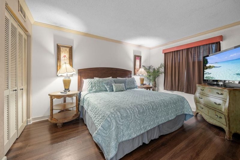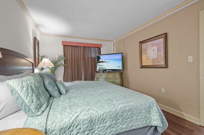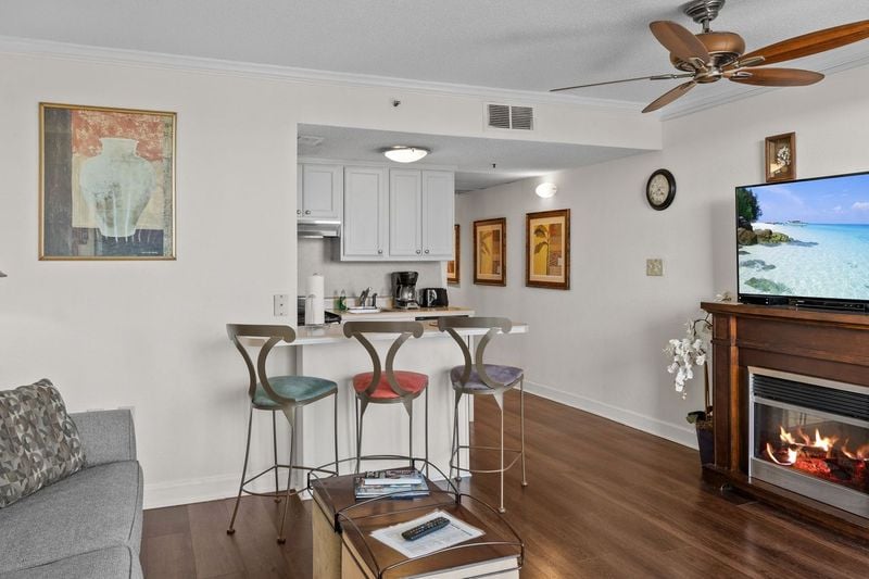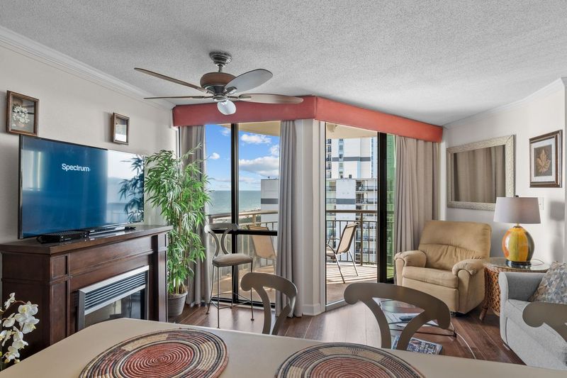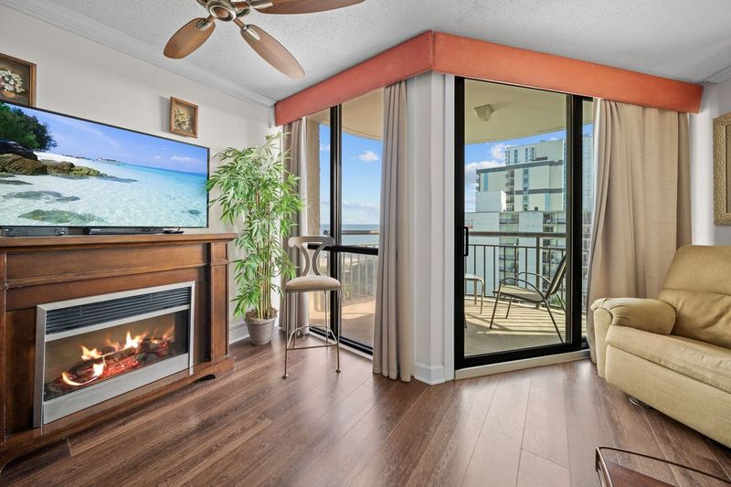This 1-bedroom apartment was updated and has several unique features! For starters beautiful luxury LVP flooring was installed throughout the entire apartment. This vacation rental has interior glass doors that stretch across the entire wall leading to the round balcony, large flat screen TV in the living room, electric fireplace, and ceiling fan. Our guests will enjoy 1 queen sized bed in the bedroom, 1 full bathroom, living room with endless ocean views, full kitchen, cabinets with plentiful storage space, and so much more!