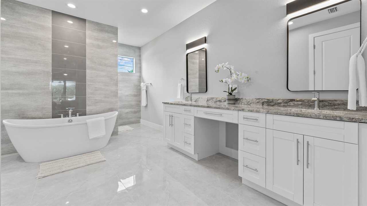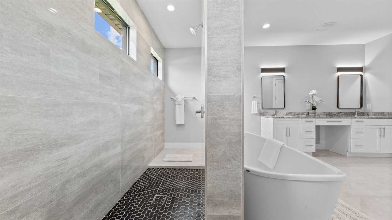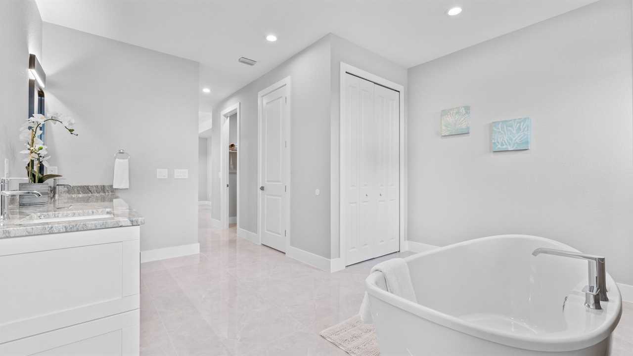 King Master Bedroom: Spacious suite with a king-size bed and streaming TV. Master bath features dual vanities, huge walk around shower, and soaking tub.