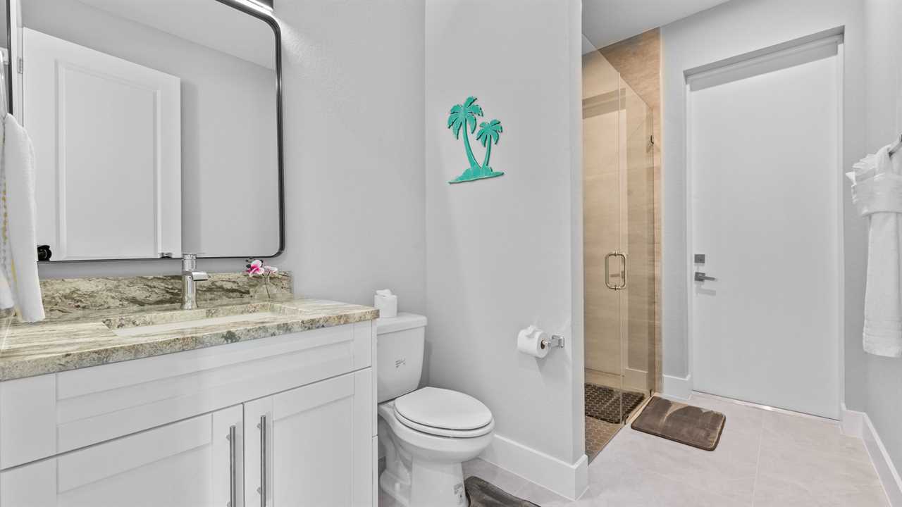 Guest/Pool Bath: Both guest bedrooms share this bathroom with a walk-in shower that also has access to pool and lanai area.