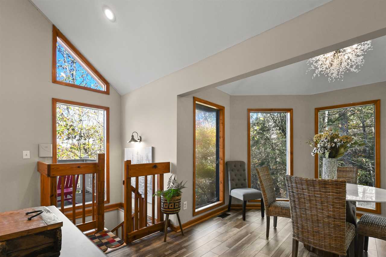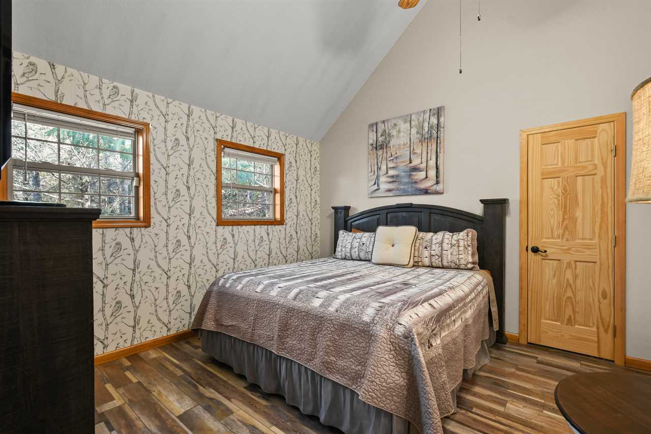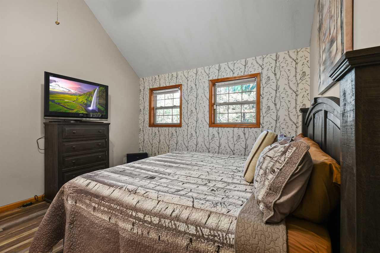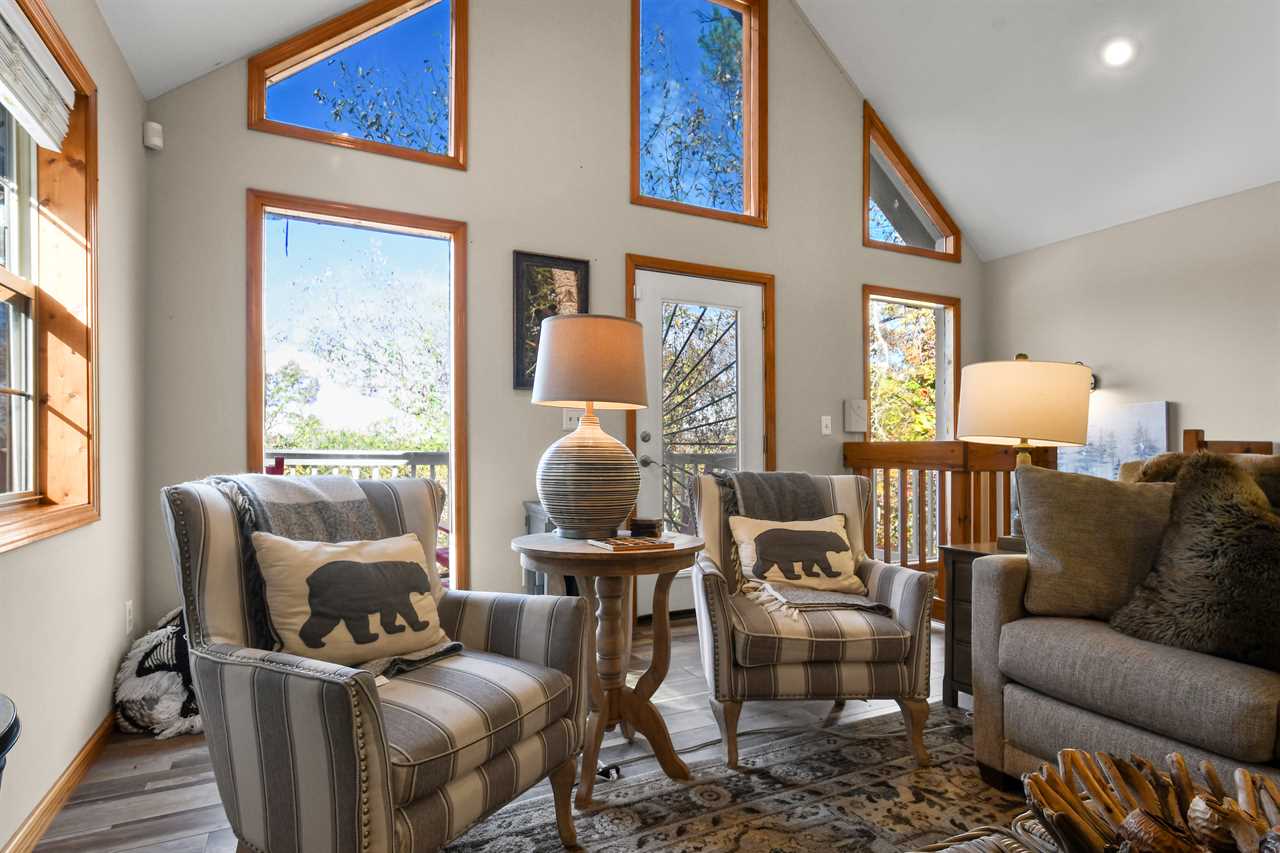 The living room offers a perfect blend of comfort and style. It features an open floor plan accentuated by large windows that fill the space with natural lighting. The modern decor sets a chic tone, complemented by a cozy sofa sleeper for extra accommodations. Two accent chairs provide additional seating, while a flat-screen TV ensures entertainment for all. The wood-burning fireplace adds warmth and charm, creating an inviting atmosphere. Enjoy seamless access to the deck, making it easy to embrace the beauty of nature just outside.