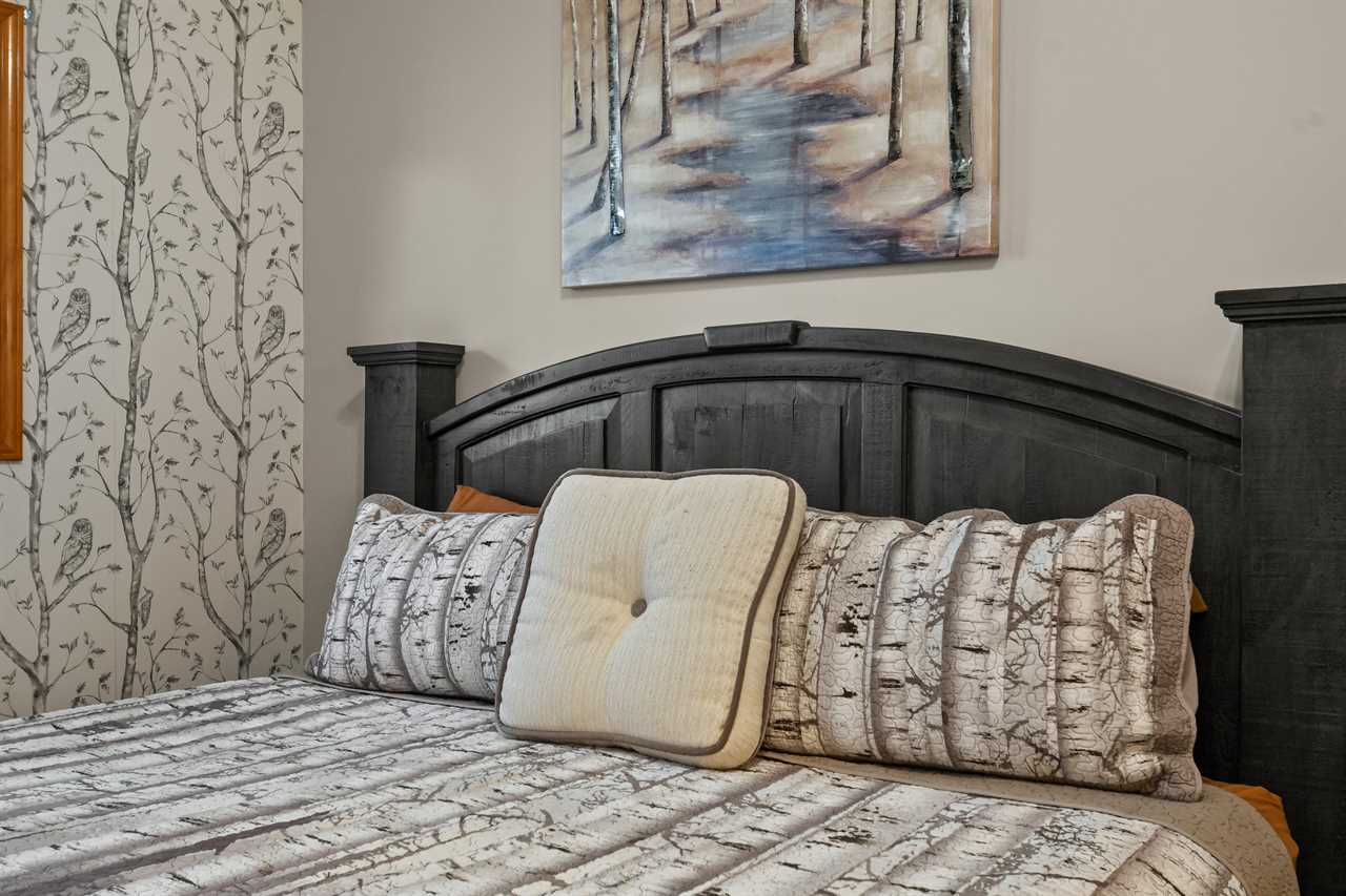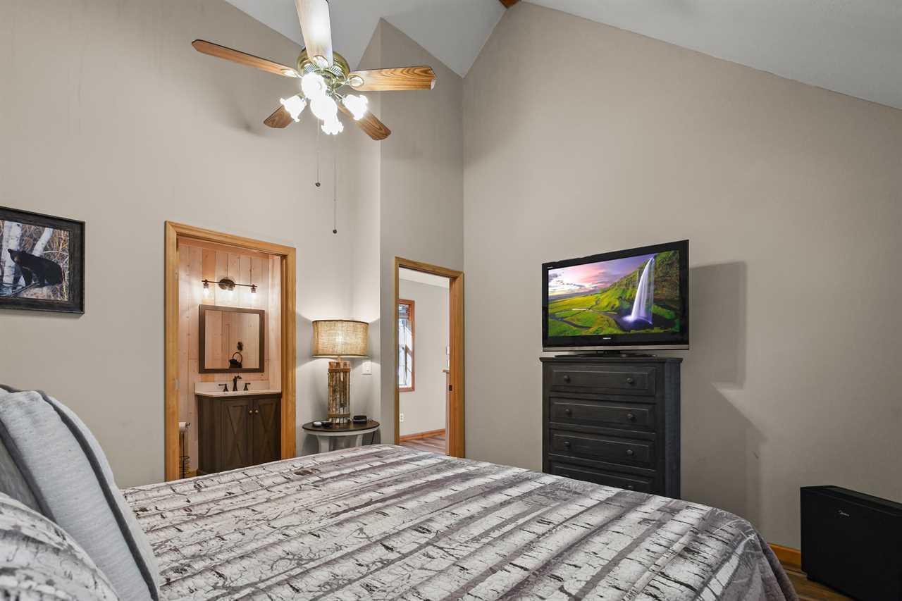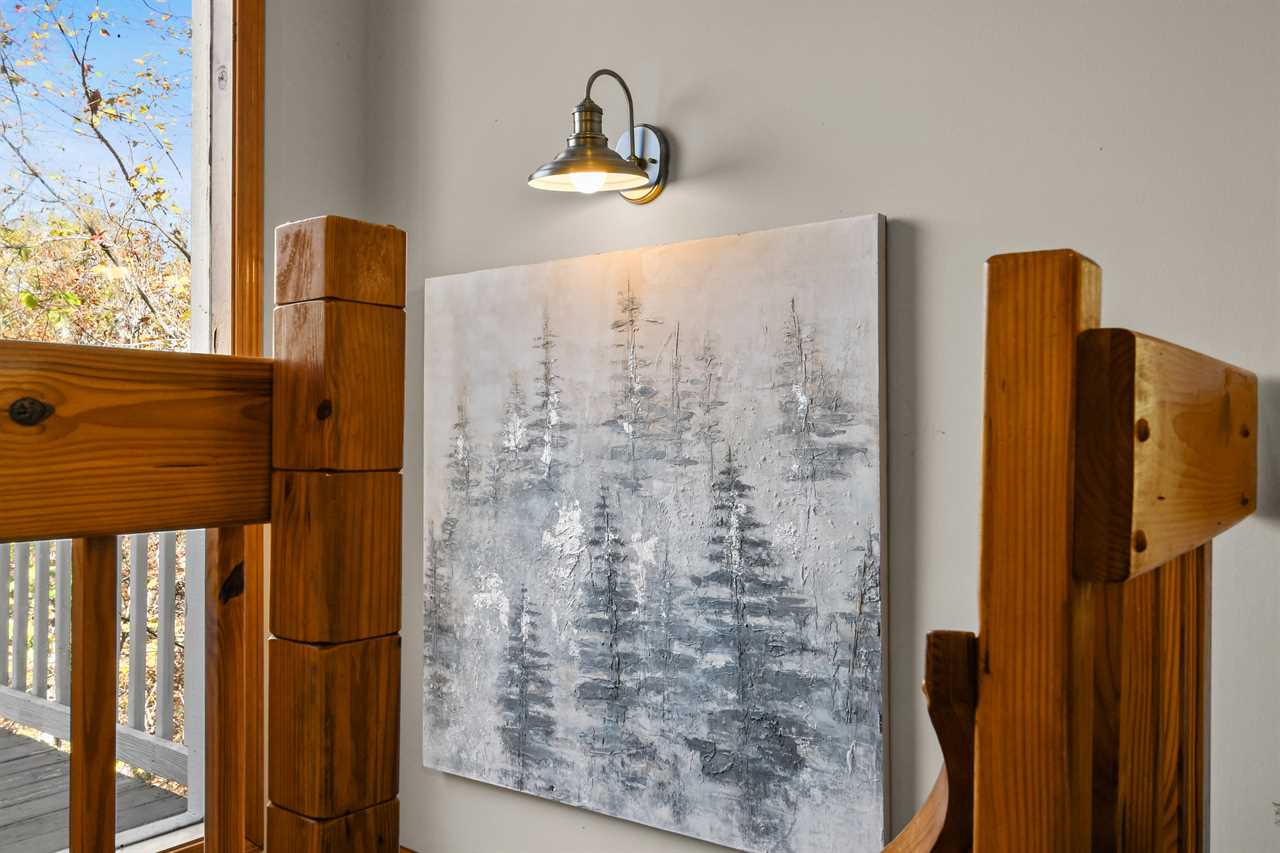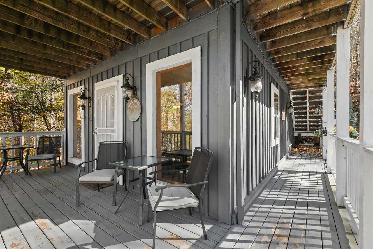 The living room offers a perfect blend of comfort and style. It features an open floor plan accentuated by large windows that fill the space with natural lighting. The modern decor sets a chic tone, complemented by a cozy sofa sleeper for extra accommodations. Two accent chairs provide additional seating, while a flat-screen TV ensures entertainment for all. The wood-burning fireplace adds warmth and charm, creating an inviting atmosphere. Enjoy seamless access to the deck, making it easy to embrace the beauty of nature just outside.
