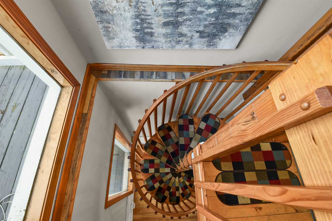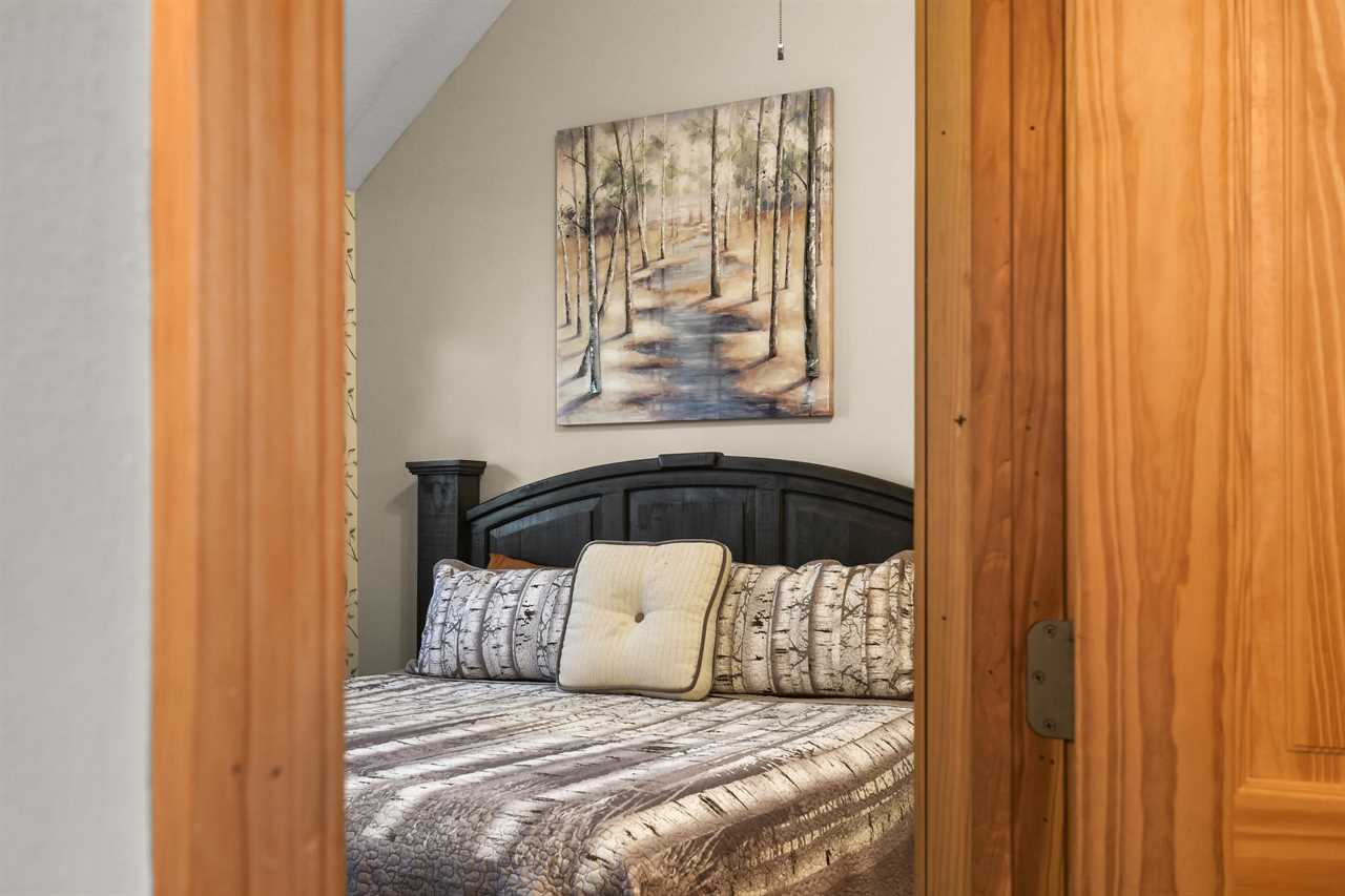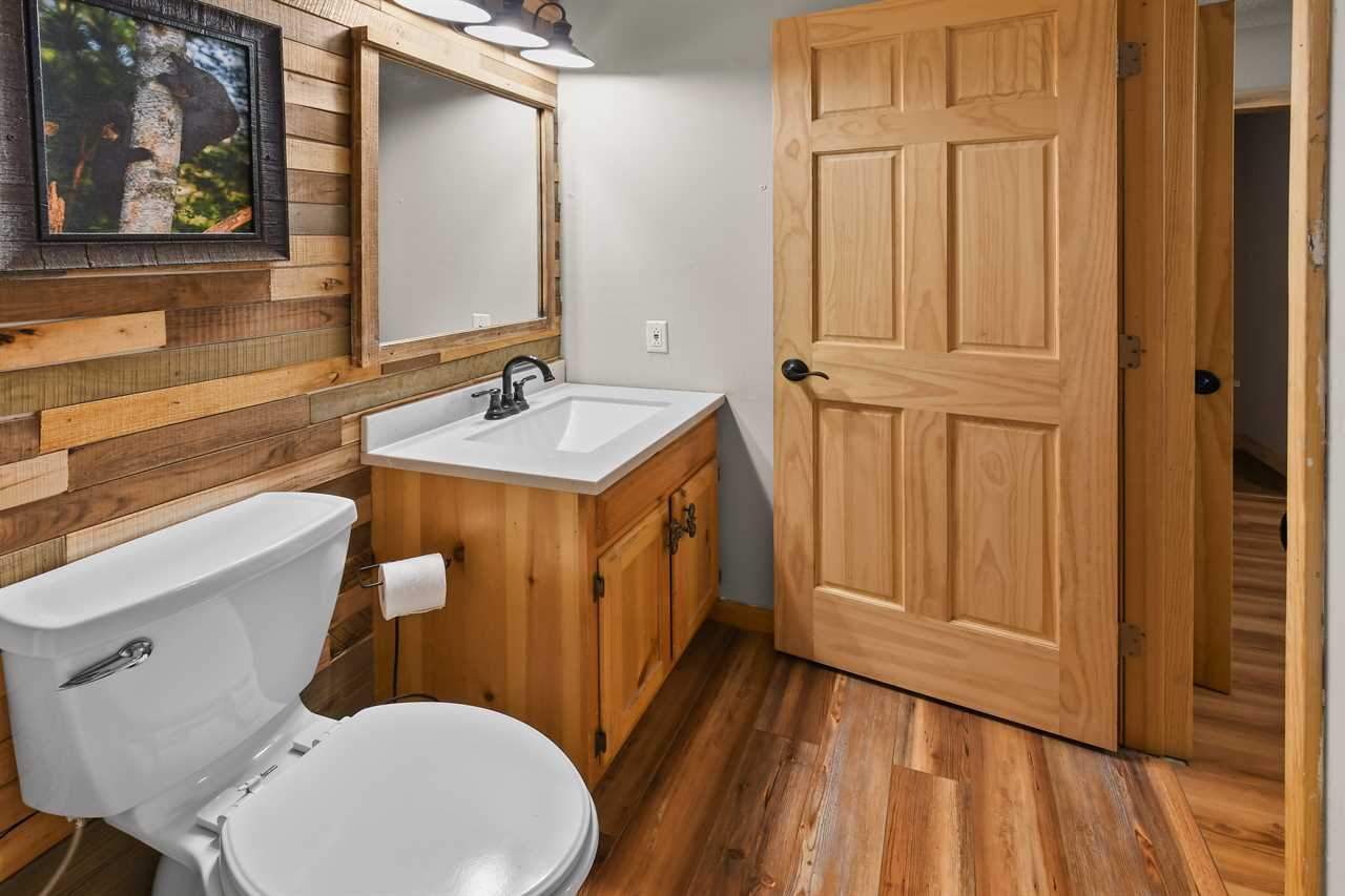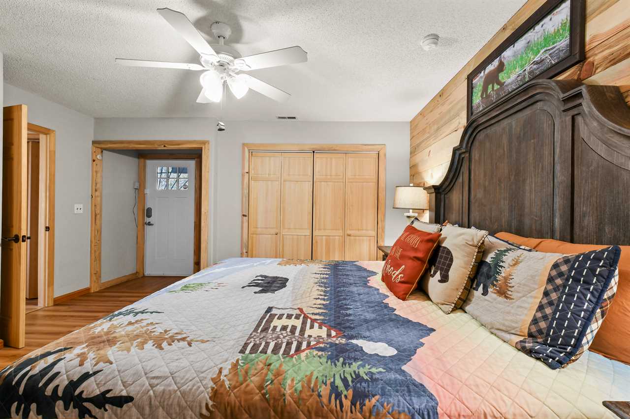 The living room offers a perfect blend of comfort and style. It features an open floor plan accentuated by large windows that fill the space with natural lighting. The modern decor sets a chic tone, complemented by a cozy sofa sleeper for extra accommodations. Two accent chairs provide additional seating, while a flat-screen TV ensures entertainment for all. The wood-burning fireplace adds warmth and charm, creating an inviting atmosphere. Enjoy seamless access to the deck, making it easy to embrace the beauty of nature just outside.