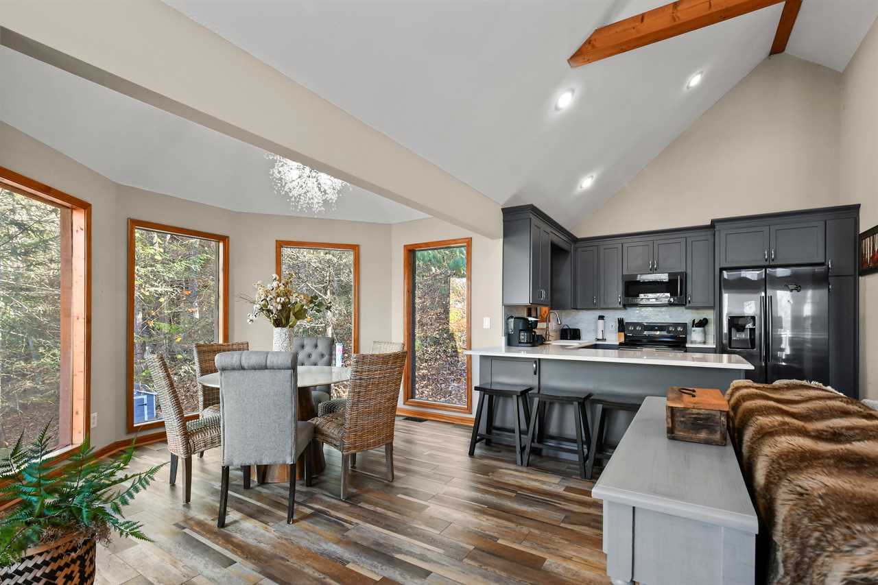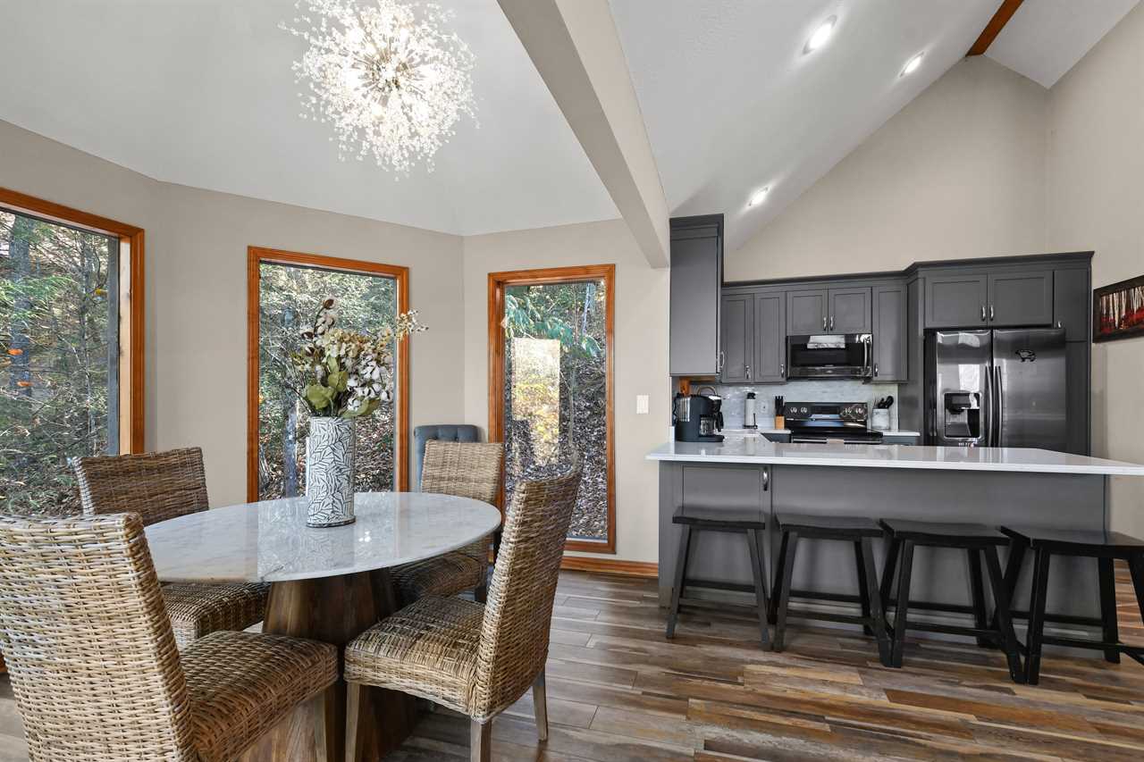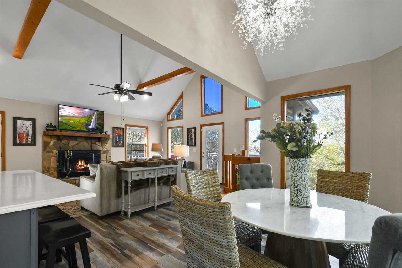 The kitchen and dining room feature an inviting open floor plan that seamlessly connects to the living room, creating a spacious and social environment. The fully equipped kitchen boasts sleek stainless steel appliances, including a stove, refrigerator, microwave, drip coffee maker, and all the dishware and flatware you need for meal prep and dining, making it easy to whip up your favorite dishes. The dining room table comfortably seats 4 to 6, perfect for family meals or game nights, while a stylish bar area with seating for 4 adds to the charm of the space. Large windows allow for plenty of natural light, enhancing the warm and welcoming atmosphere of this beautiful cabin kitchen and dining area.