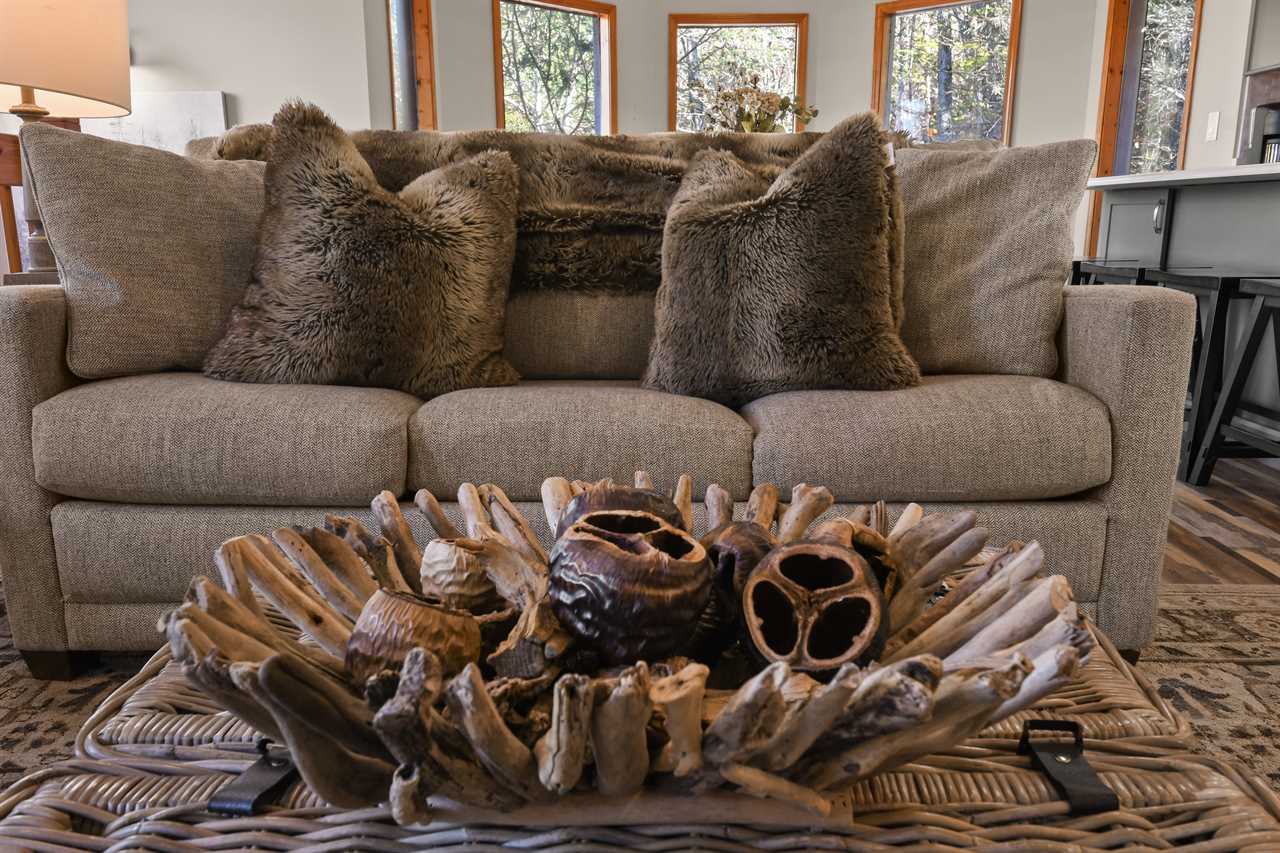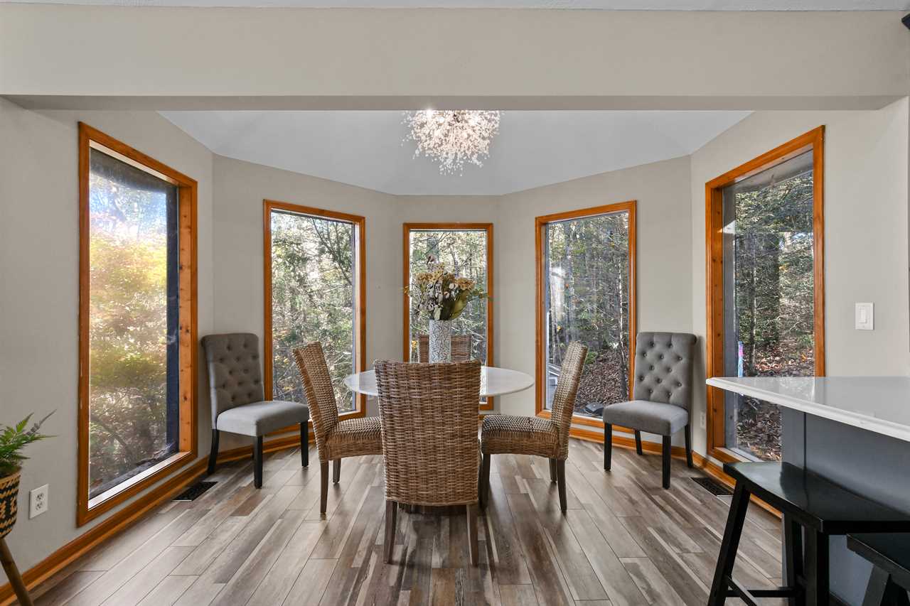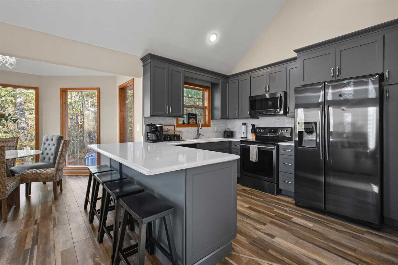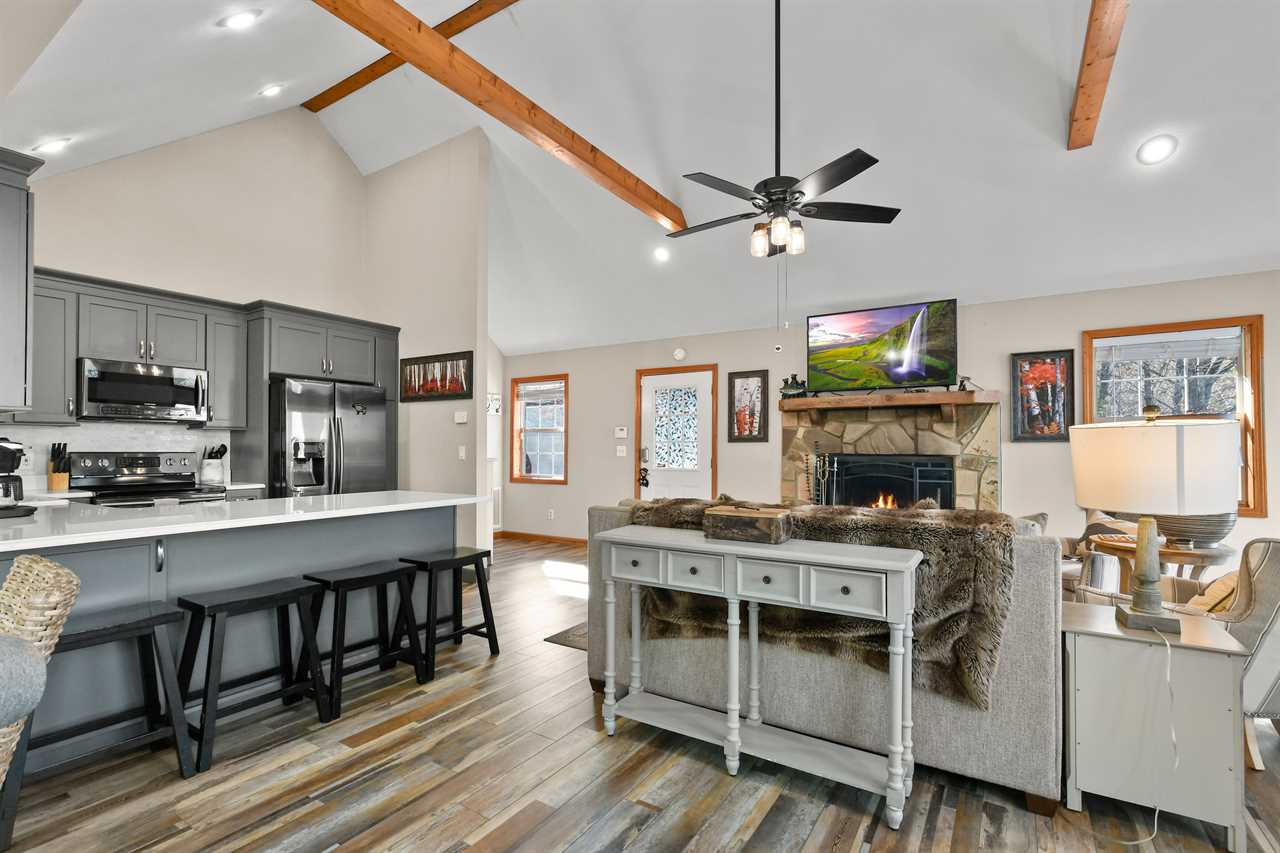 The kitchen and dining room feature an inviting open floor plan that seamlessly connects to the living room, creating a spacious and social environment. The fully equipped kitchen boasts sleek stainless steel appliances, including a stove, refrigerator, microwave, drip coffee maker, and all the dishware and flatware you need for meal prep and dining, making it easy to whip up your favorite dishes. The dining room table comfortably seats 4 to 6, perfect for family meals or game nights, while a stylish bar area with seating for 4 adds to the charm of the space. Large windows allow for plenty of natural light, enhancing the warm and welcoming atmosphere of this beautiful cabin kitchen and dining area.