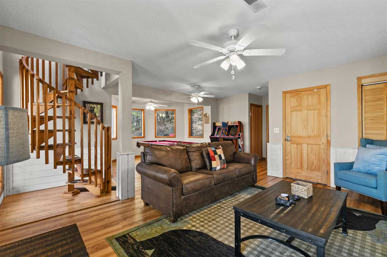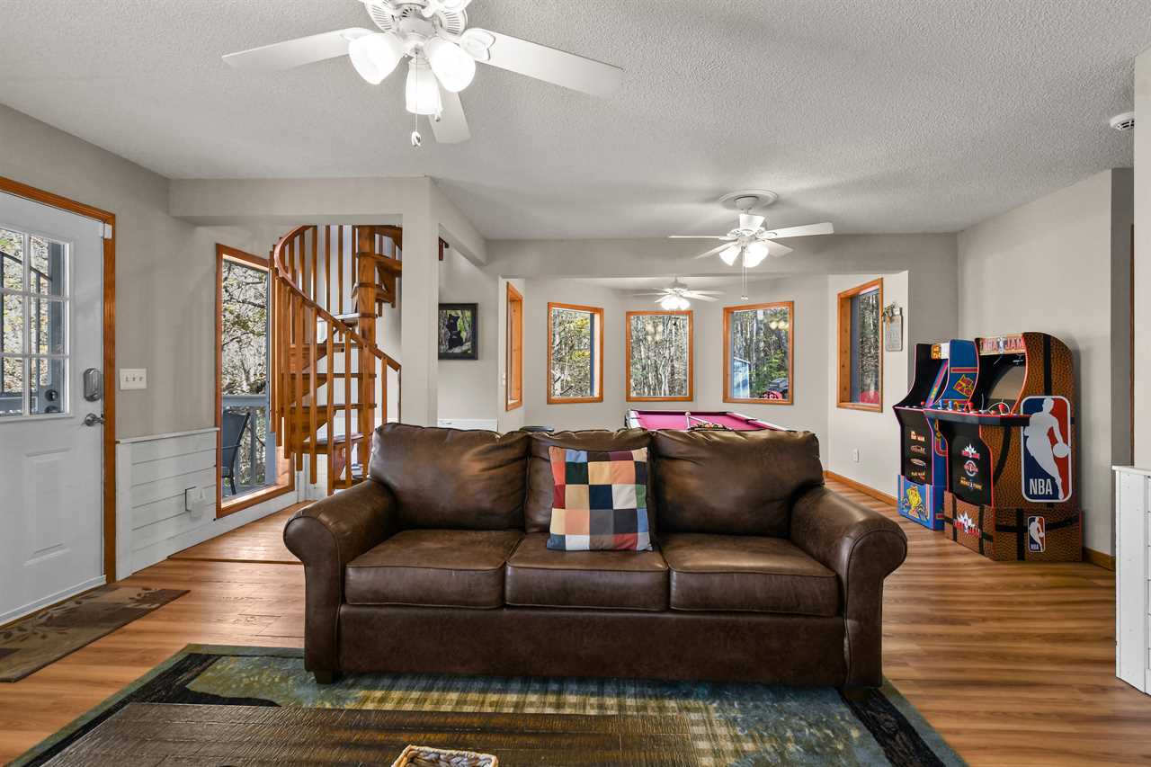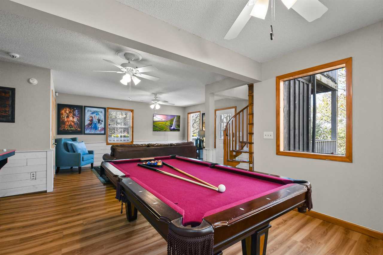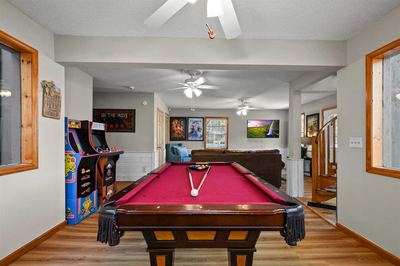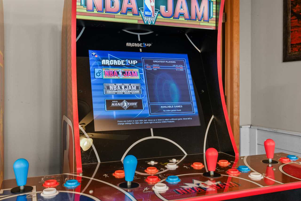 The game room, conveniently located on the first floor, is the perfect spot for fun and relaxation. With modern decor and large windows that let in plenty of natural light, this lively space features a comfortable sofa sleeper for extra accommodations. Enjoy friendly competition with a classic pool table and relive nostalgic moments on the arcade games, including Pac-Man and NBA Jam. The flat-screen TV provides the opportunity to watch your favorite shows and movies. Whether you're winding down after a day of adventure or looking for entertainment, this game room offers all guests a great blend of leisure and social gatherings.