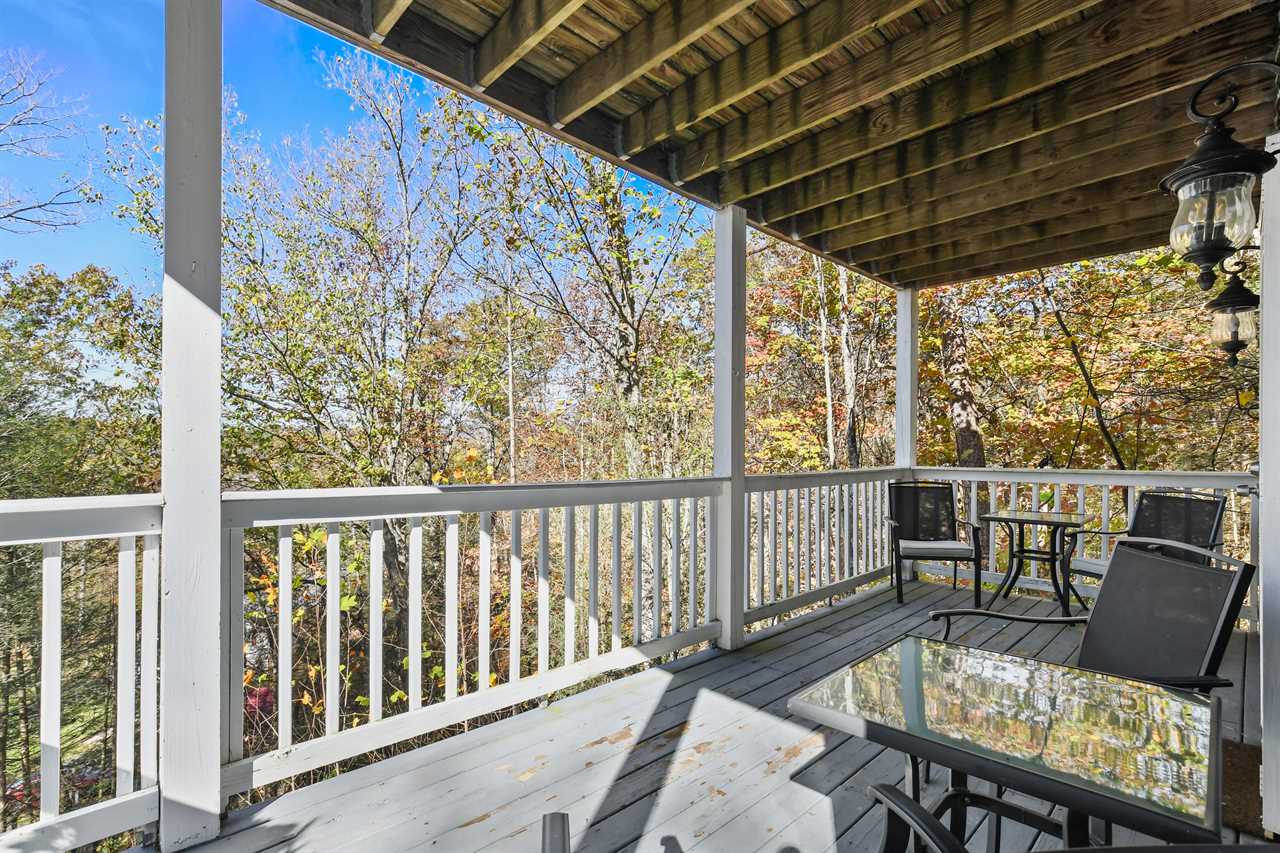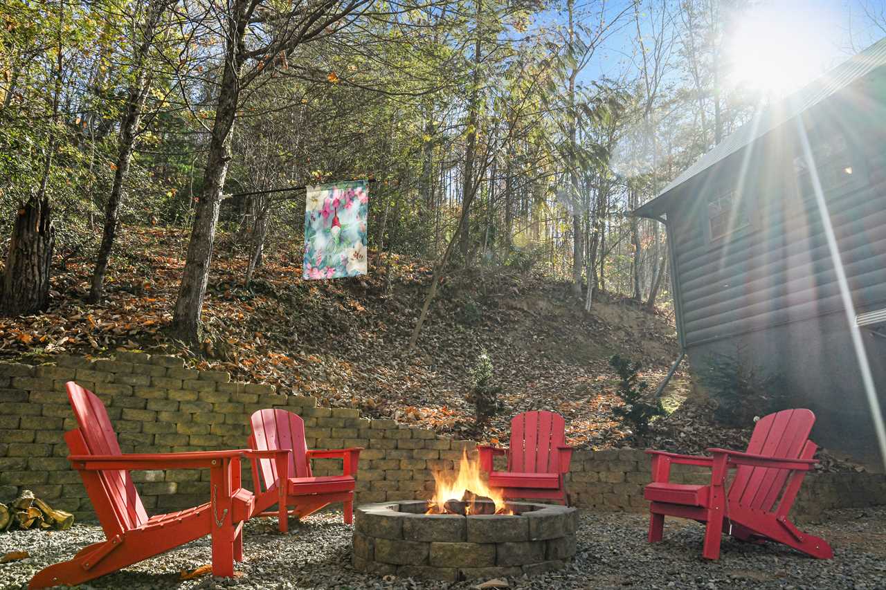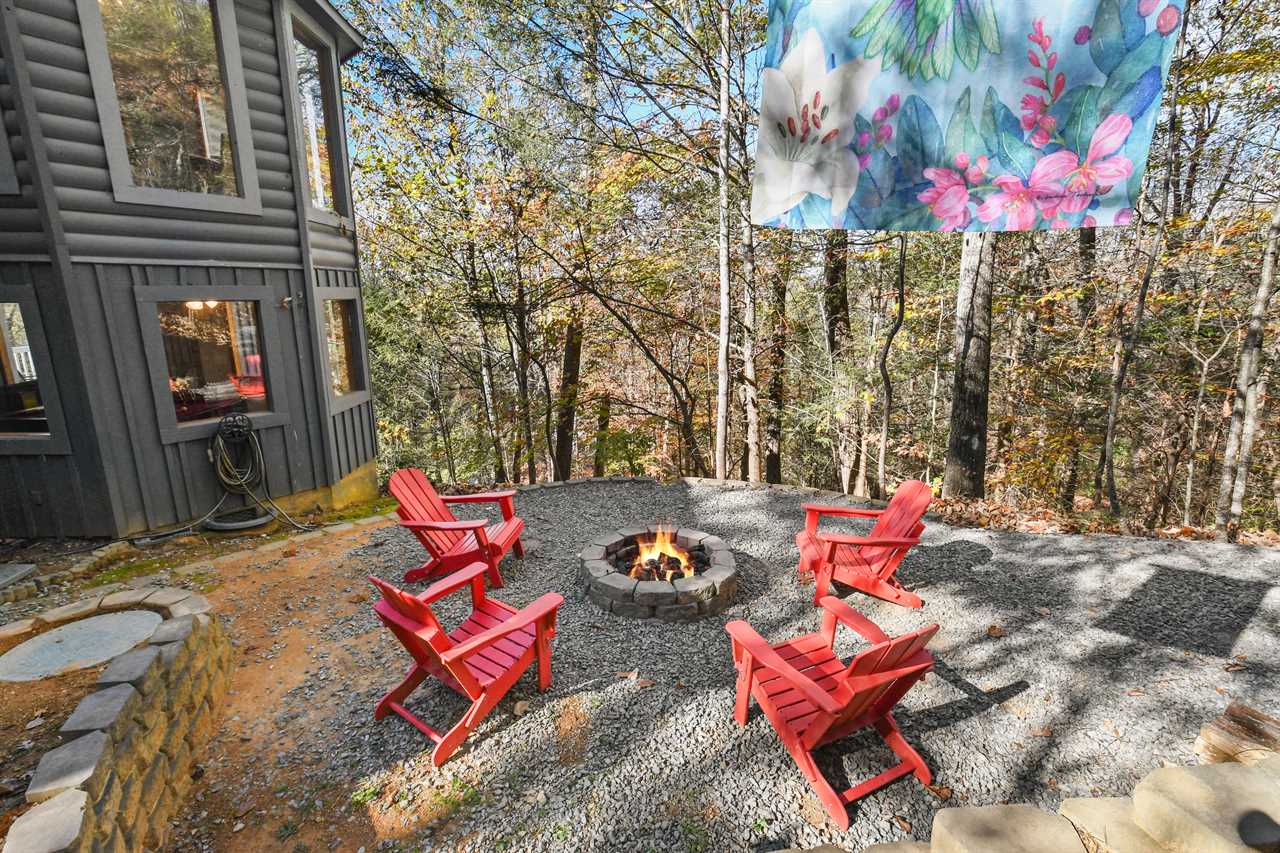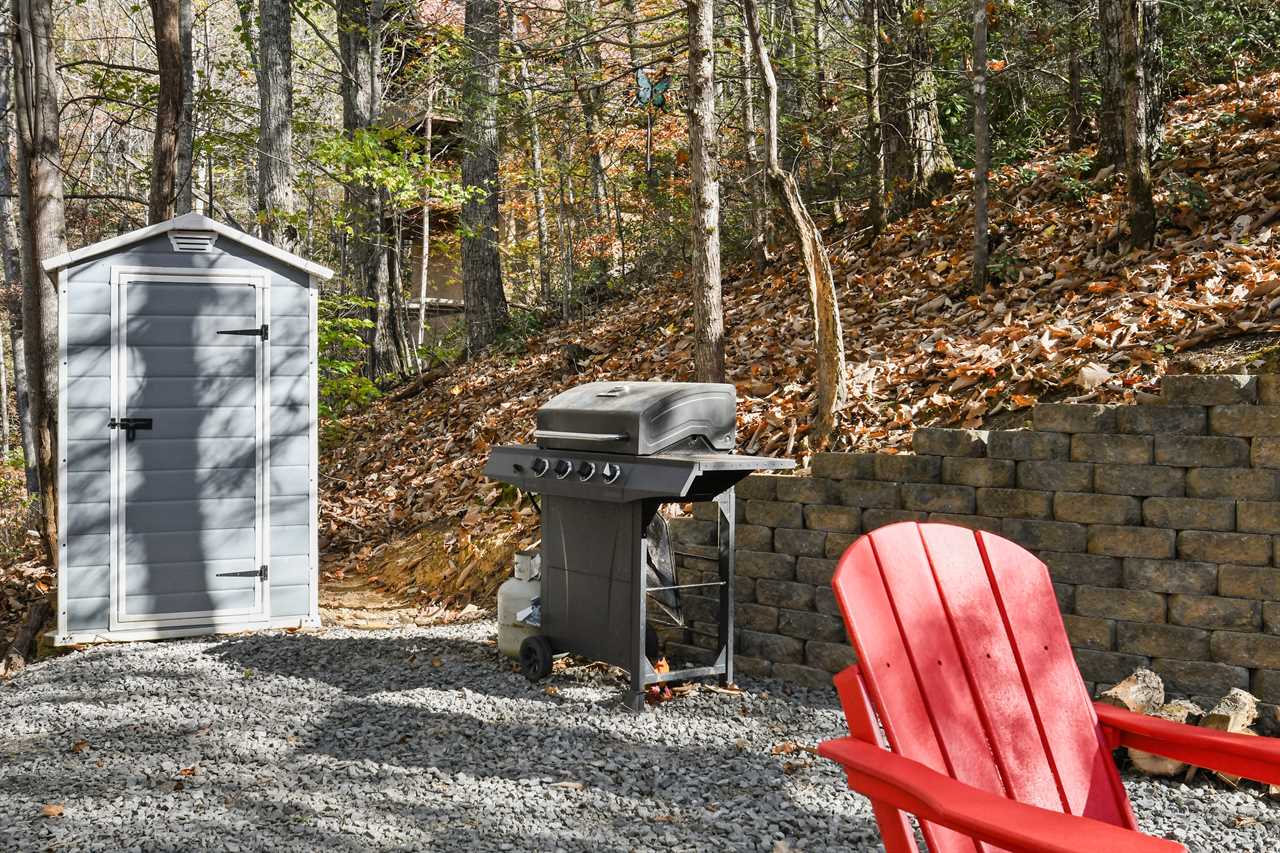 The outdoor space is a serene retreat, offering seclusion and stunning wooded views that enhance your connection to nature. A cozy fire pit invites you to gather for warm evenings under the stars, while a private yard provides ample space for relaxation and activities. The dining area is perfect for outdoor meals, complemented by comfortable rocking chairs for leisurely moments. A convenient gas grill is available for those who love to cook outdoors. Whether hosting a barbecue or simply soaking in the tranquil surroundings, this outdoor oasis is an excellent extension of the cabin experience.
