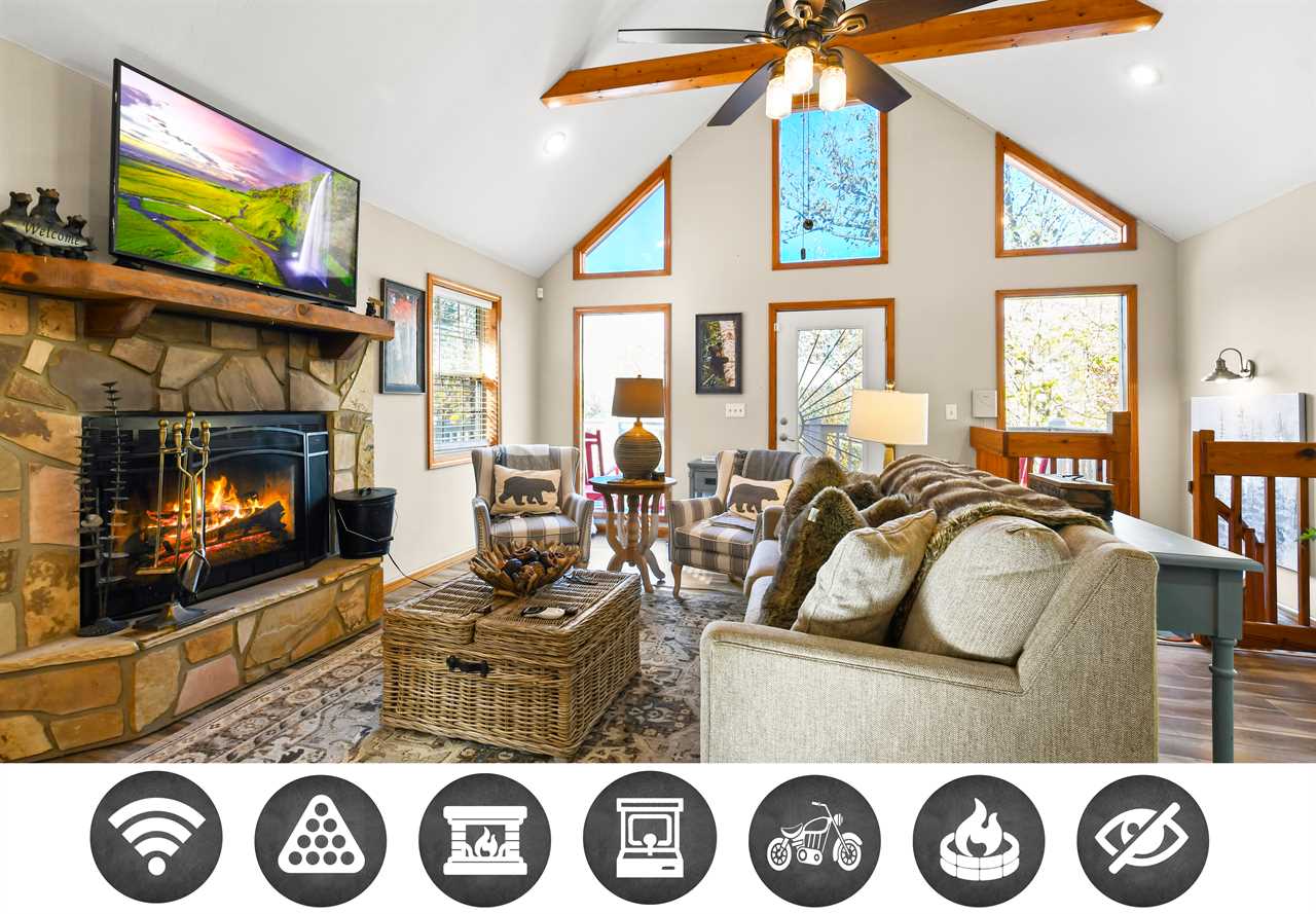 Looking for a serene getaway to the Tennessee mountains? Abby's Hillside Happiness is a cozy 2-bedroom, 2-bathroom retreat that is the perfect answer! Comfortably sleeping up to 8 guests, this stunning getaway features a welcoming wood-burning fireplace, creating a warm and inviting atmosphere. The spacious game room offers endless entertainment, while the expansive 2-tier deck provides breathtaking views and a peaceful space to unwind. Enjoy roasting marshmallows around the fire pit. With convenient Wi-Fi, you can stay connected, unplug, and enjoy the tranquil surroundings. Venture out for a day of adventure at Dollywood or hike the picturesque Laurel Falls Trail; both are just 12 miles away. After your explorations, gather for a round of pool in the game room or kick back and relax as you soak in the quiet beauty of the Smoky Mountains. Your ultimate escape awaits!