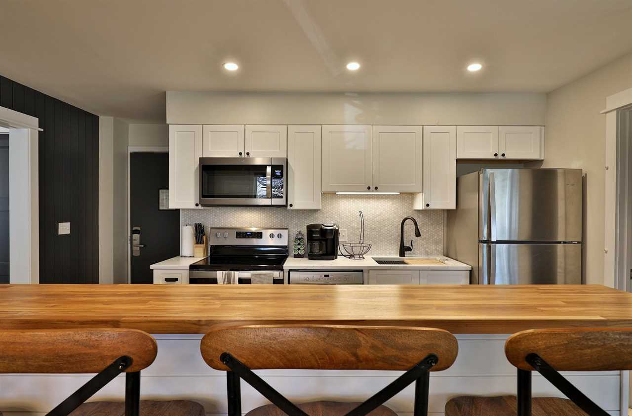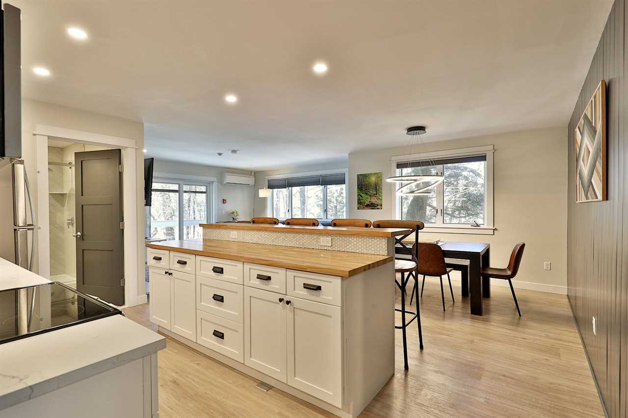 The open-concept kitchen is equipped with modern appliances, a kitchen island, and a dining table, perfect for preparing meals and gathering with friends and family. The condo includes high-speed internet, smart TVs, voice assistants, air conditioning, and central heating, ensuring a comfortable stay in any season. Shared washer and dryer facilities are conveniently located in the entryway.