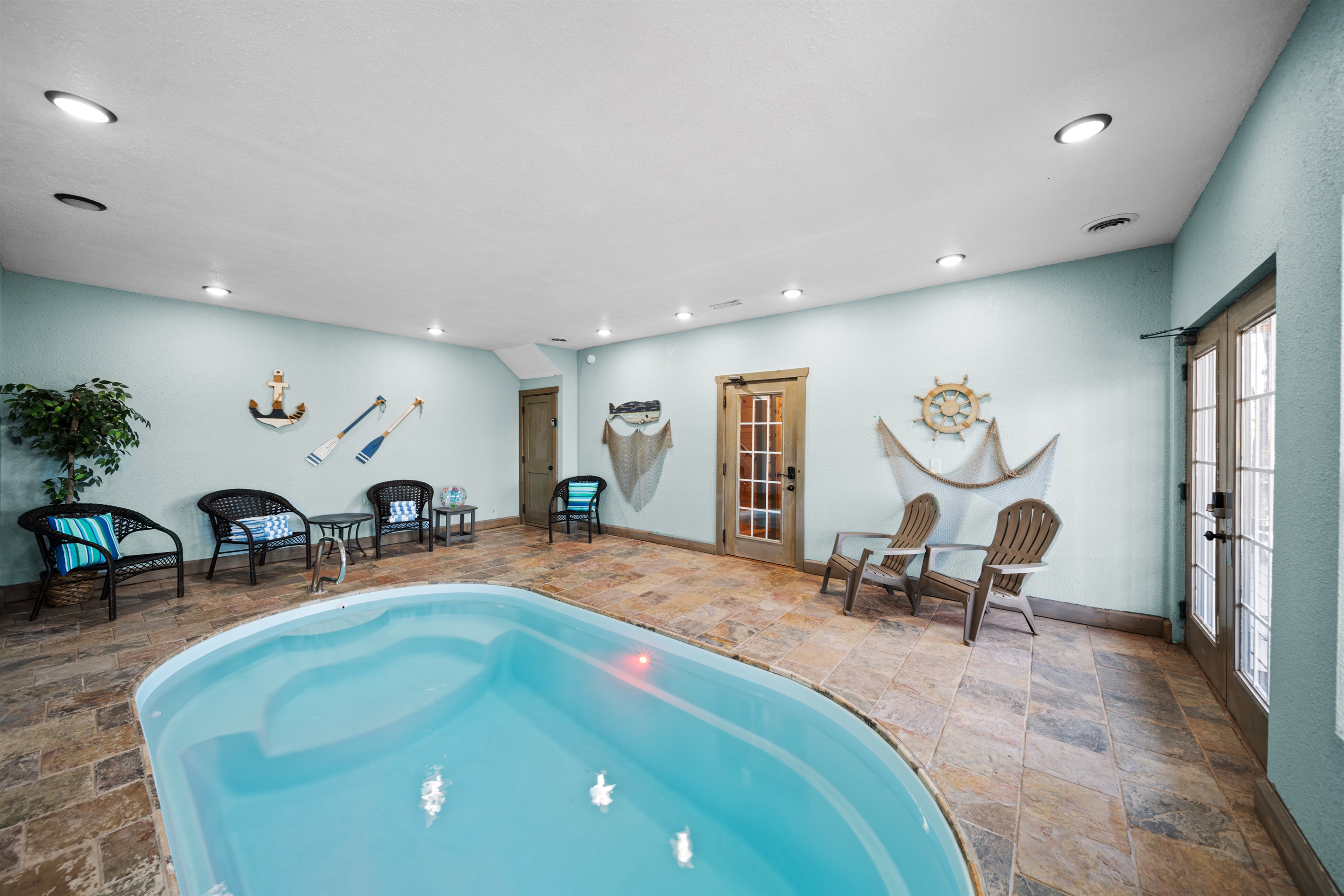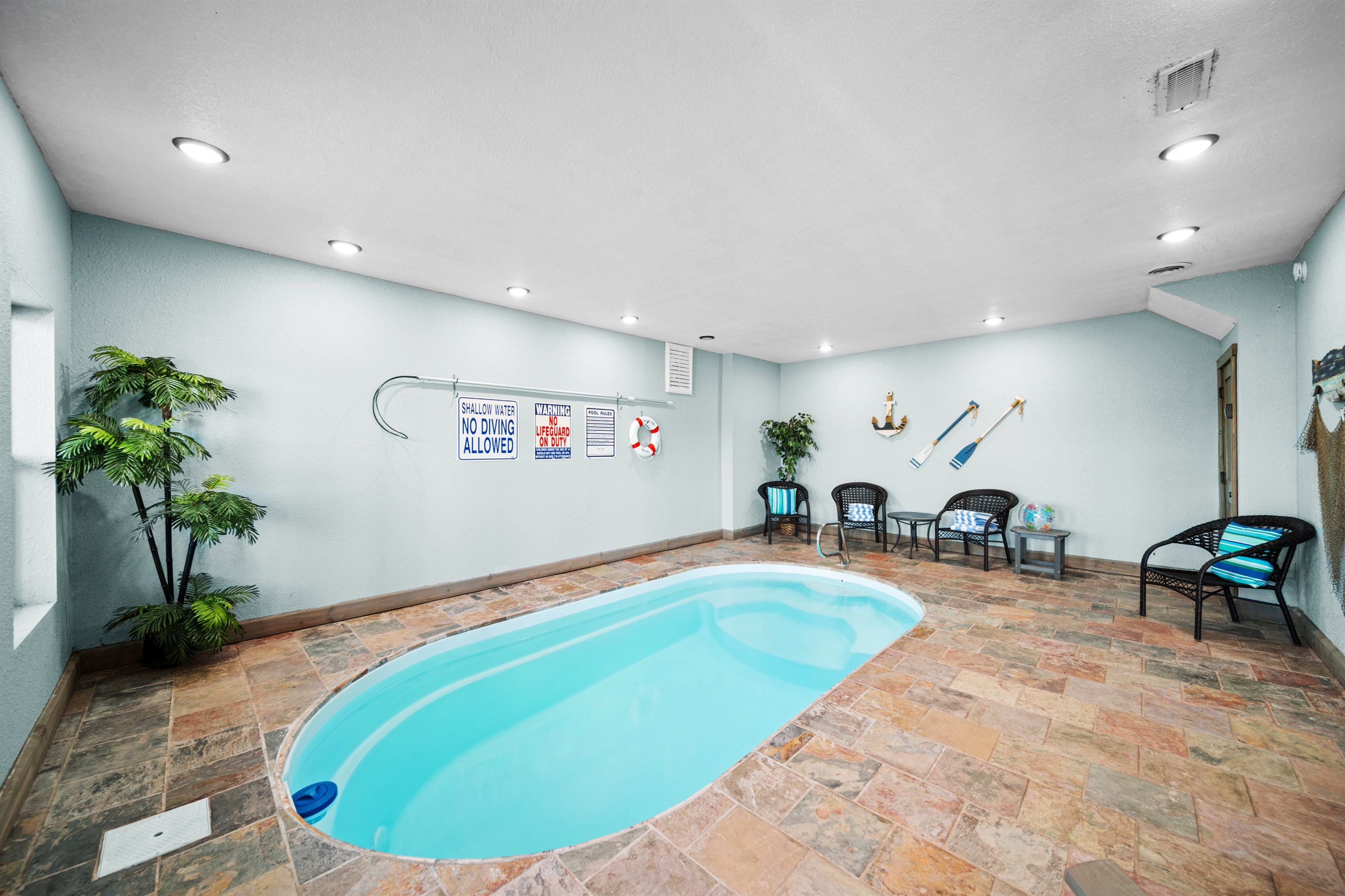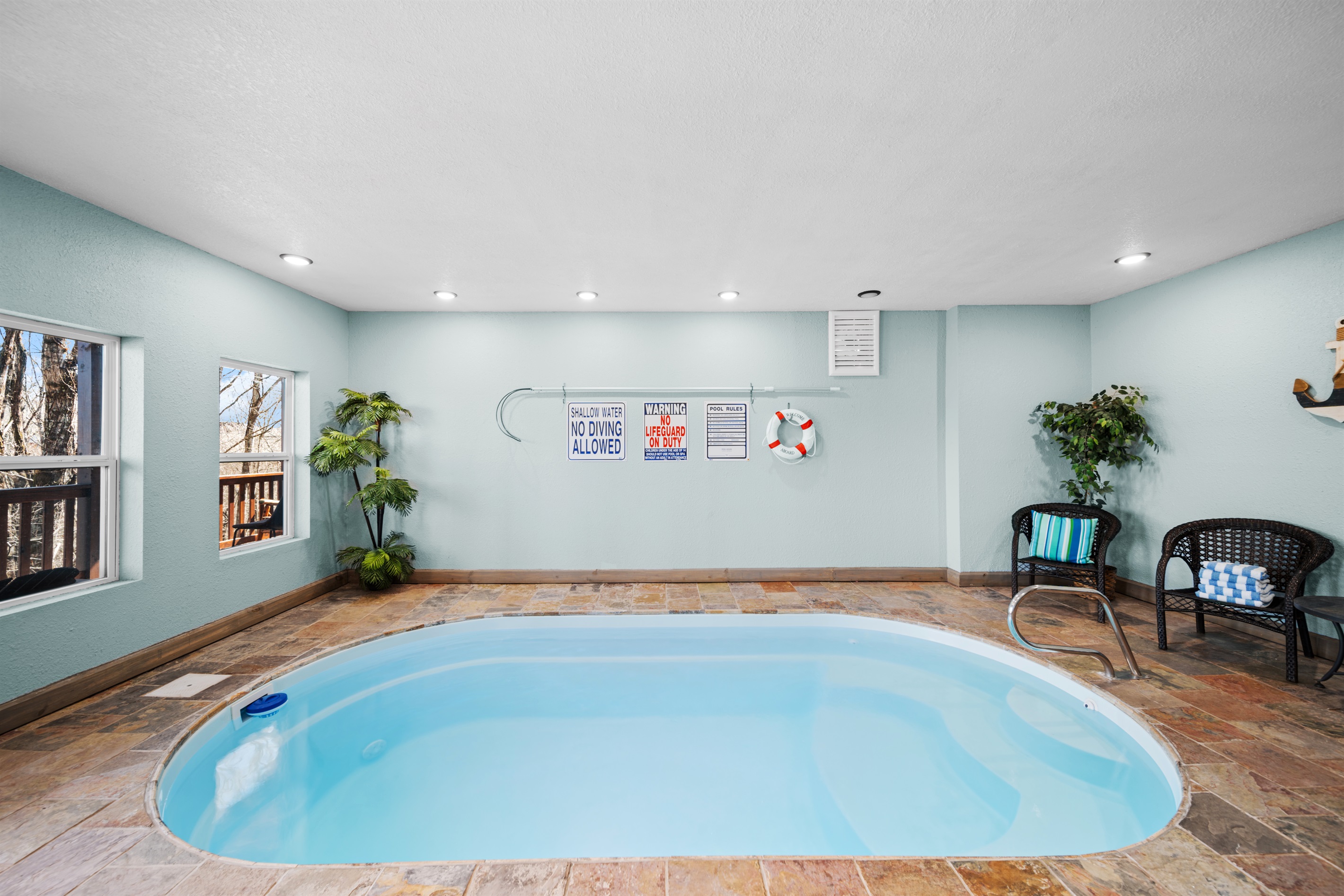 Blue Sky Mountain cabin features an Indoor Heated Pool, Hot Tub, Game room with a billiard table and Arcade games, Theater Room, Fully stocked kitchen & more.