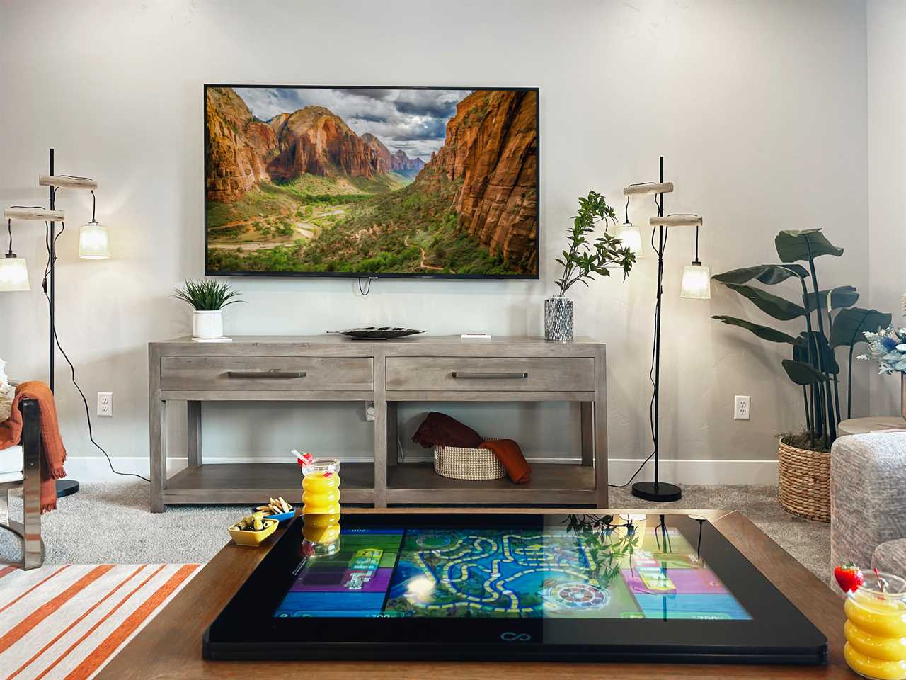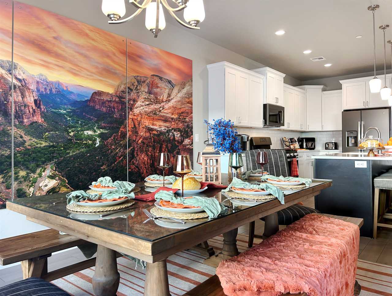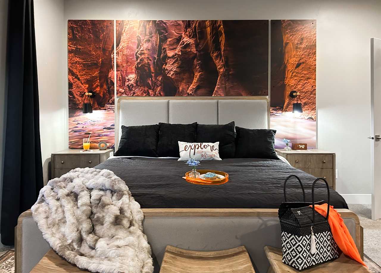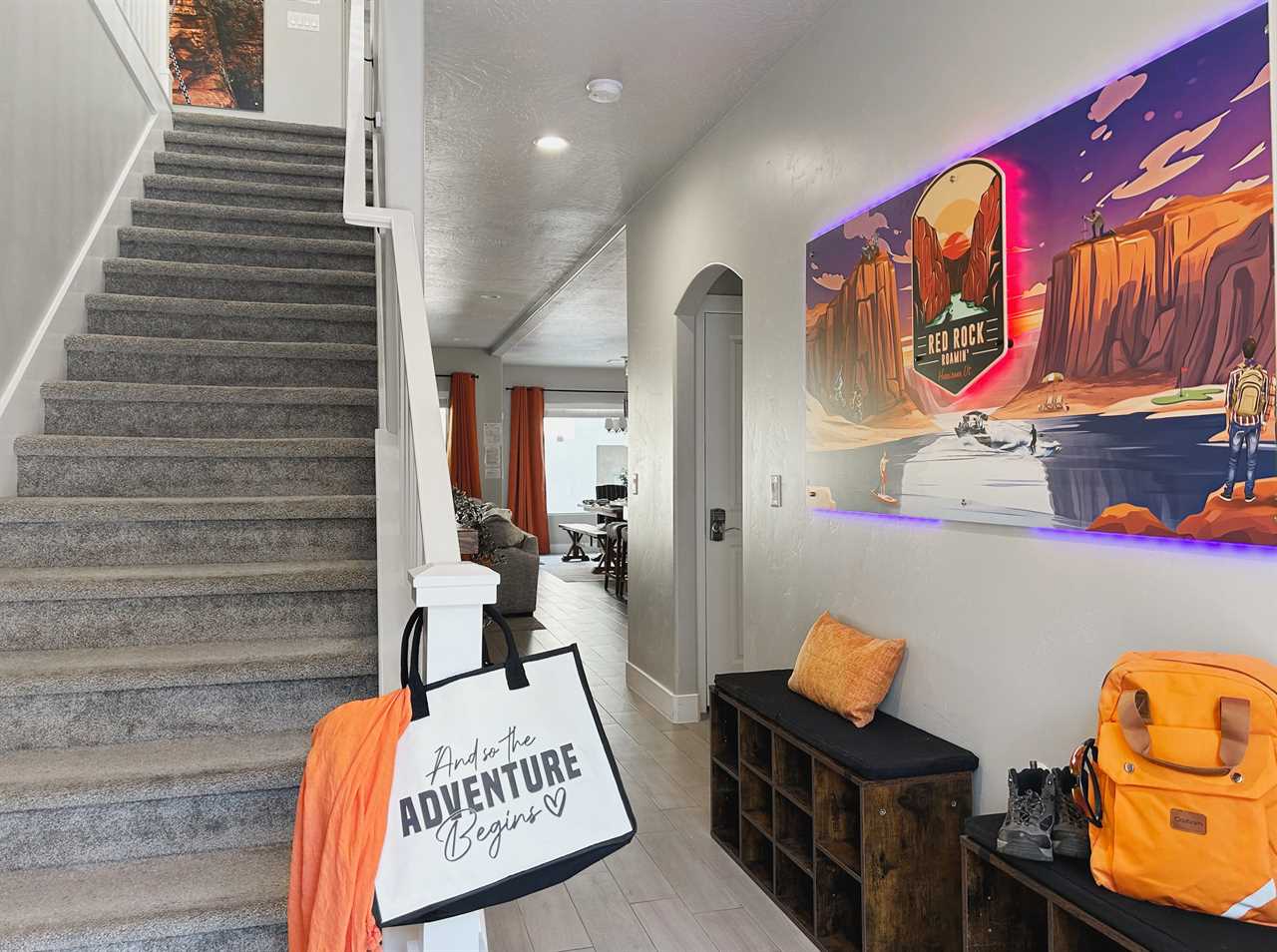 From the moment you step inside, you're greeted by custom artwork celebrating the region's stunning landscapes. The "Adventure Begins" welcome sign sets the tone for your stay, while the statement wall murals with LED-light features throughout the home bring the magnificent red rock country indoors.